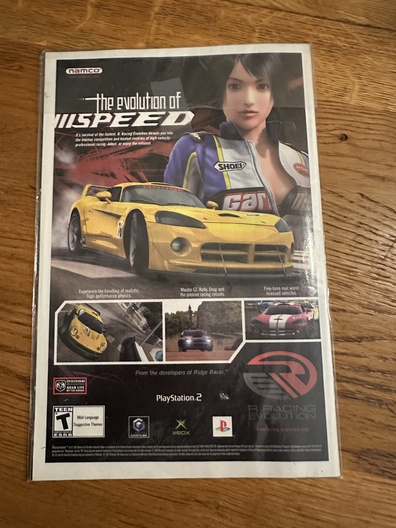 Achterzijde bevat een advertentie voor The Evolution of Speed (Namco) voor PlayStation 2.