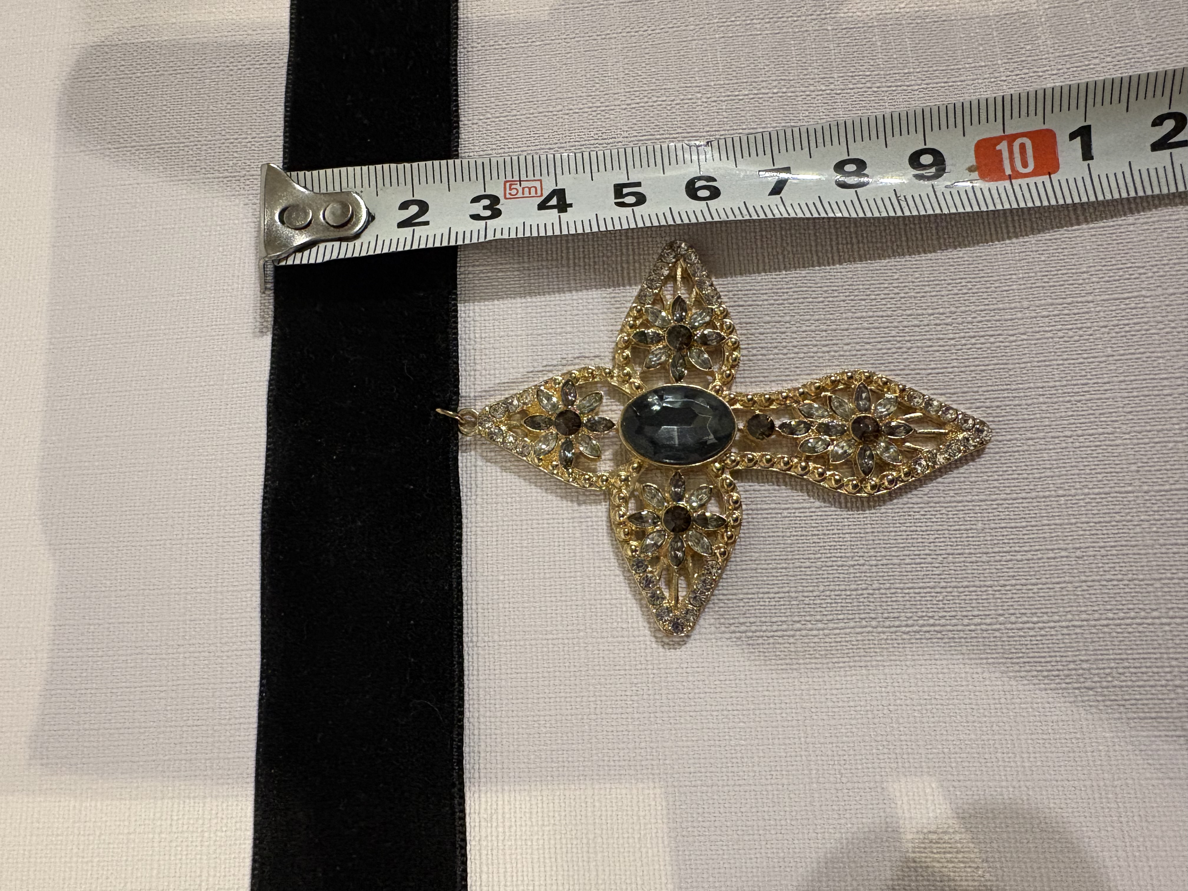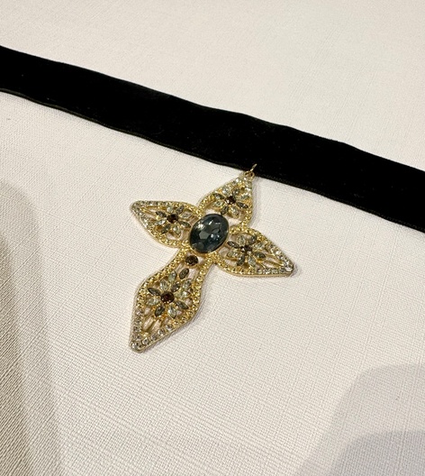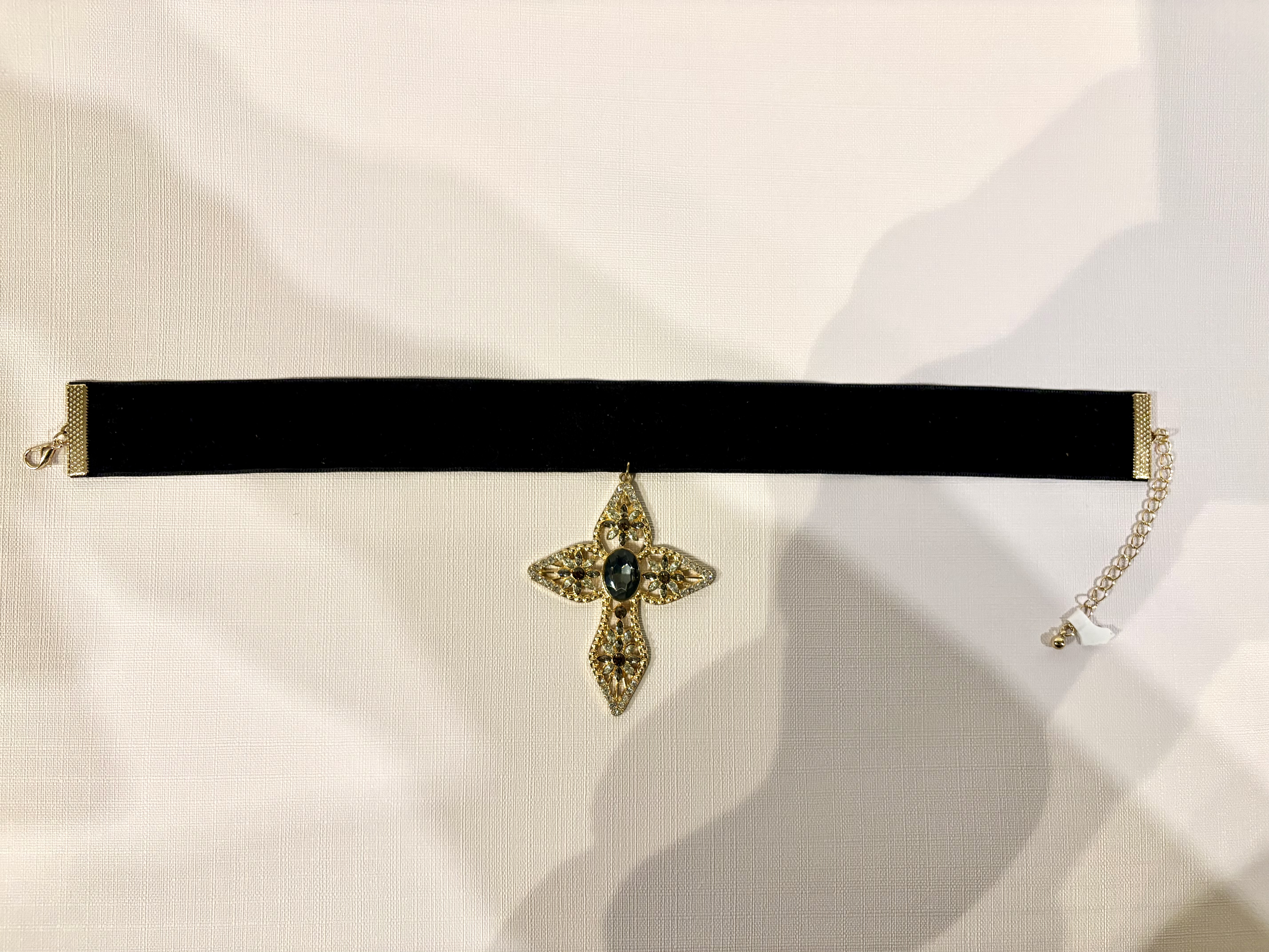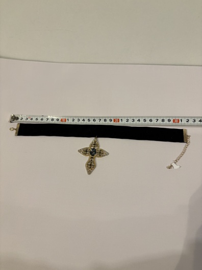 Een zwarte fluwelen choker met een versierde kruis