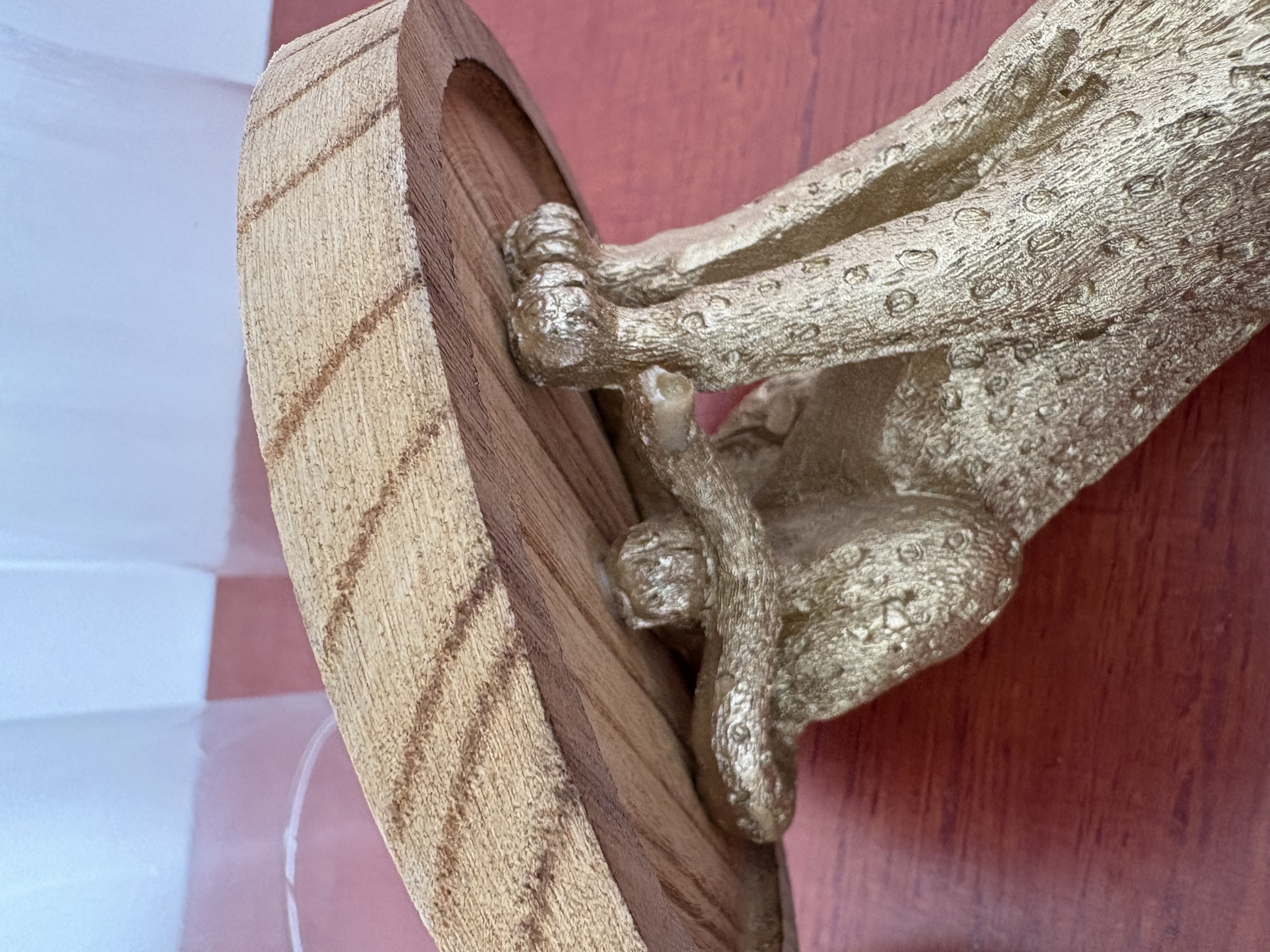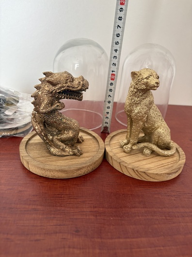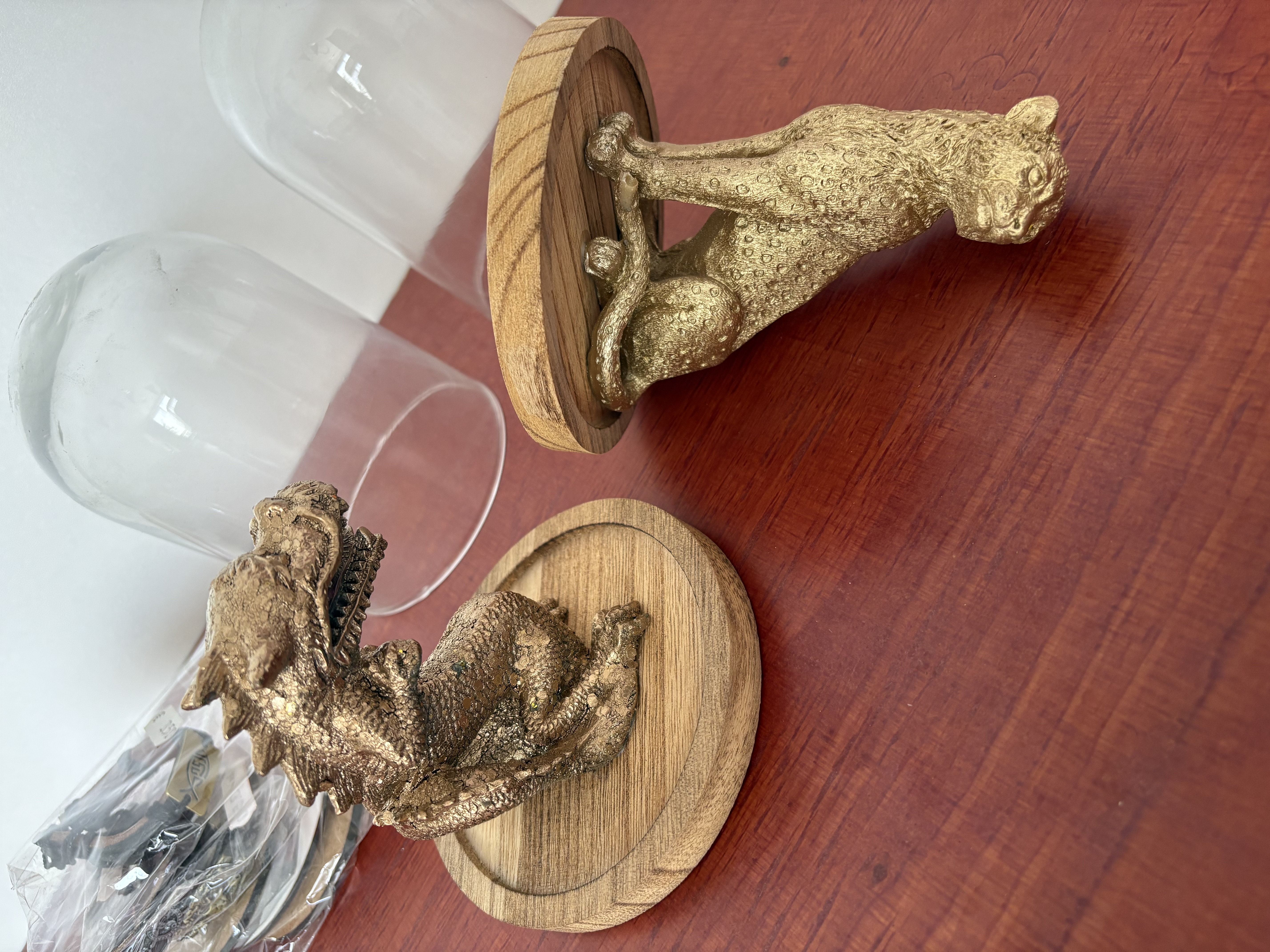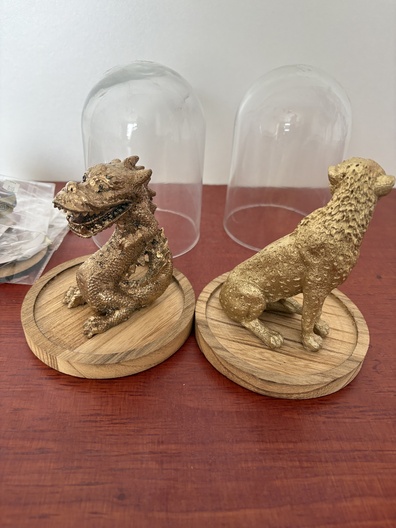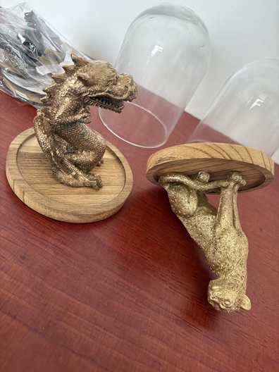 Stolpen met beelden, armbanden en houtwerk