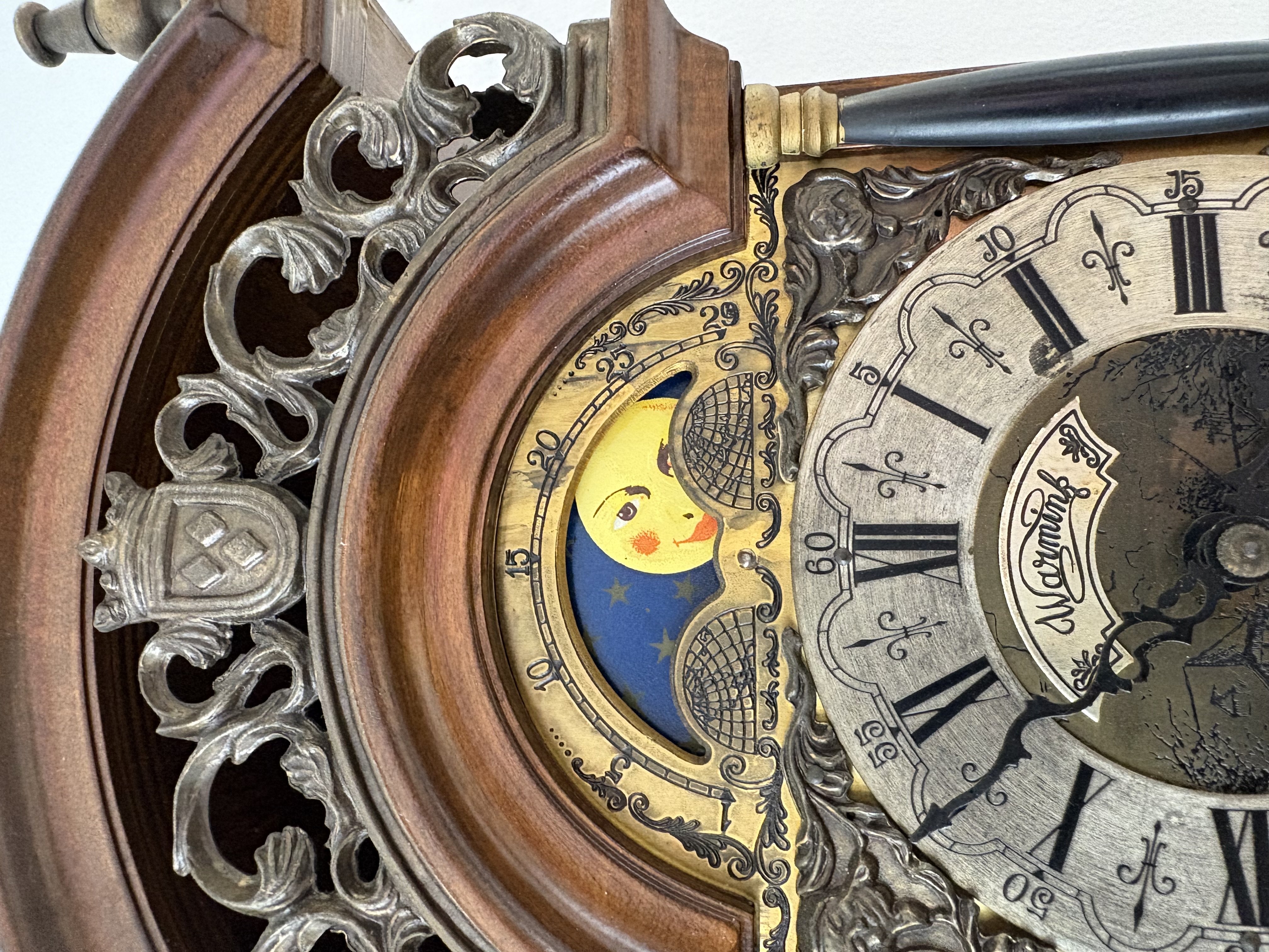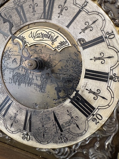 Klok is afkomstig van een klokkenmaker en is werkend gehaald. Hoe voorzichtig het ook is verplaatst kunnen we geen garantie geven (correcte werking).