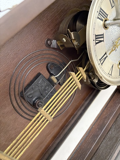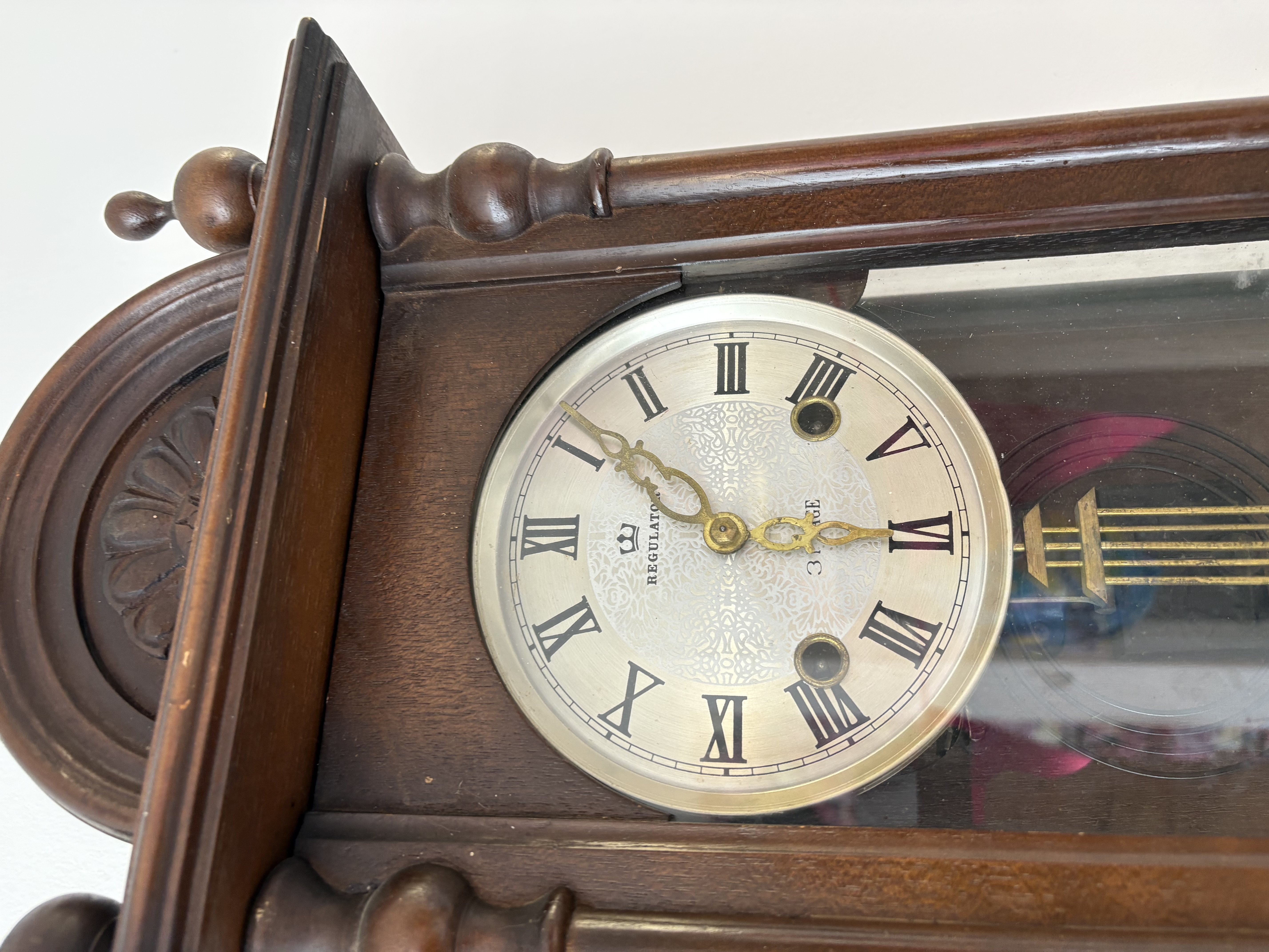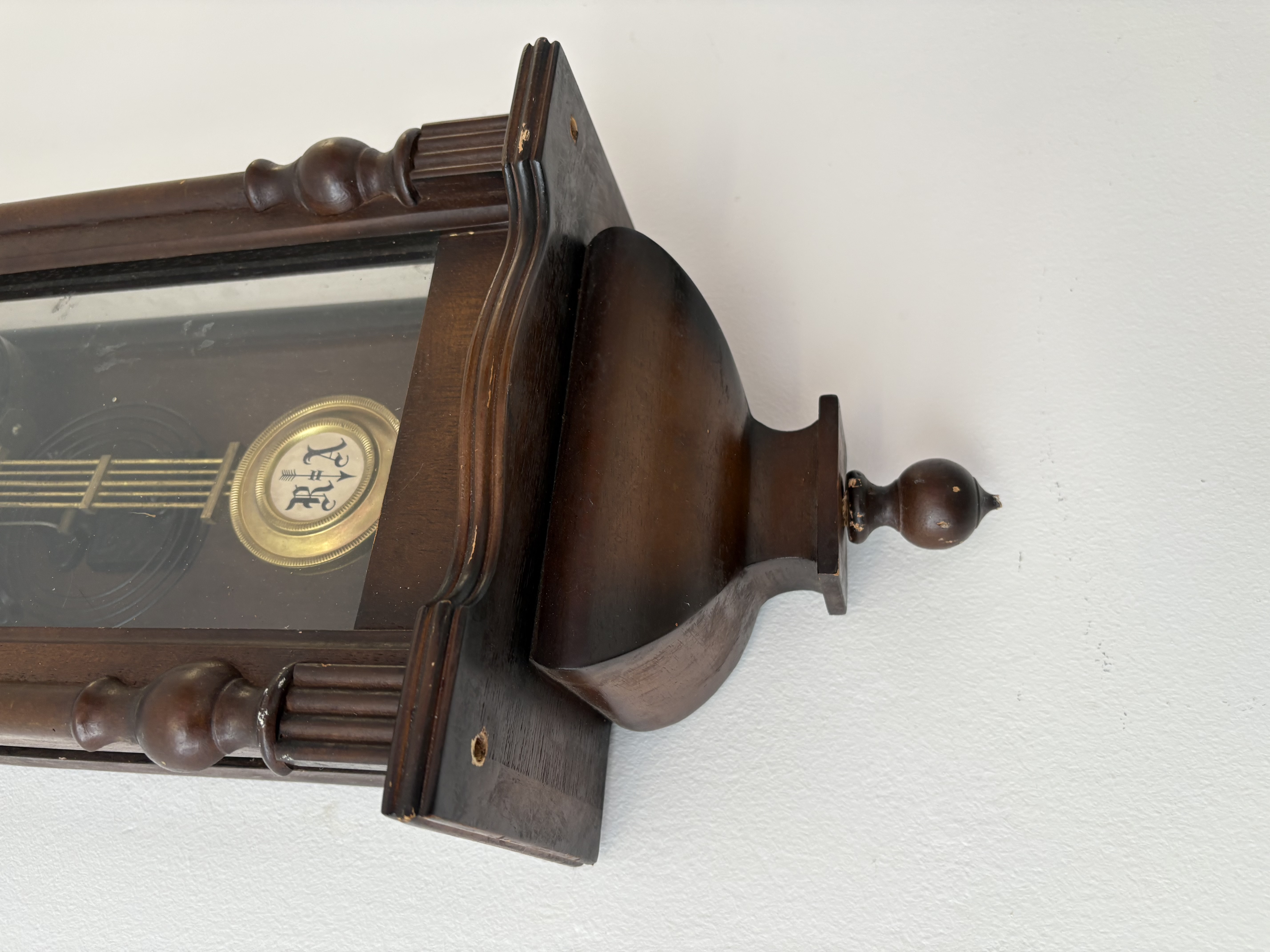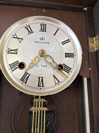 Klok is afkomstig van een klokkenmaker en is werkend gehaald. Hoe voorzichtig het ook is verplaatst kunnen we geen garantie geven (correcte werking).