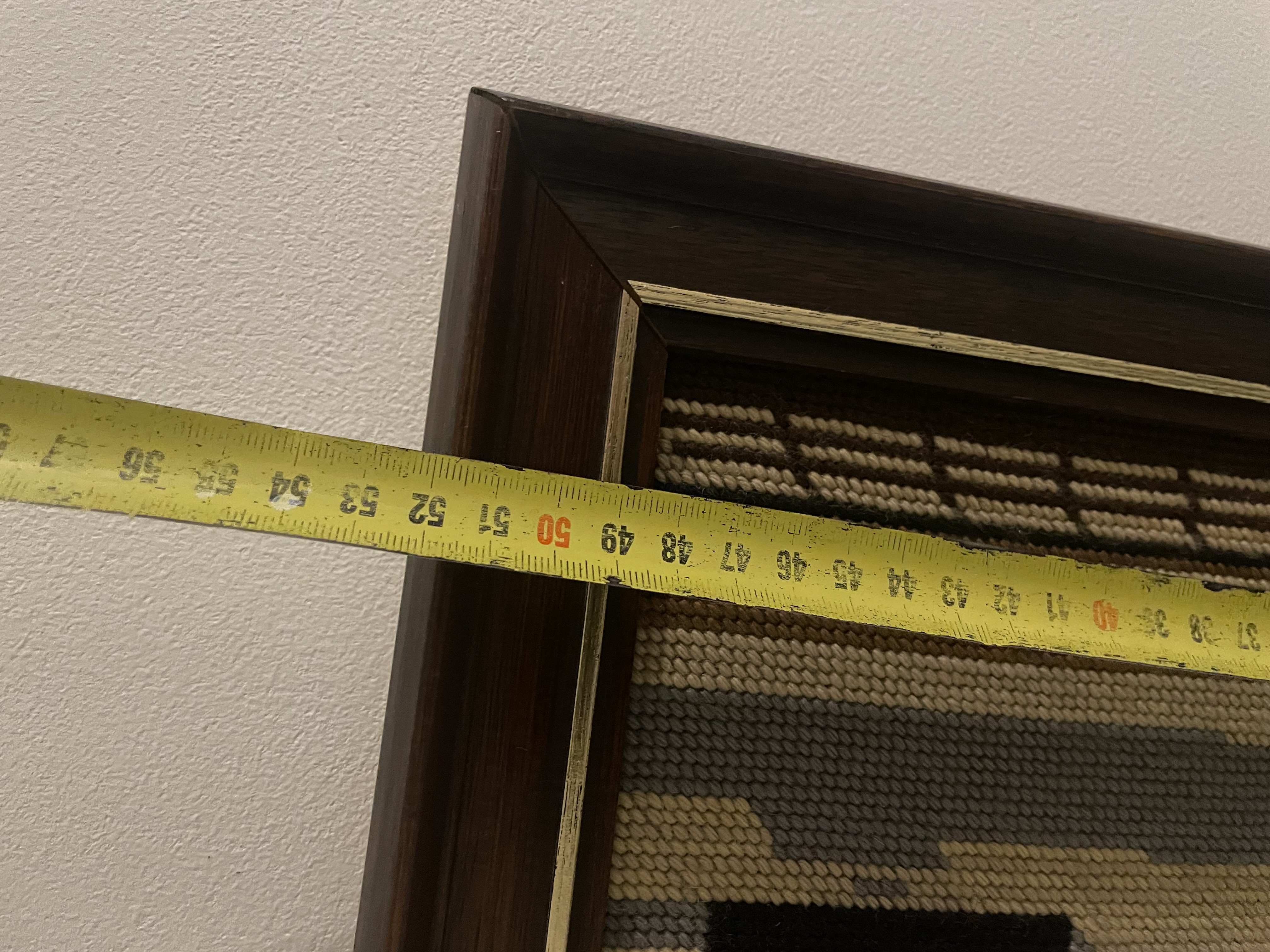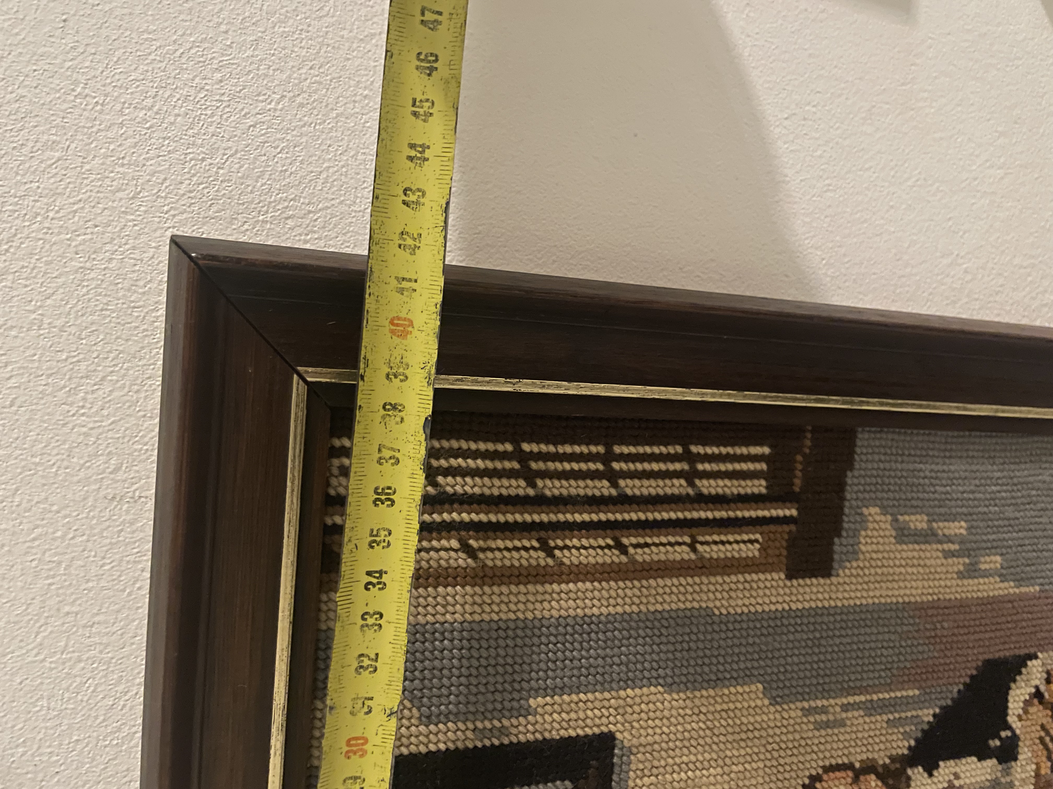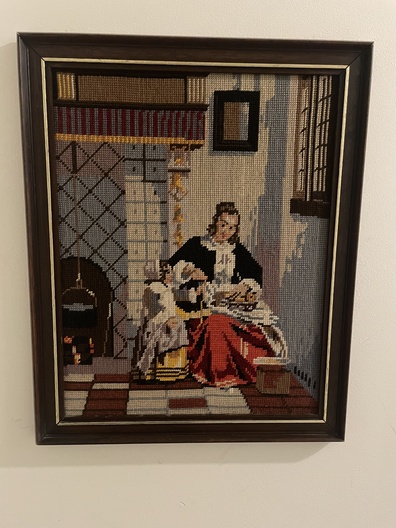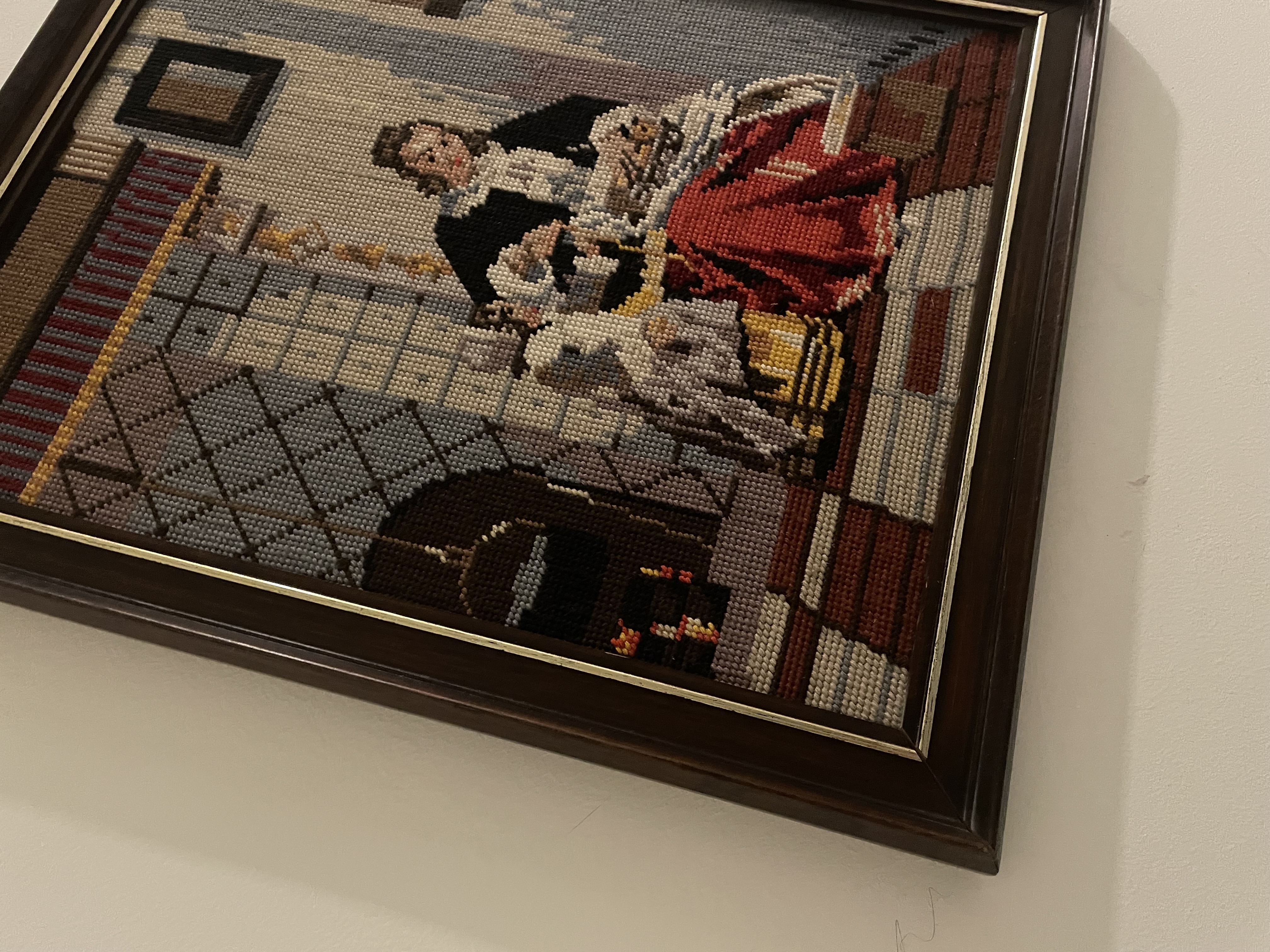 Ingelijst borduurwerk: vrouw met rode rok