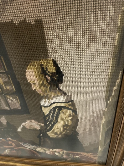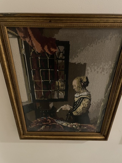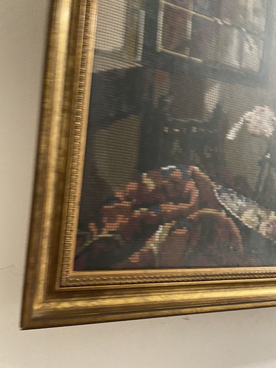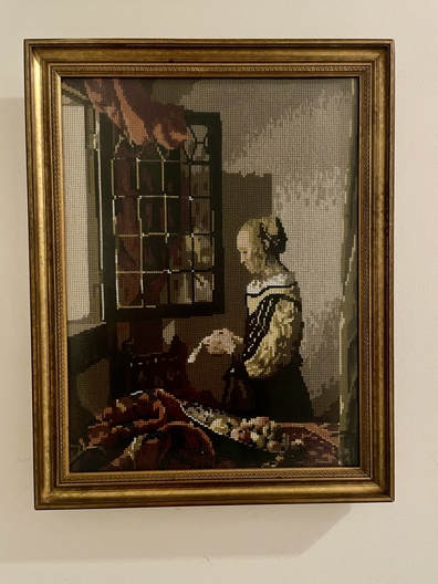 Naaldkunst naar schildrij van Vermeer, Lezende vrouw Art Gallery Amsterdam