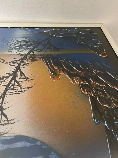 Gebruikte techniek: vermoedelijk airbrush of spuitbussen, maar er lijkt ook te worden gespat en geborsteld, en er werd op sommige plaatsen ook verf in nog natte toestand weggehaald om zo de droge verflaag of nog ongeverfde grondlaag eronder te doen tevoorschijn komen / de gebruikte verfsoort(en) hebben we niet kunnen achterhalen.