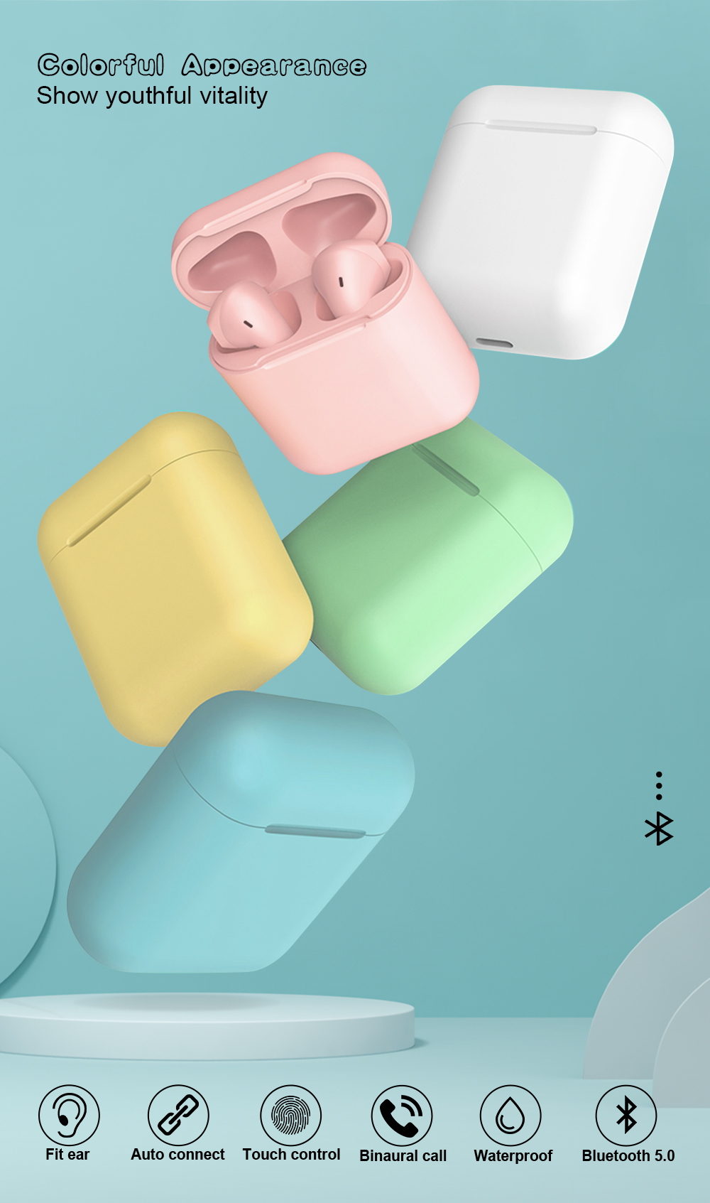 24 ST. J&G IN Ear Pods. BT5.0. Model TWS-i12 met touch control. Diverse kleuren, geel, roze, groen, blauw.