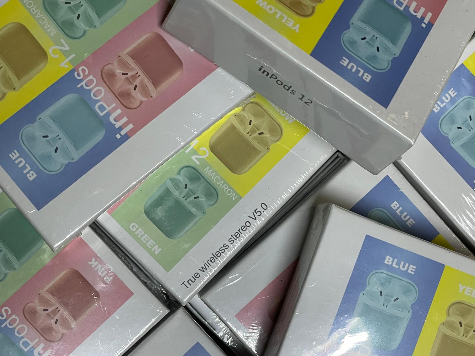 Partij van 24 st. J&G IN Ear Pods. BT5.0. Model TWS-i12 met touch control. Minimaal 4 verschillende kleuren. * 2de Generatie in-Ear Pods-i12. Bluetooth 5,0. Met Touch control. Specificaties: Bereik tot ca. 12 meter, oplaadcapaciteit 300 mAh, afspeeltijd muziek 4 uur, gesprekstijd 3,5 uur.