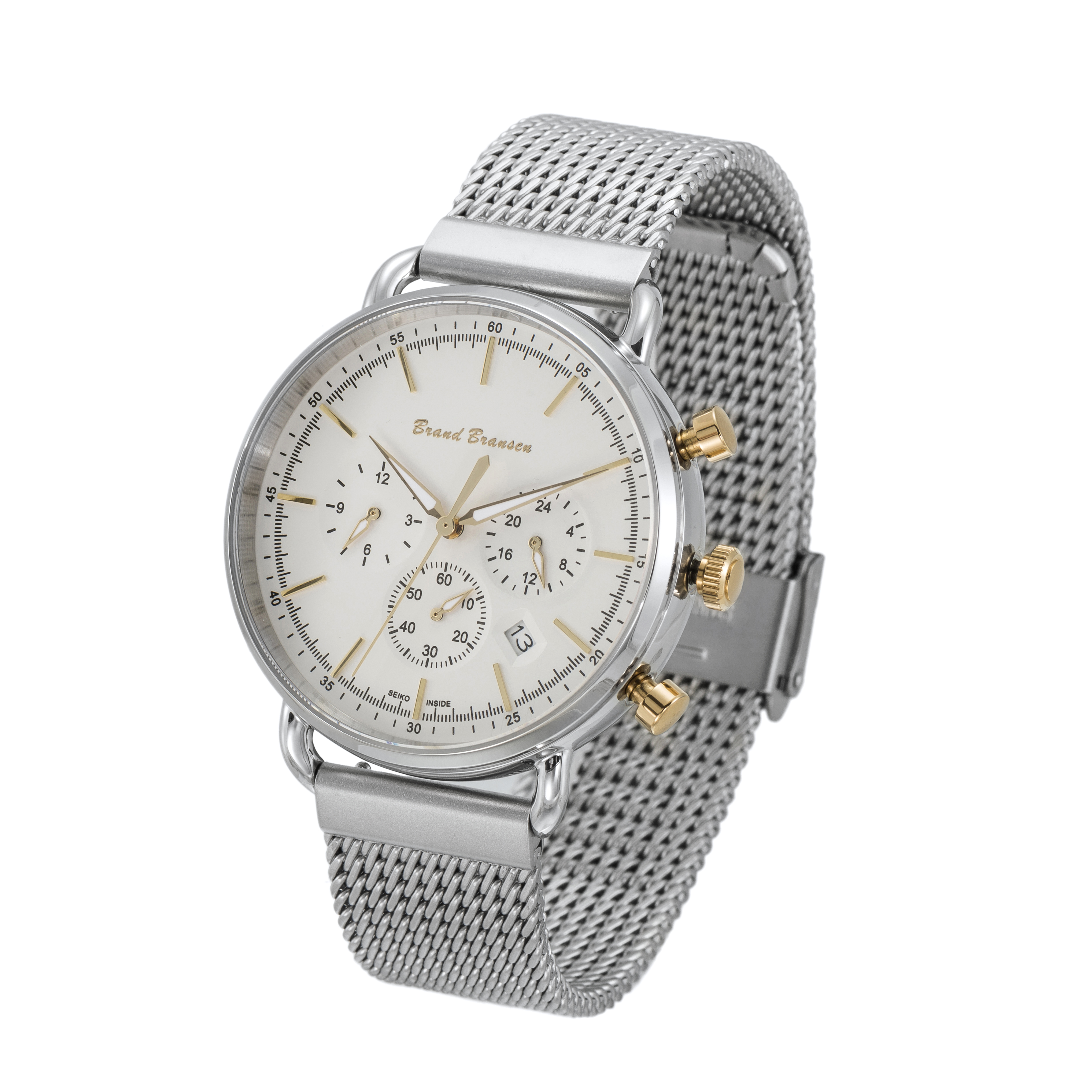 Brand Bransen-Seiko Chronografisch Quartz horloge model: 4804. Dit exclusieve, stijlvolle horloge is RoHS (EU) gecertificeerd. V.v. Saffierglas, VD33 Seiko uurwerk en SR920SW batterij. Kleur: Zilver (mat) met witte wijzerplaat voorzien van goudkleurige tijdaanduiding en goudkleurige knoppen. De horlogekast en horlogeband met clip sluiting zijn vervaardigd van Inox 310. De flexibele horlogeband in combinatie met het geringe gewicht van het horloge, totaalgewicht ca. 95 gr. staat garant voor maximaal draagcomfort. De verwachte levensduur van de batterij is tot 3 jaar. Specificaties; horlogekast, diameter circa 42 mm, dikte circa 9,5 mm. Horlogeband: Totale lengte circa 205 mm, breedte circa 20 mm. De lengte van de horlogeband is met een simpele korte handeling in elke gewenste lengte aan te passen en het horloge past daardoor op elke pols.
