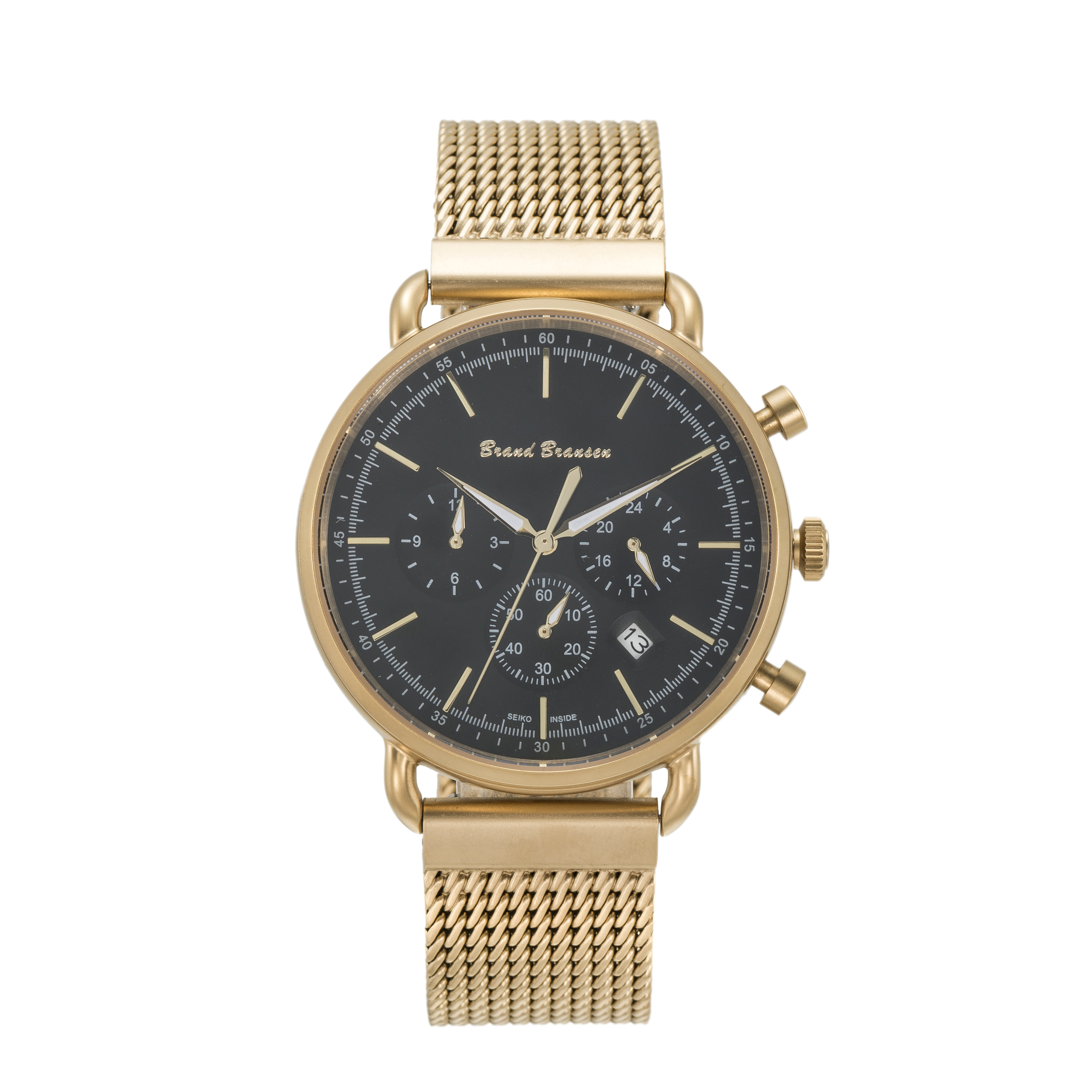 Brand Bransen-Seiko Horloge 4802 * Brand Bransen-Seiko Chronografisch Quartz horloge model: 4802. Dit exclusieve, stijlvolle horloge (beperkte oplage) is RoHS (EU) gecertificeerd. V.v. Saffierglas, VD33 Seiko uurwerk en SR920SW batterij. Kleur: Horlogekast: Goud (mat), horlogeband: mat goud, wijzerplaat: zwart, knoppen: goud, tijdsaanduiding: goud/wit . De horlogekast en horlogeband met clip sluiting zijn vervaardigd van Inox 310. De flexibele horlogeband in combinatie met het geringe gewicht van het horloge, totaalgewicht ca. 95 gram, staat garant voor maximaal draagcomfort. De verwachte levensduur van de batterij is tot 3 jaar.