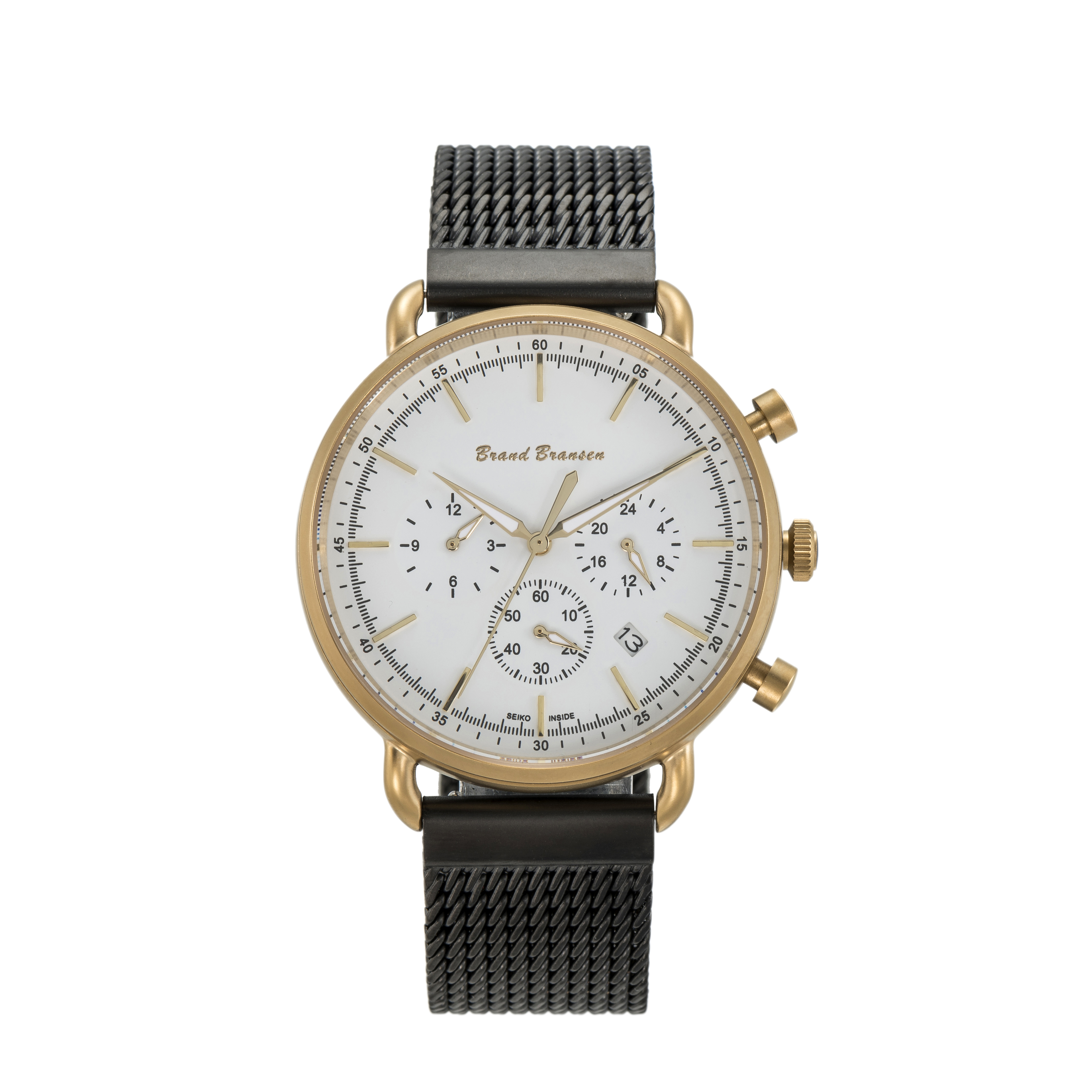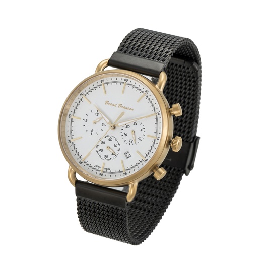 Brand Bransen-Seiko Chronografisch Quartz horloge model: 4807. Dit exclusieve, stijlvolle horloge is RoHS (EU) gecertificeerd. V.v. Saffierglas, VD33 Seiko uurwerk en SR920SW batterij. Kleur: Band; Zwart, horlogekast; Mat-goud met witte wijzerplaat v.v. witkleurige tijdaanduiding en goudkleurige knoppen). De horlogekast en horlogeband met clip sluiting zijn vervaardigd van Inox 310. De flexibele horlogeband in combinatie met het geringe gewicht van het horloge, totaalgewicht ca. 95 gr. staat garant voor maximaal draagcomfort. De verwachte levensduur van de batterij is tot 3 jaar.