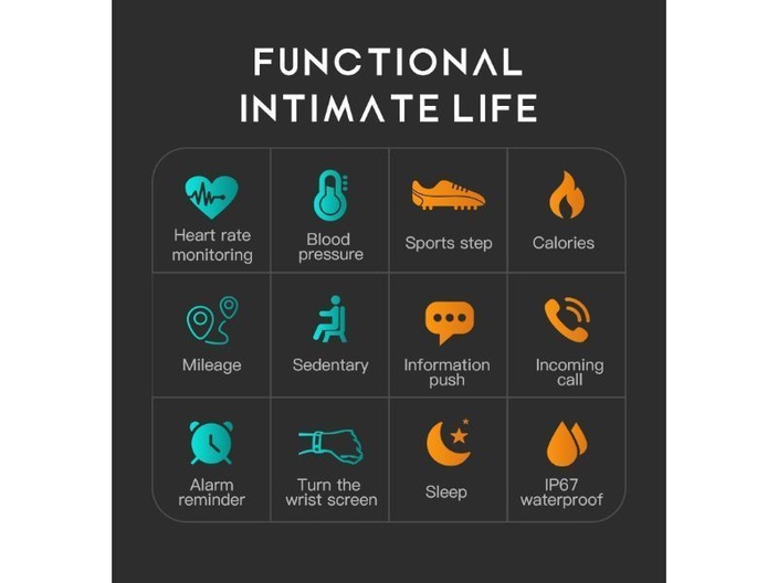 Monitort hartslag, bloeddruk, oxygen (saturatie), slaap. Meet stappen, afgelegde afstanden en verbruikte calorieën. Slimme Multi sport trainingsmodus w.o. wandelen, hardlopen, klimmen, balsporten, fietsen. Call reminder, inkomende gesprekken en berichten, stopwatch. De V20 is waterproof (IP67) (Spatwaterdicht).