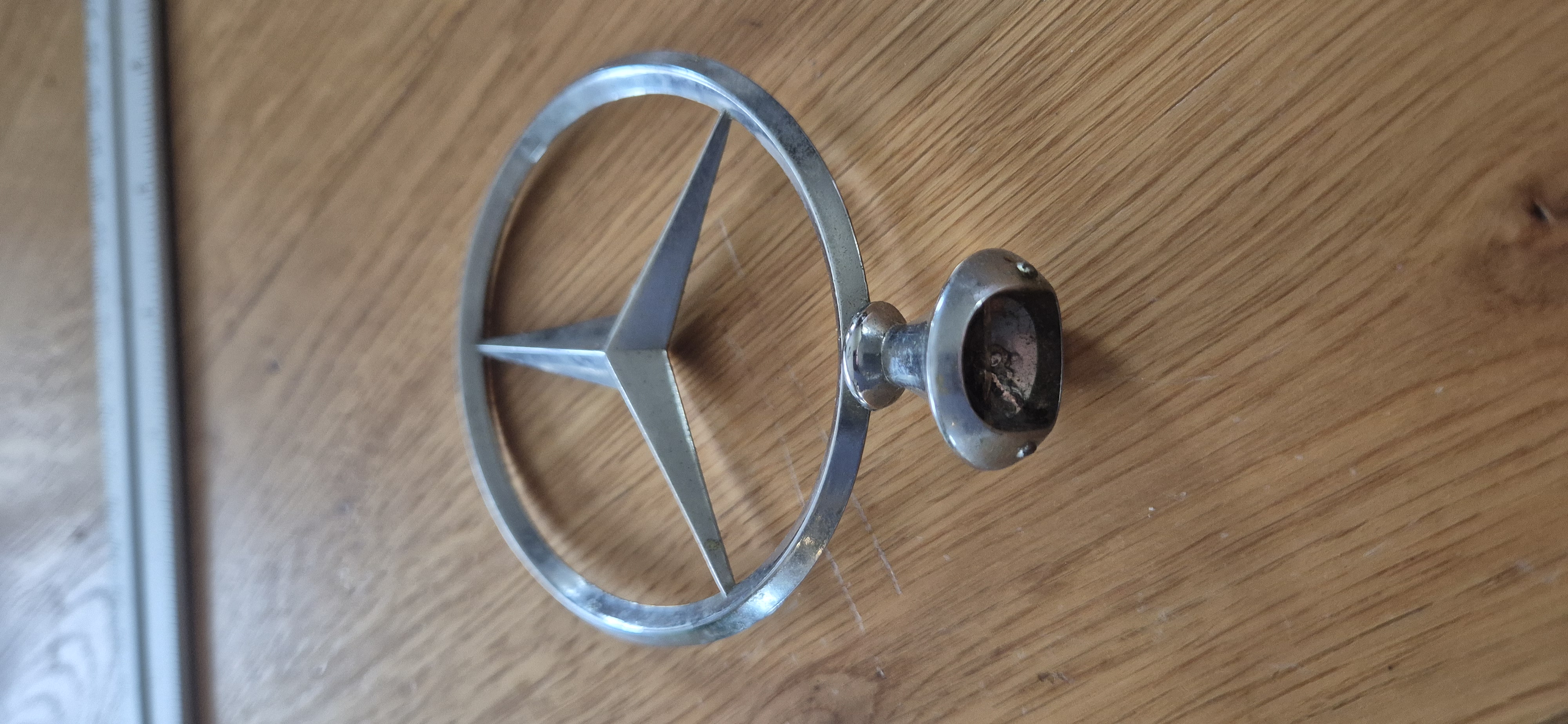 Te koop: een metalen Mercedes-Benz motorkap-ster (hood ornament).