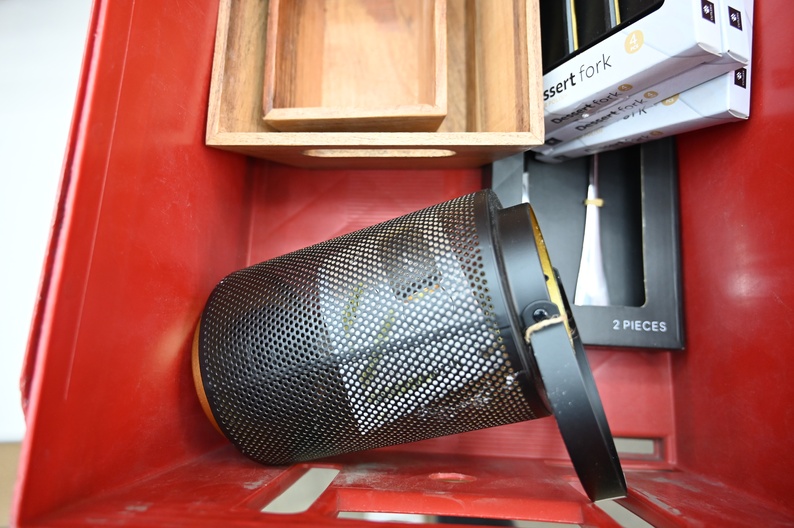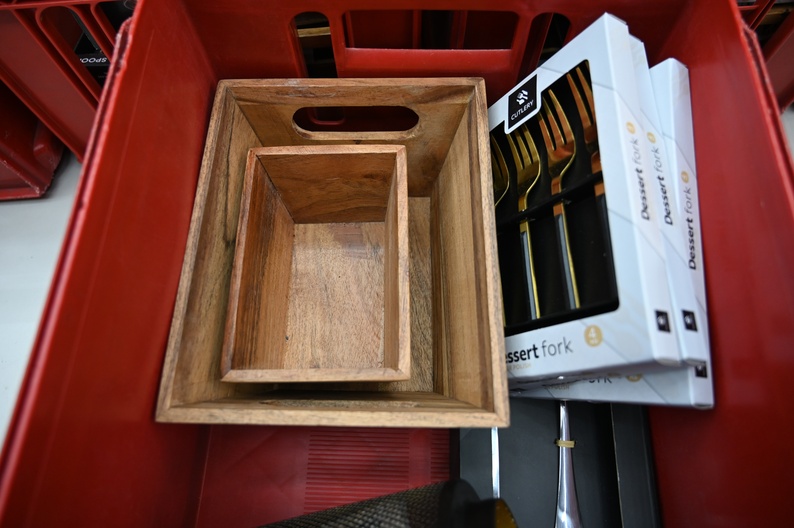 Lamp, houten bakjes, bestek en opschepbestek