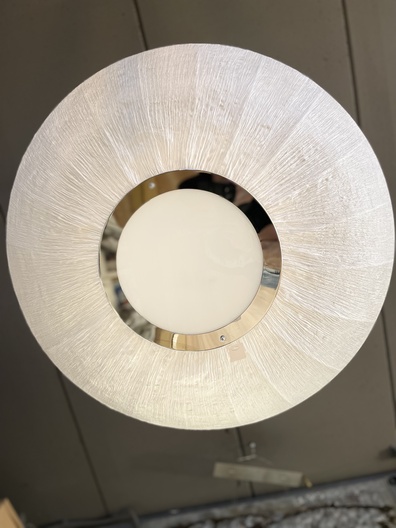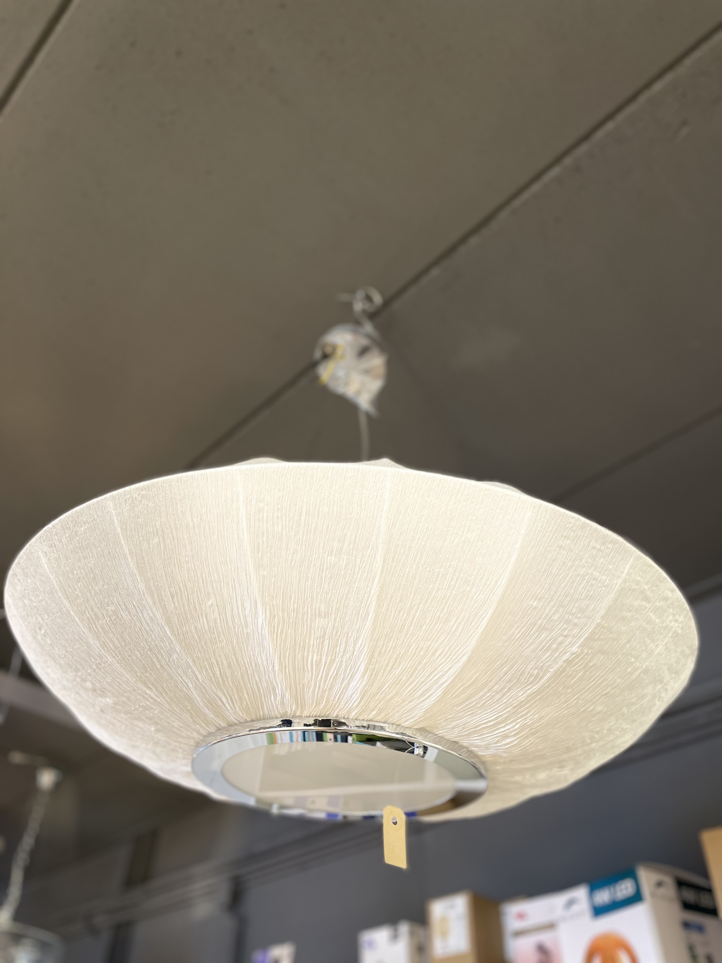 Bijzondere en mooie hanglamp in het wit met een speciale doek van chroom