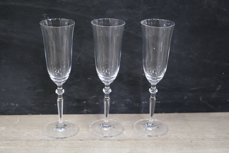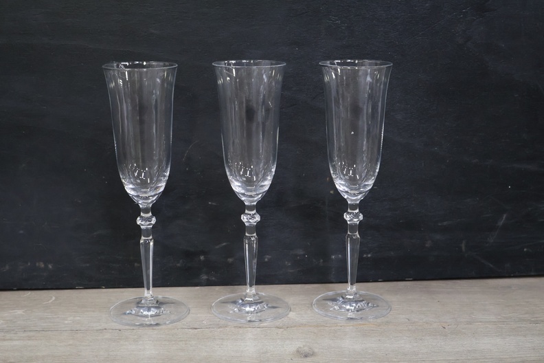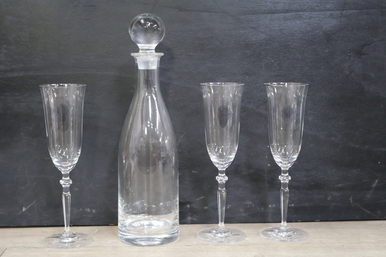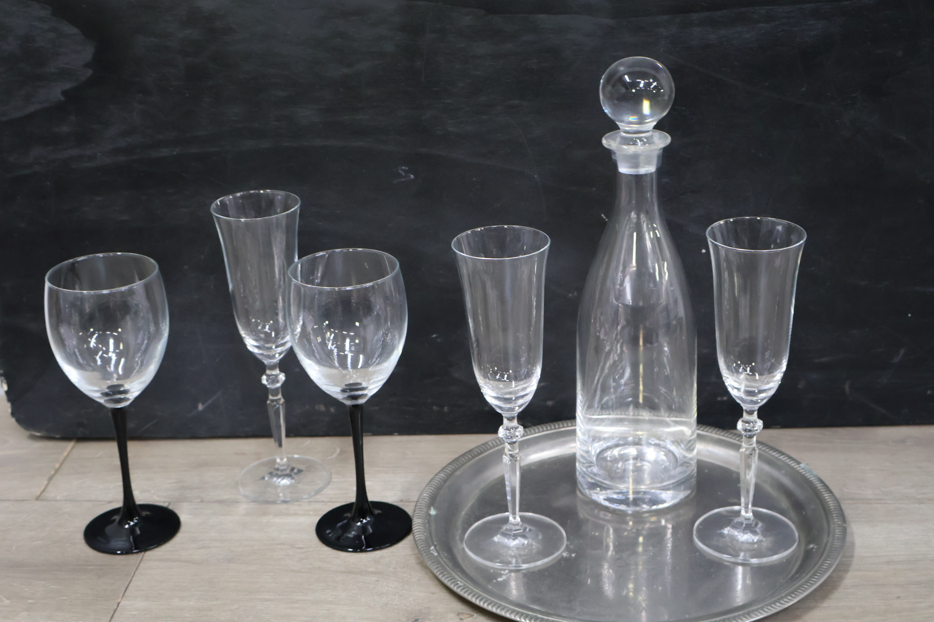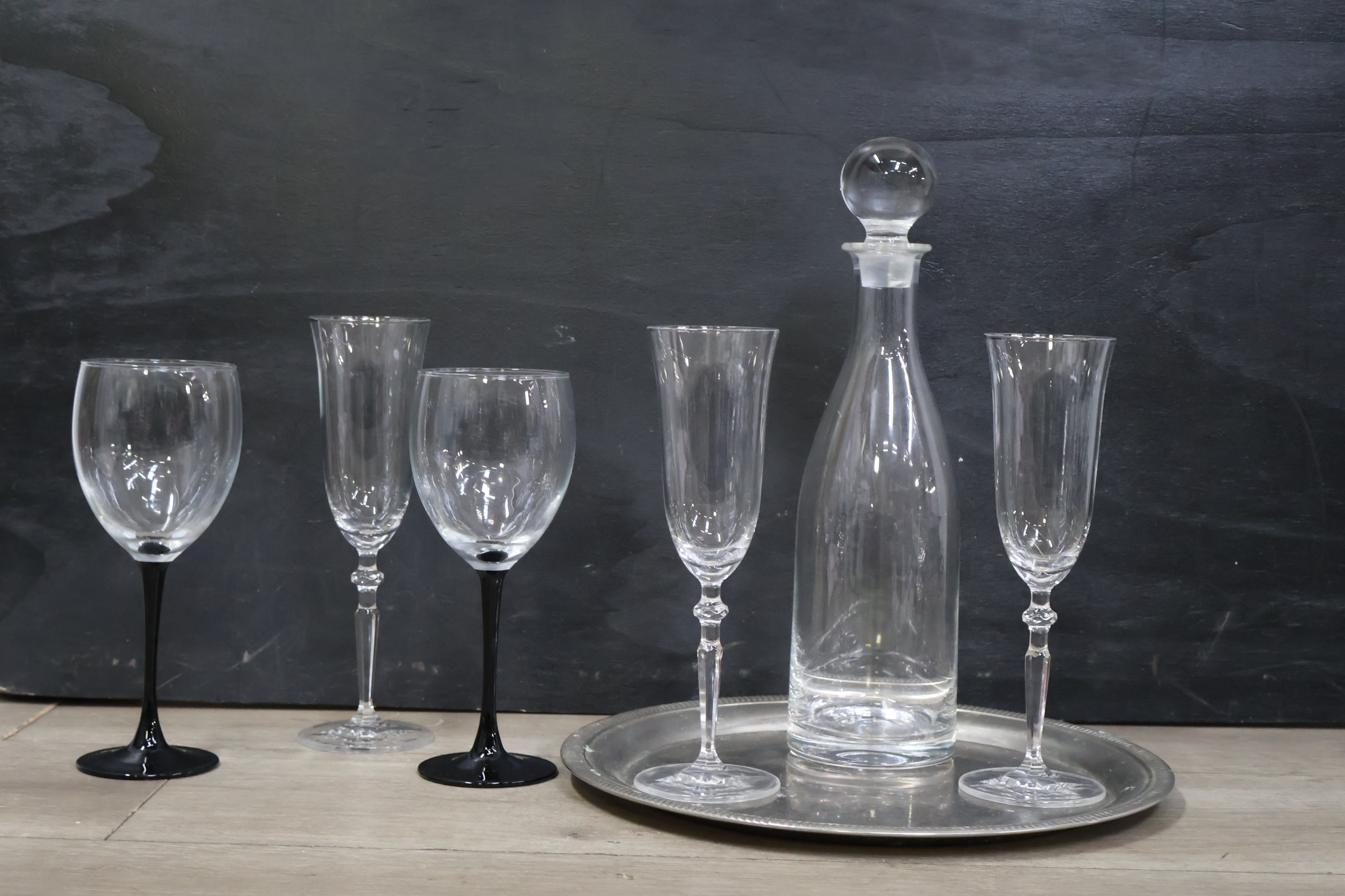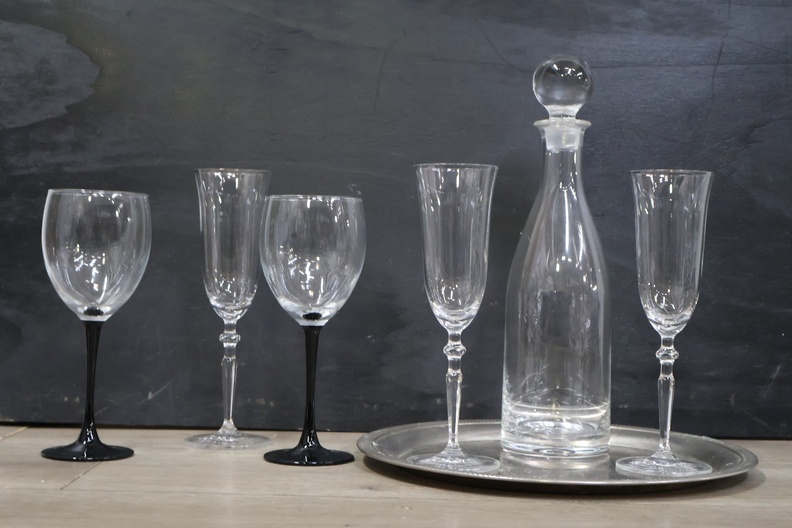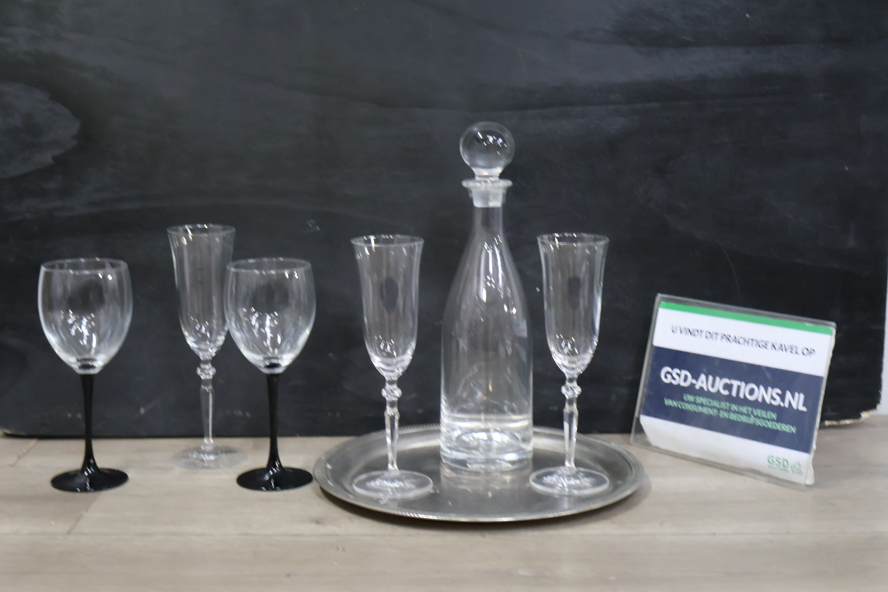 Kristallen karaf met 5 wijnglazen op een dienblad'