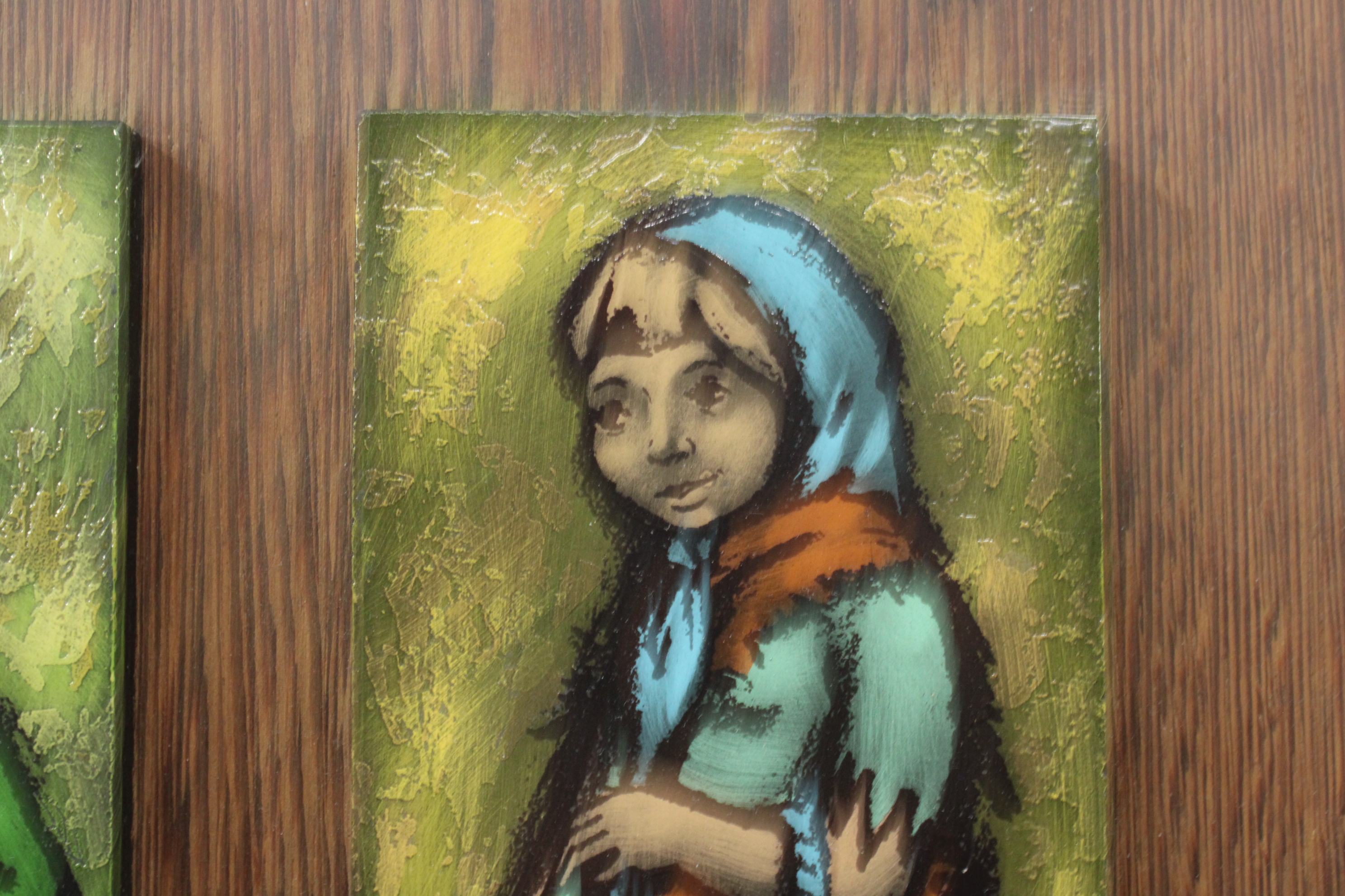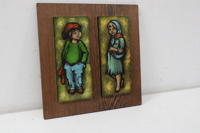 Vintage Kunststegels van 2 kinderen op houten plankje'