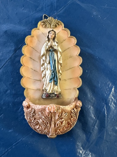 Mooi religieus wijwaterbakje / wandornament met Maria (Onze Lieve Vrouw van Lourdes).