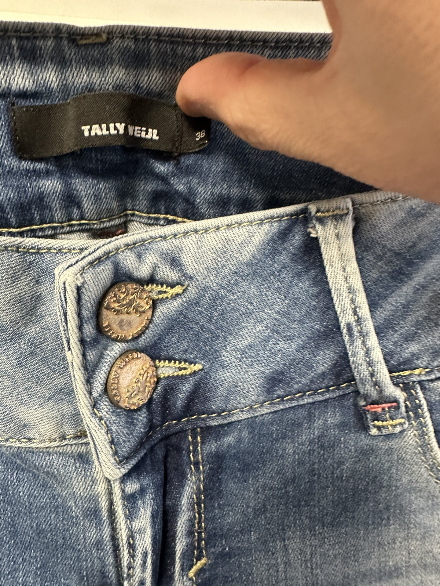 De jeans is niet nagemeten. Maatvoering is zoals op het label vermeld (38).