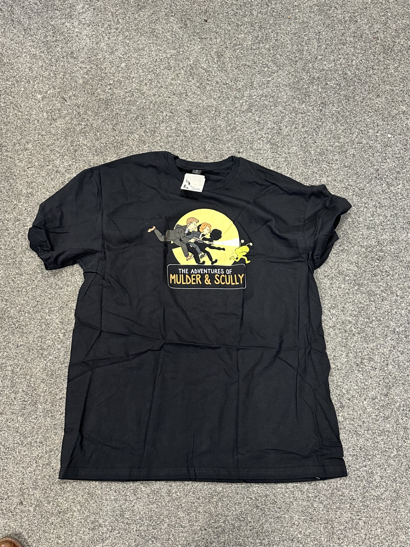 The Adventures of Mulder & Scully” T-shirt in zwarte uitvoering. Het shirt heeft een kleurrijke print op de voorzijde met cartoonachtige weergave van Mulder en Scully die een buitenaards figuurtje achtervolgen.