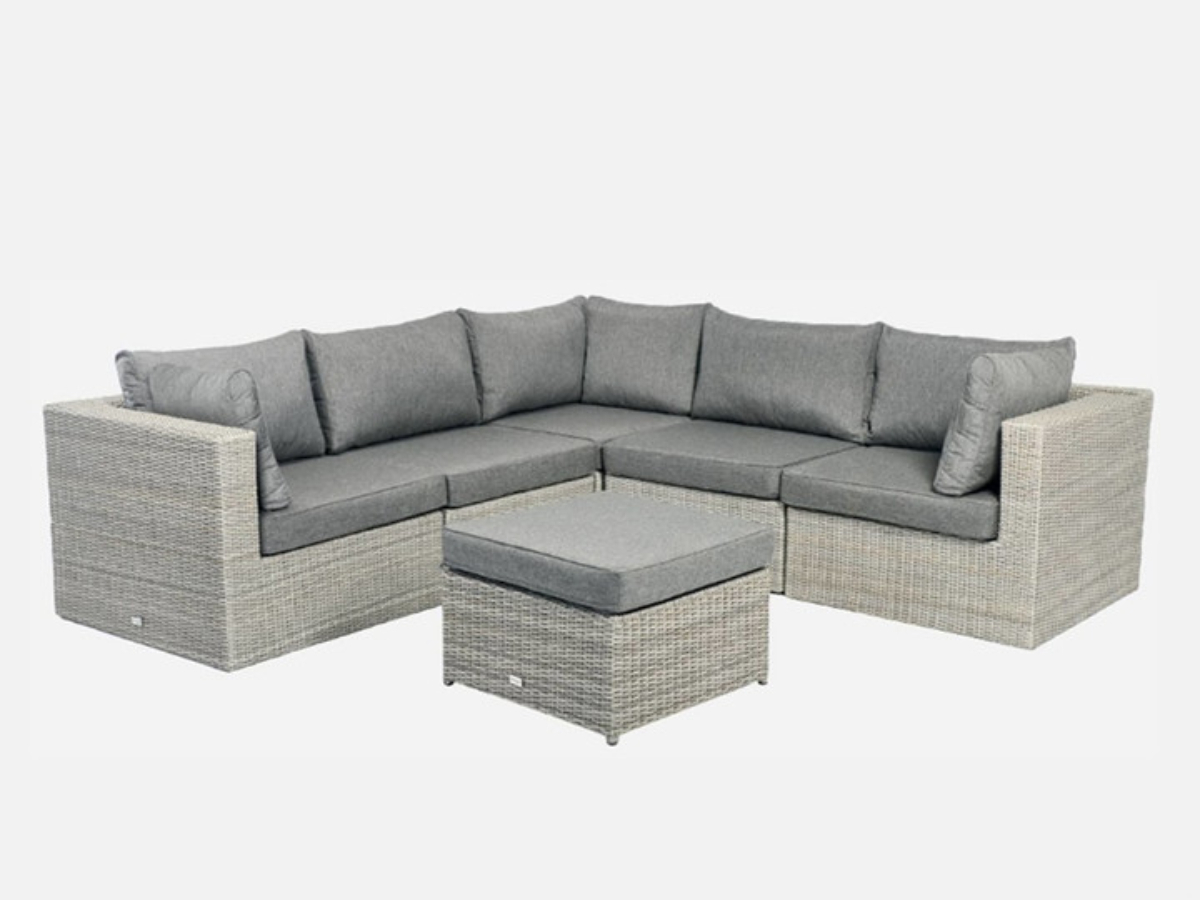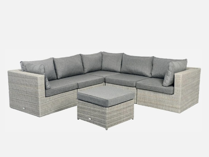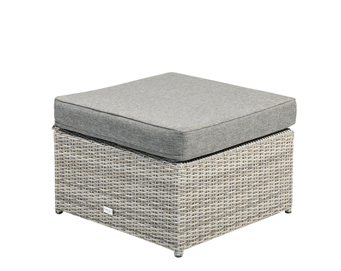 Tierra outdoor illias lounge ottoman met aluminium frame en wicker gevlochten draad in de kleur weatehred grey. Het betreft een losse ottoman, nieuw model in doos. cataloguswaarde € 219,-