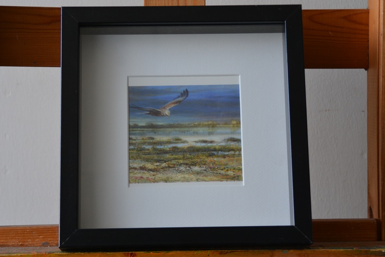 Roofvogel in het landschap.  Met zwarte vierkante lijst. In goede staat.