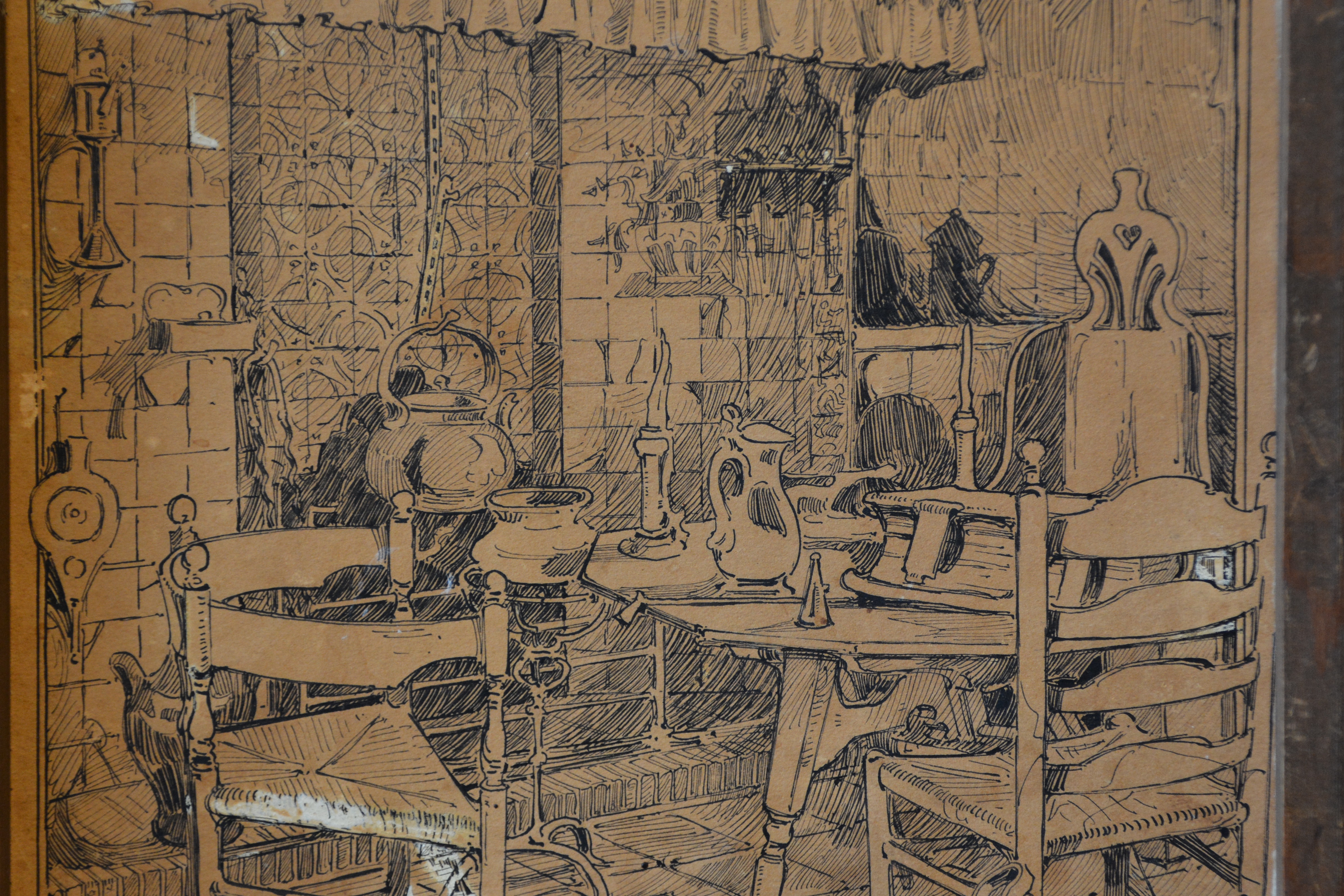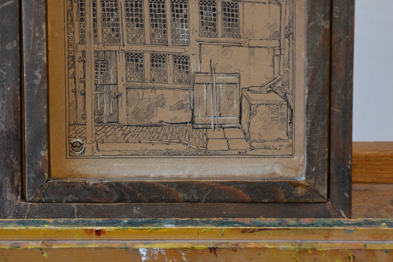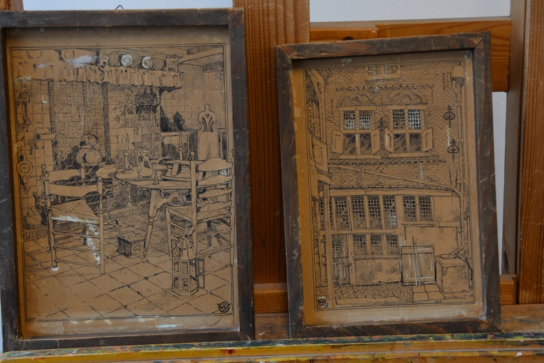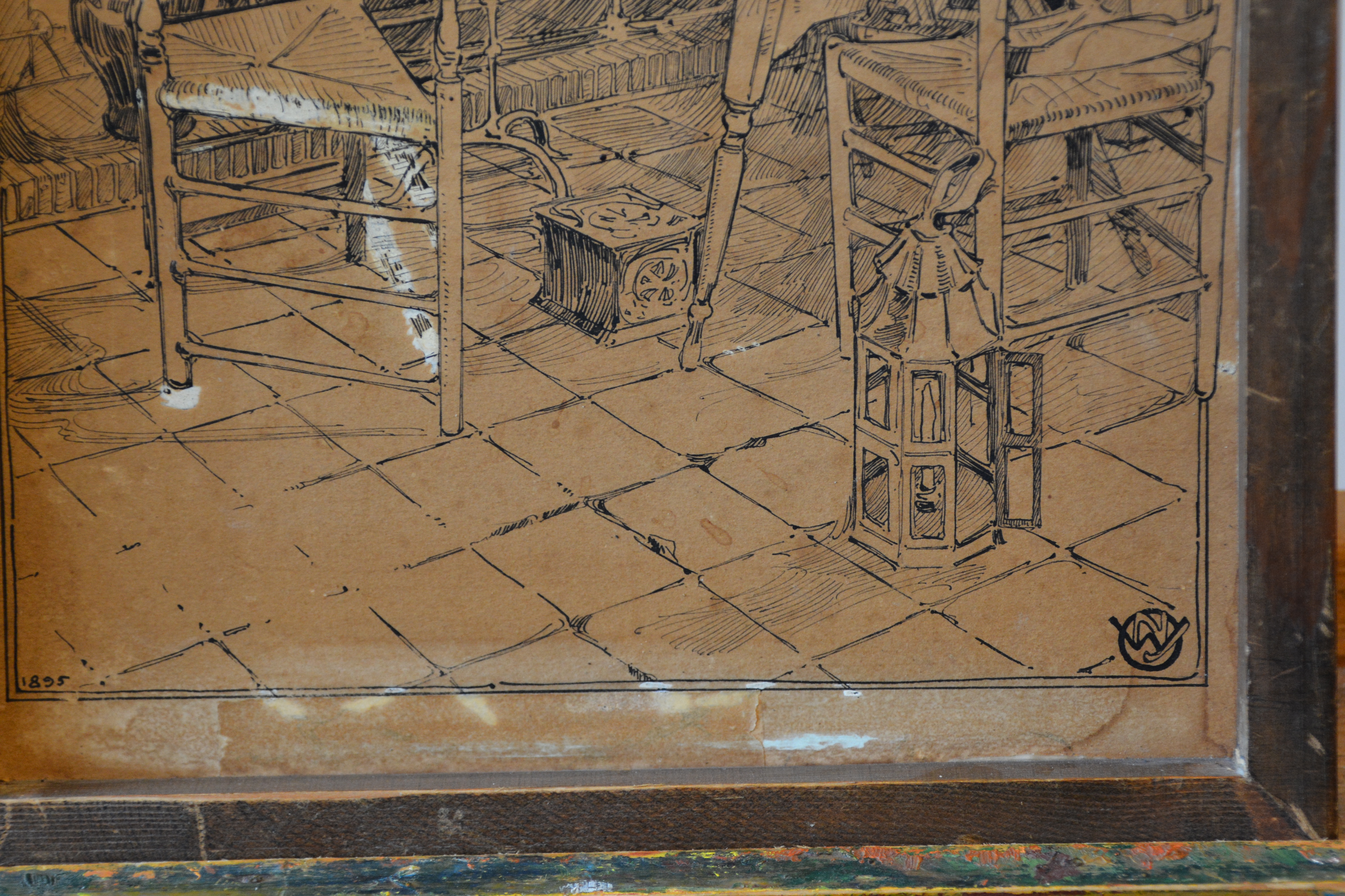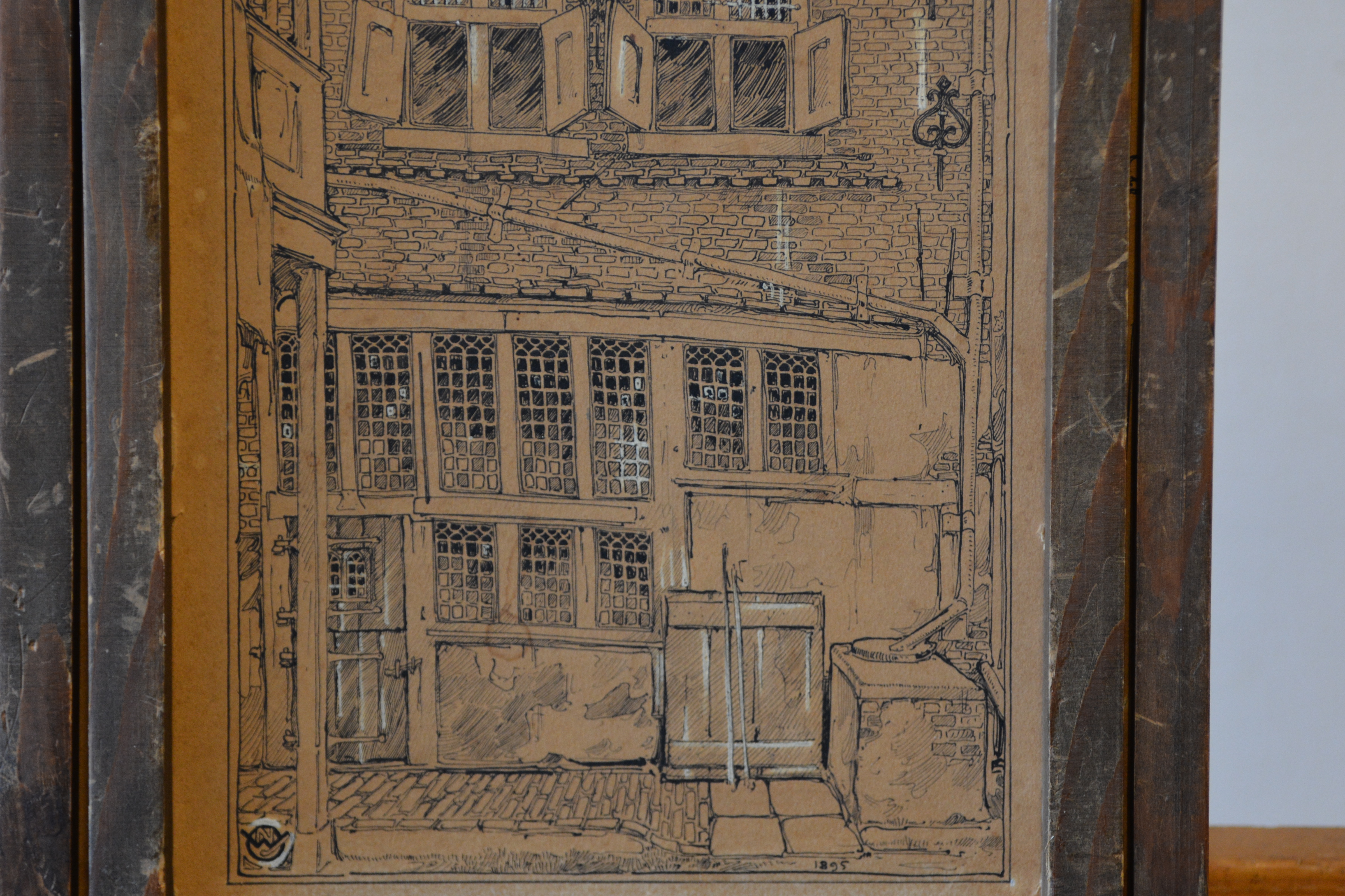 2 Zeer antieke en kwetsbare etsen. Ze zijn gesigneerd met W.J. en dateren uit 1895. Deze is een gevel van een zeer oud huis, mogelijk een binnenplaats, de andere prent laat een binneninterieur van een oud huis zien. Fraai gemaakt, in redelijke en kwetsbare staat, gezien de leeftijd van de prenten. Moet per koerier worden verzonden ivm de kwetsbaarheid.