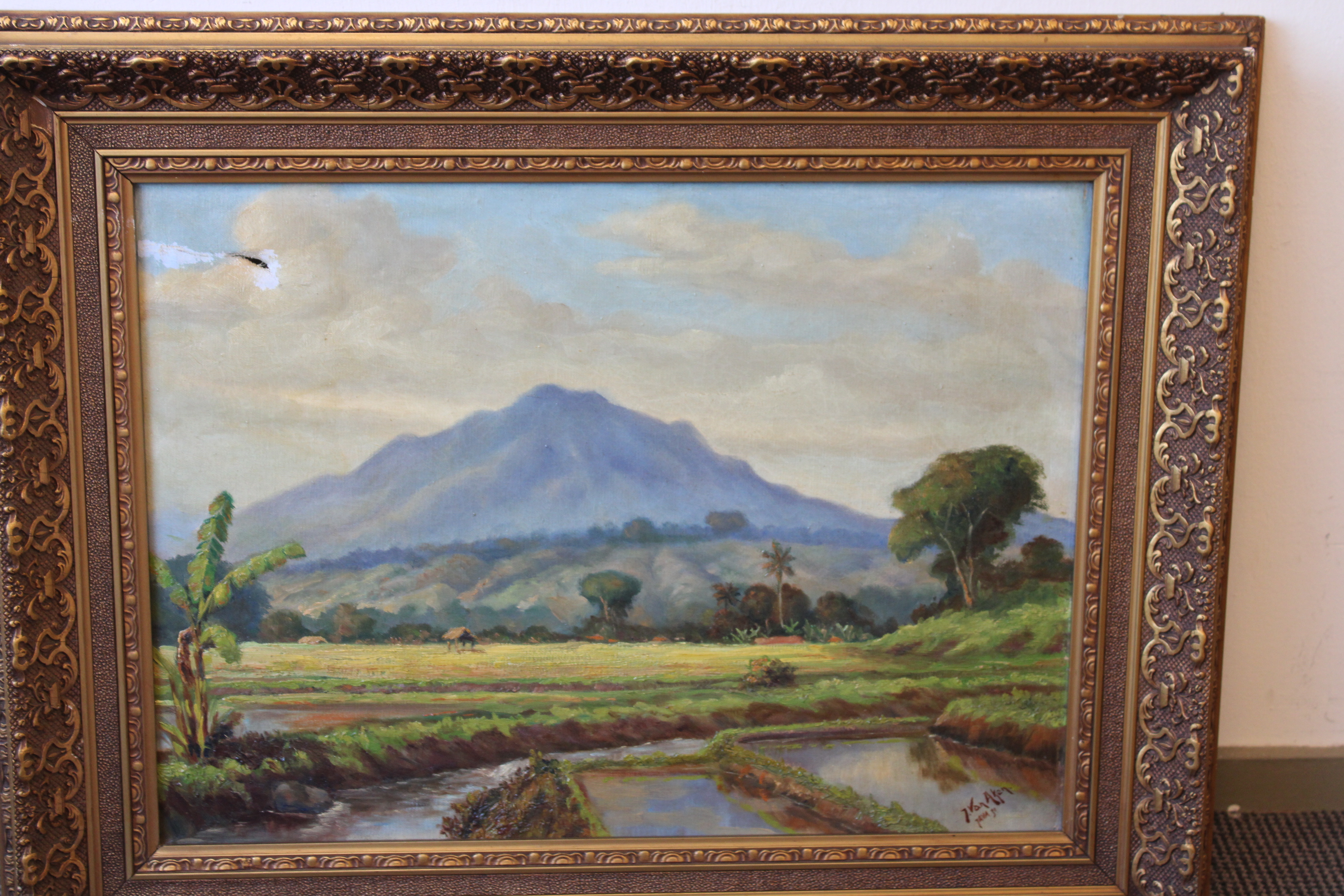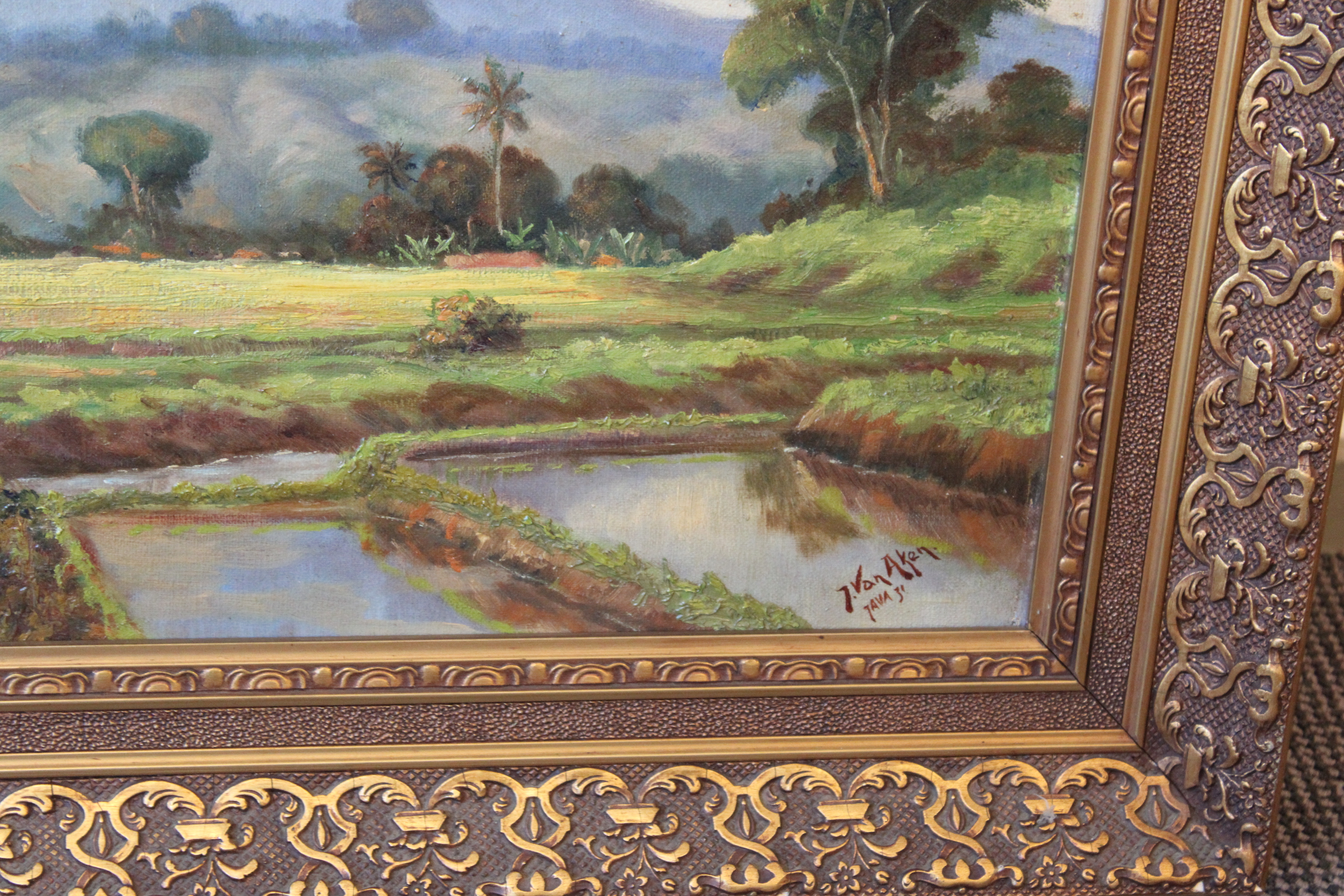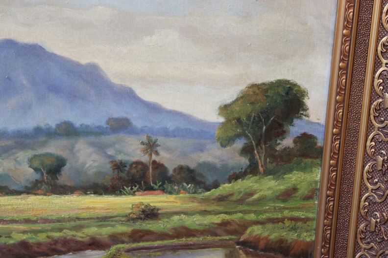 Java 1931. Ingelijst en fraai geschilderd. Helaas zit er een gat in het doek, misschien leuke opknapper voor een restaurateur? Jan van Aken (1905-?) was een Nederlands-Indisch schilder.
