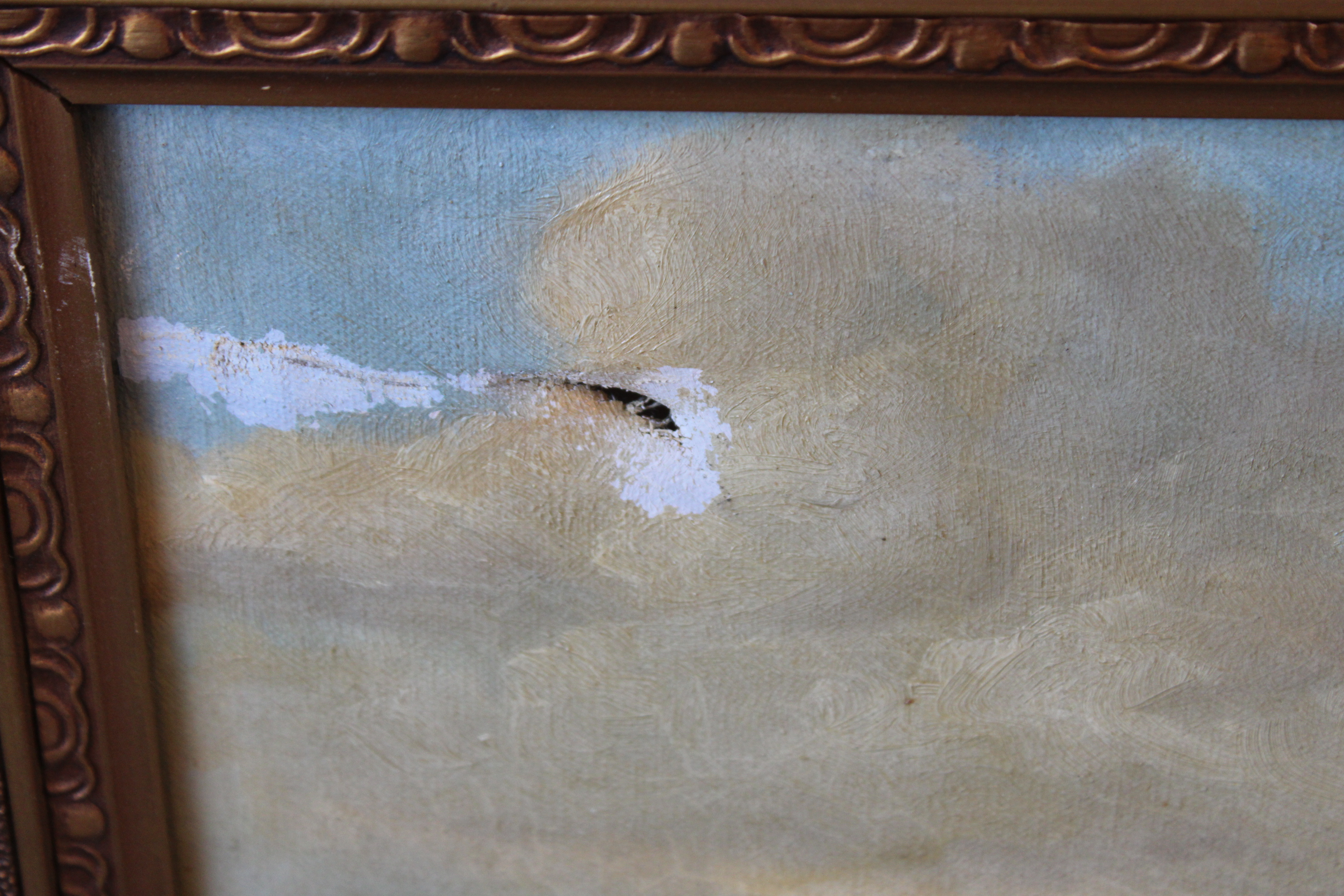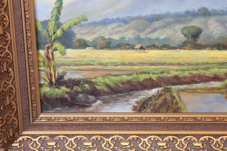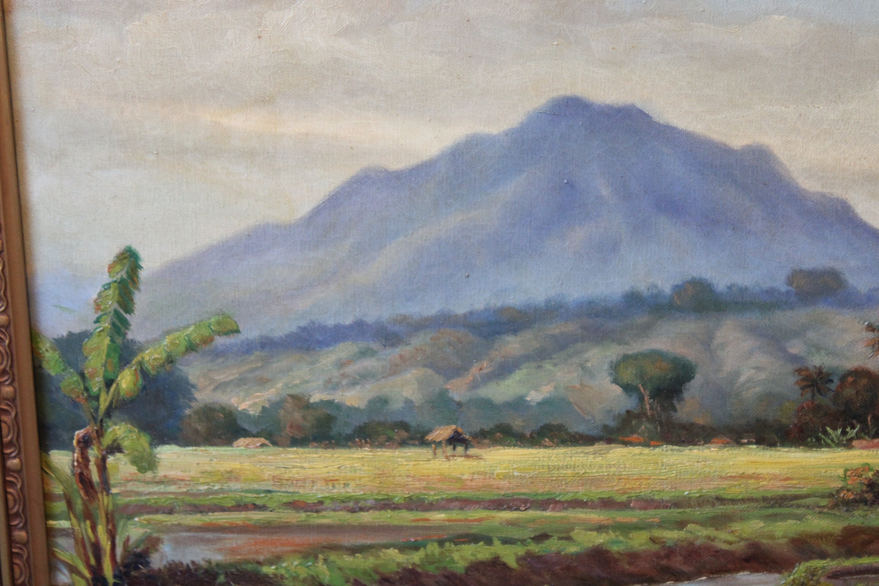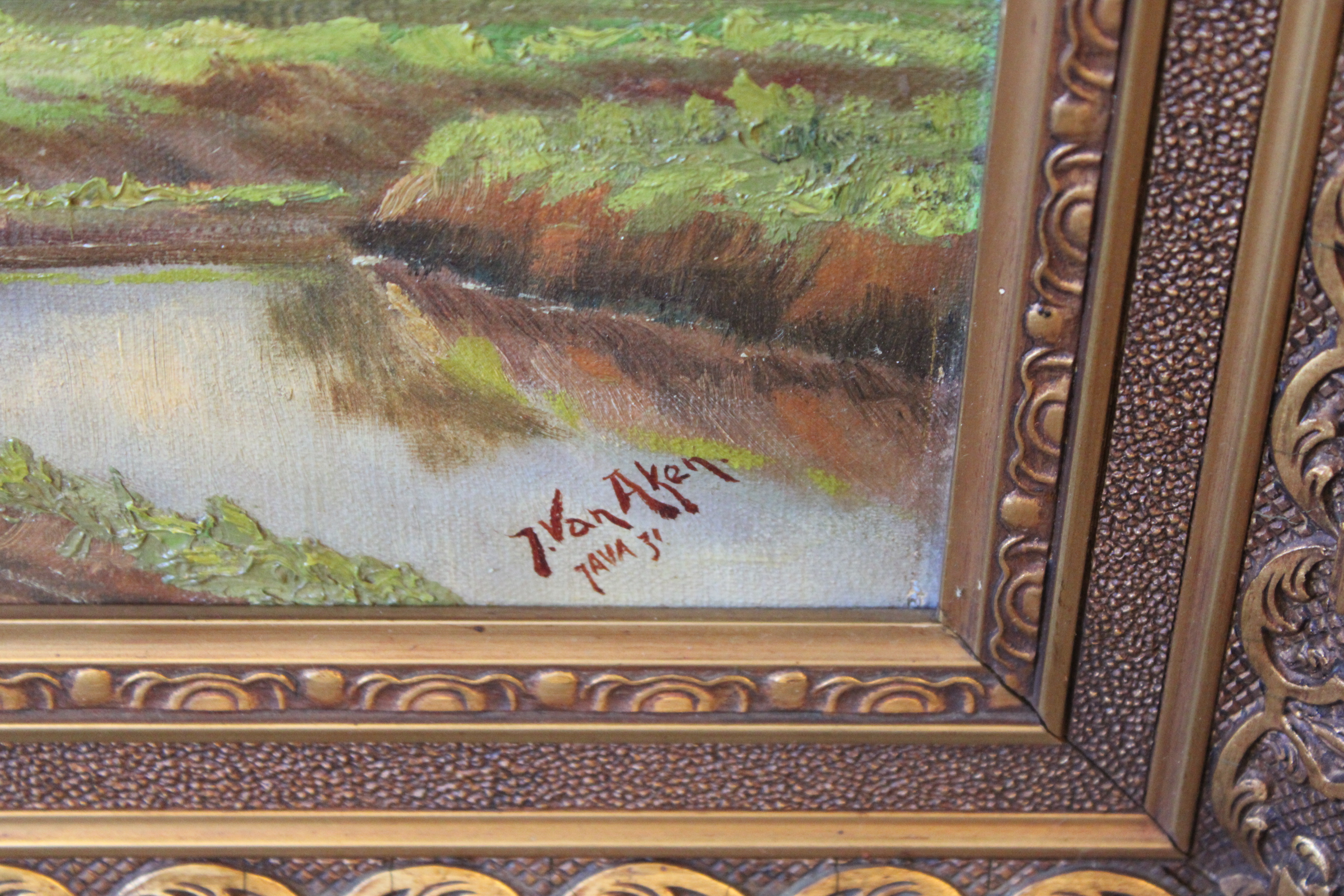 Java 1931. Ingelijst en fraai geschilderd. Helaas zit er een gat in het doek, misschien leuke opknapper voor een restaurateur? Jan van Aken (1905-?) was een Nederlands-Indisch schilder.