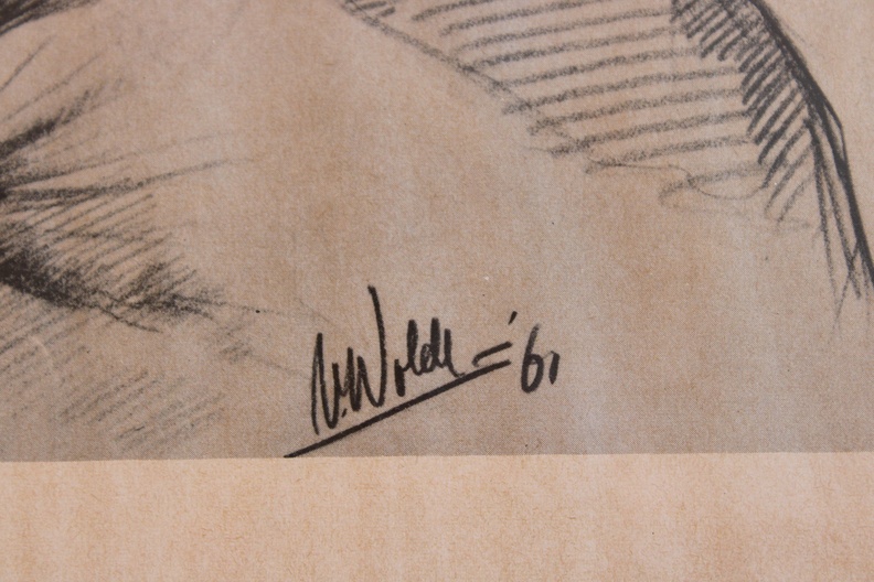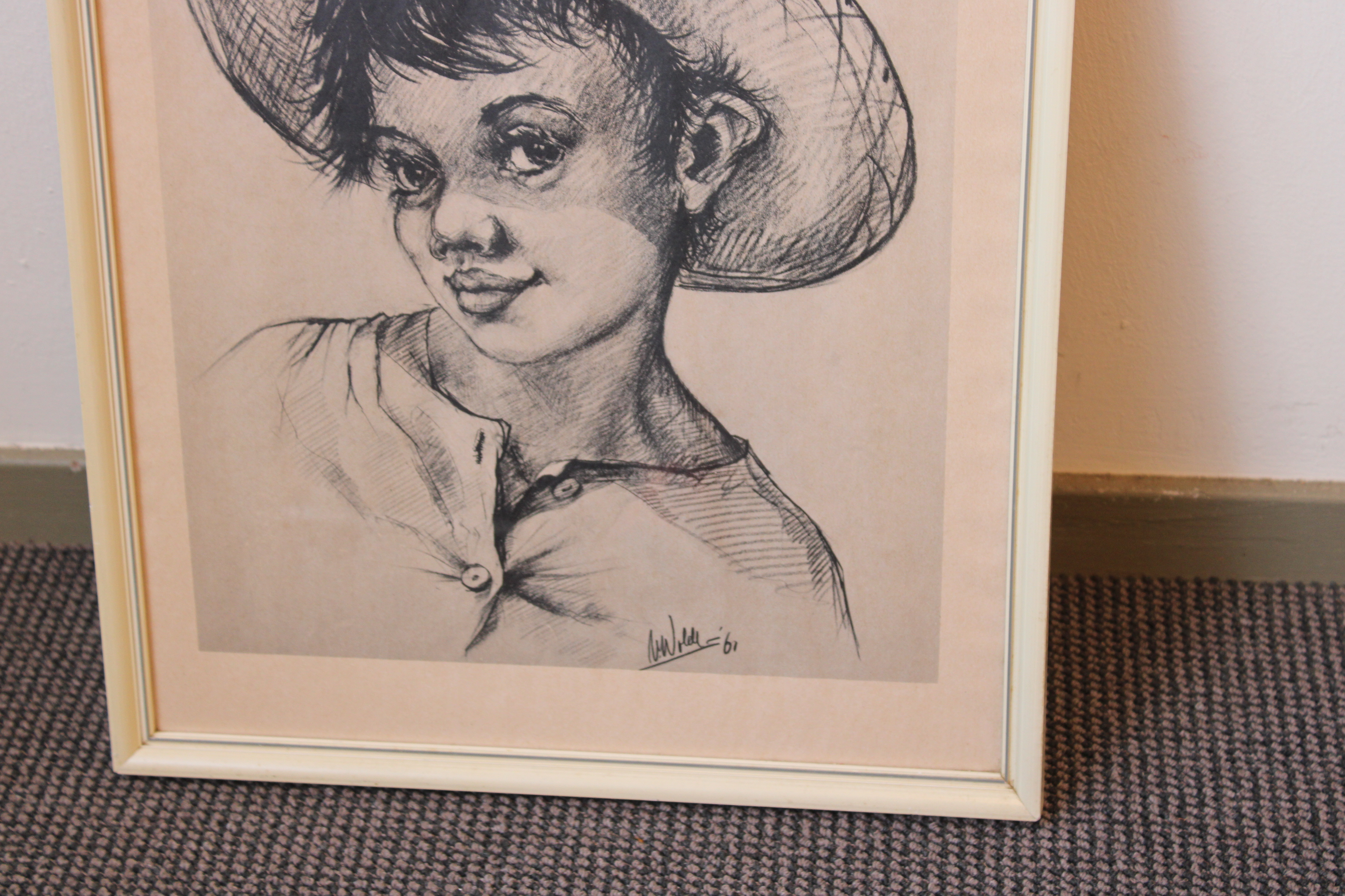 Mooie prent naareen tekening uit 1961 van V. Woldt. We zien een jongen met een strohoed. In goede staat.