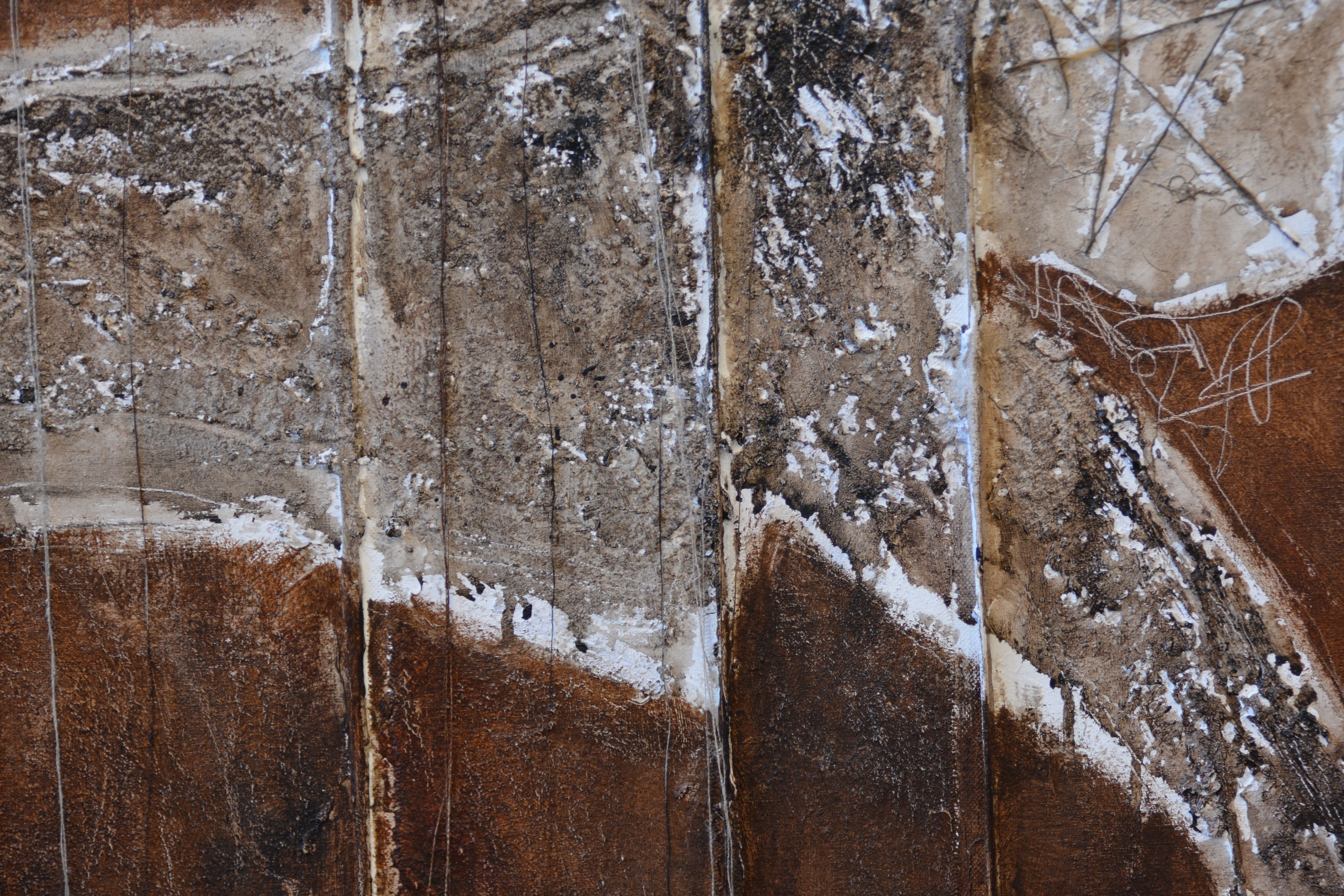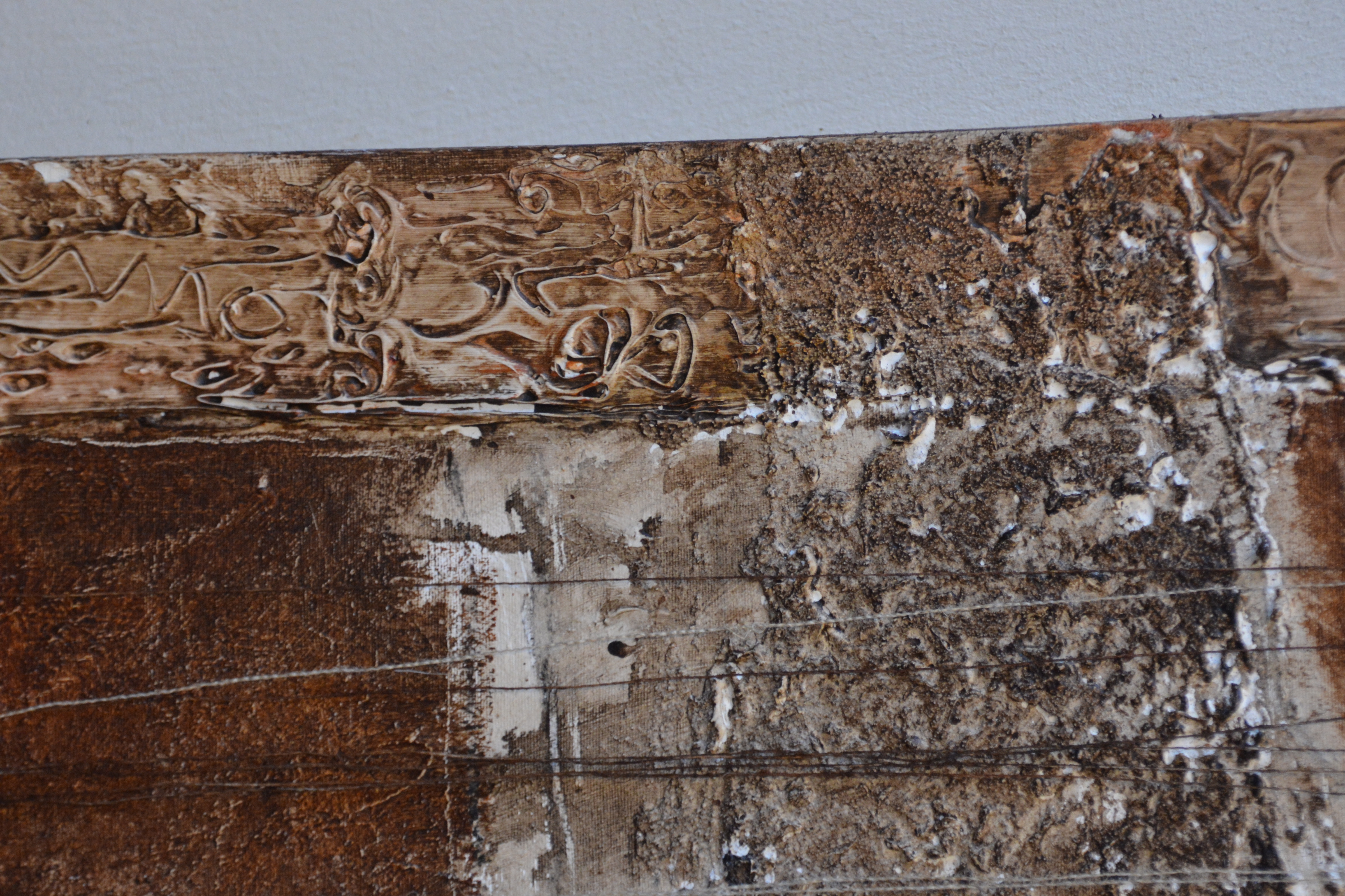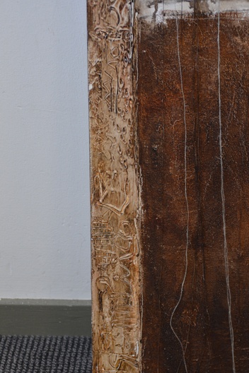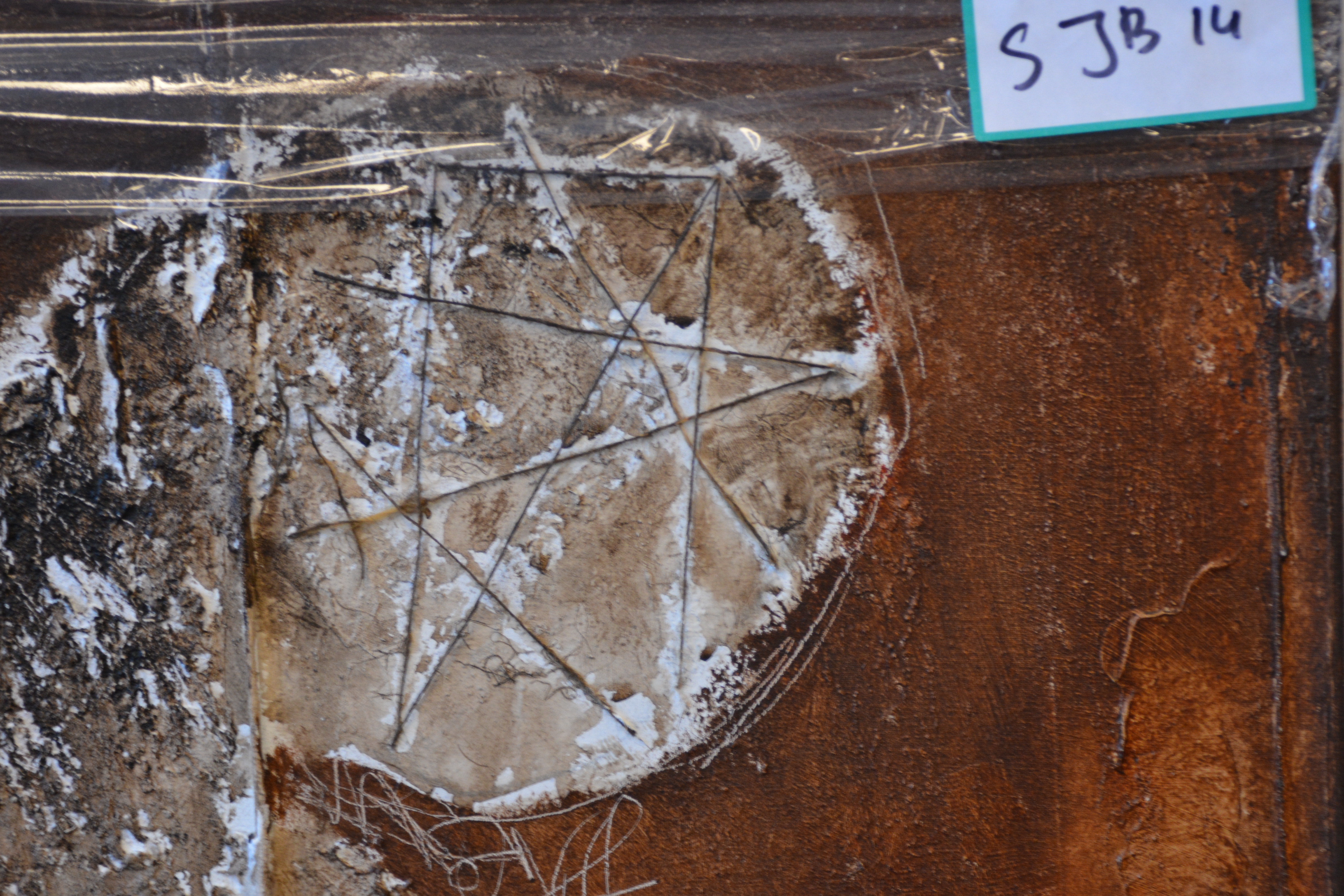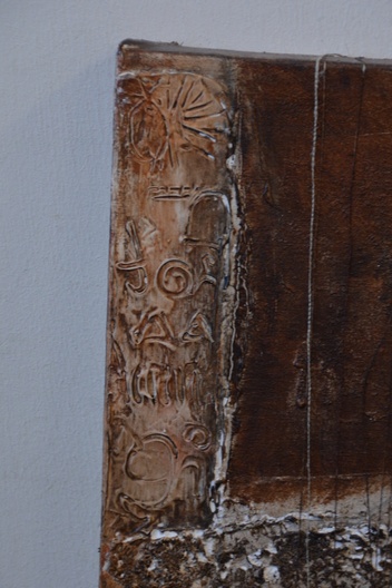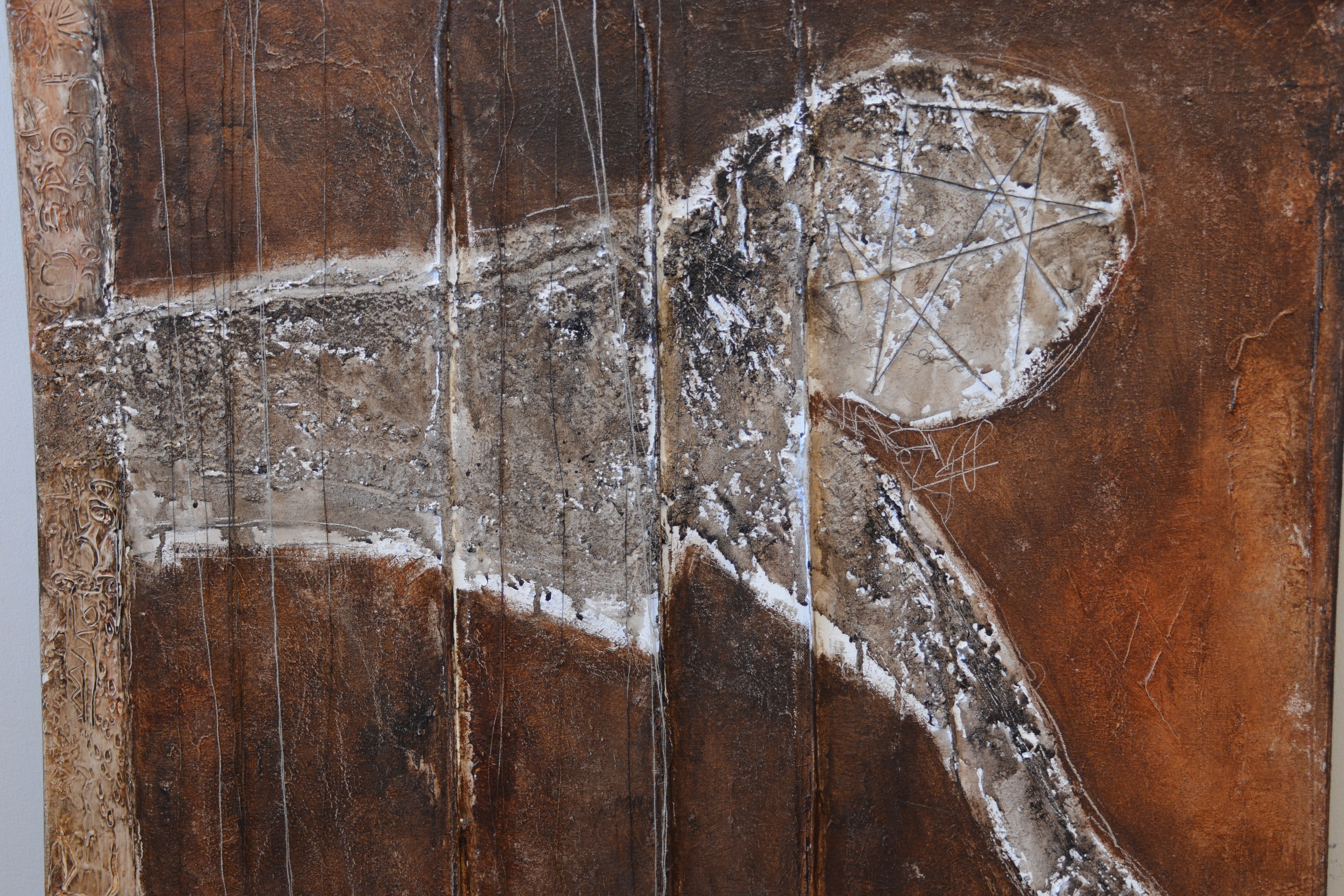 Jeanne Beenakkers (Bavel 1946-2012), was een bekend kunstenares. Ze werkte veel met acryl op canvas, dit werk is gemaakt met gemengde technieken. Achterop staat geschreven; Horiz Fig' Mogelijk de titel. Met Australische symbolen. Zonder lijst. In goede staat.