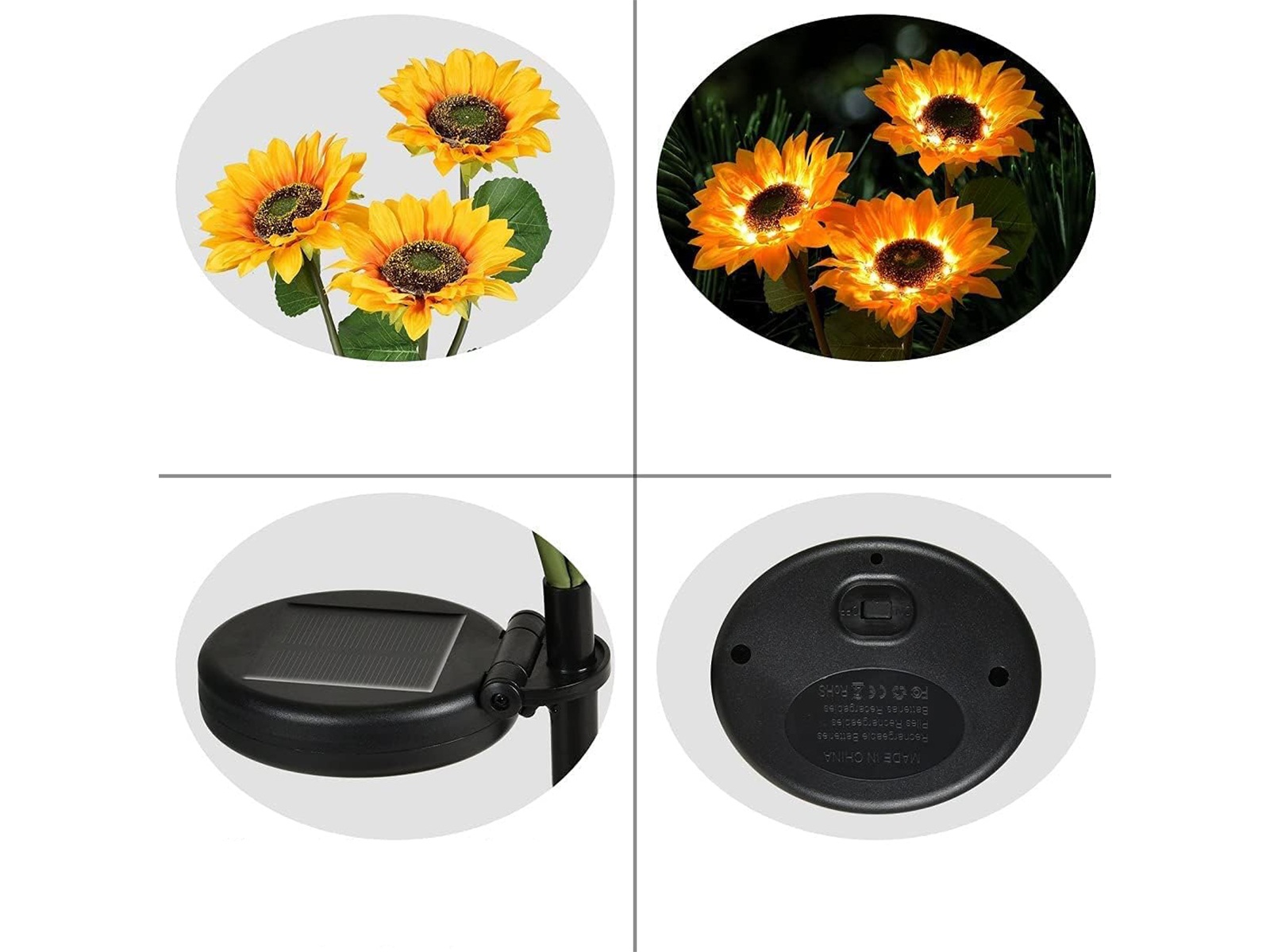 De tuinprikker met zonnebloem buitenverlichting werkt op solar basis (zonne-energie). De zonnebloem tuinverlichting bevat drie zonnebloem koppen. De verlichting bevat een silicium zonnepaneel plus een ingebouwde 600mAh oplaadbare batterij, die kan worden opgeladen zonder stopcontacten en/of draden. Wanneer de ingebouwde NiMH-batterij overdag voldoende zonne-energie opvangt, geeft de zonnebloem automatisch licht in het donker. Werkt zo'n 6 tot 13 uur!