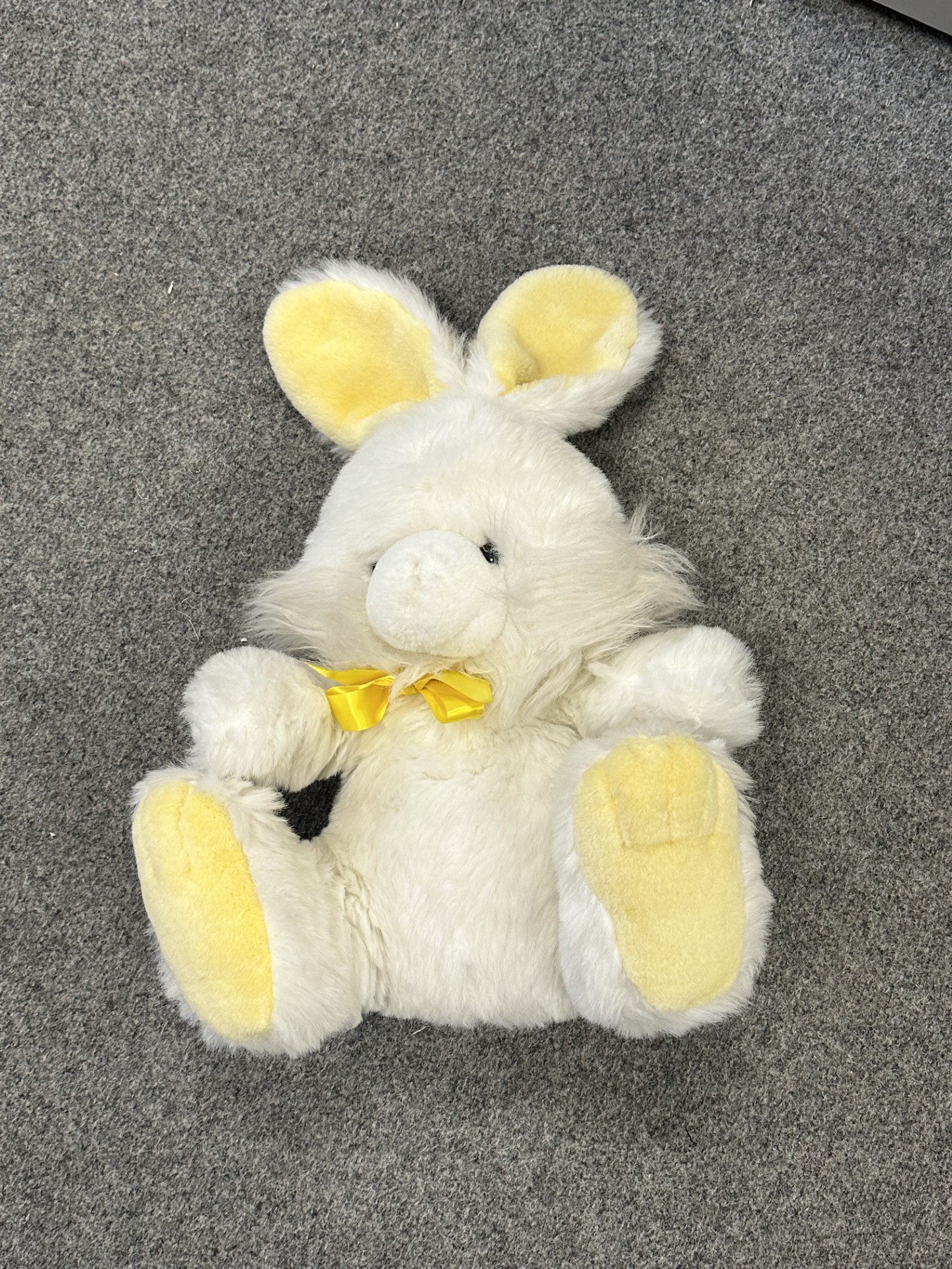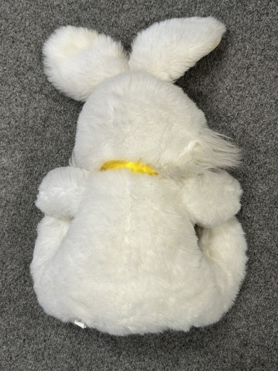 Dit schattige konijn heeft een witte vacht met gele accenten in de oren en op de voetzolen. Om de hals zit een geel satijnen strikje. Het knuffeltje heeft een vriendelijke uitstraling en is heerlijk zacht.