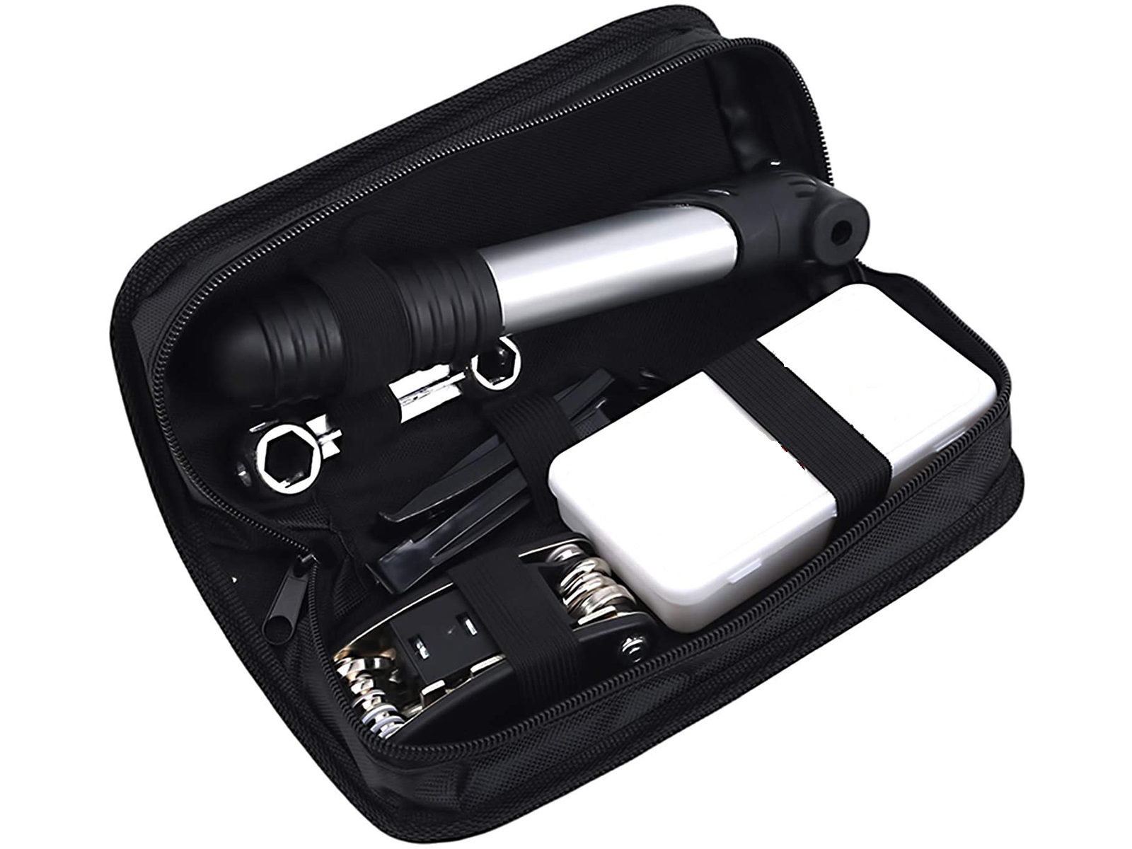 De set bestaat uit een compacte pomp, een multi tool, 2 bandenlepels, 8 plakkers, 1 moersleutel met 8 maten en opbergtas.