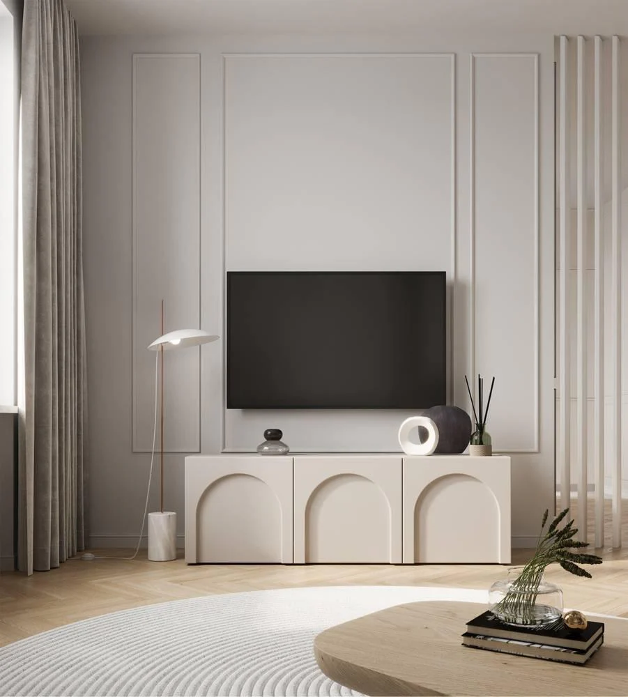 Het in minimalistische stijl ontworpen Archie TV-meubel onderscheidt zich door decoratief frezen aan de fronten in de vorm van bogen , waardoor het een subtiele maar karakteristieke uitstraling krijgt. De binnenkant van de kast is verdeeld in drie gesloten planken, waardoor je verschillende spullen in de gewenste volgorde kunt opbergen. De grijsbeige kleur geeft hem een ​​delicate, natuurlijke charme die perfect past bij diverse arrangementen, en door zijn eenvoud past hij in zowel moderne als klassieke interieurs. Wacht niet! Kies voor Archie en transformeer uw interieur in een oase van elegantie en harmonie.