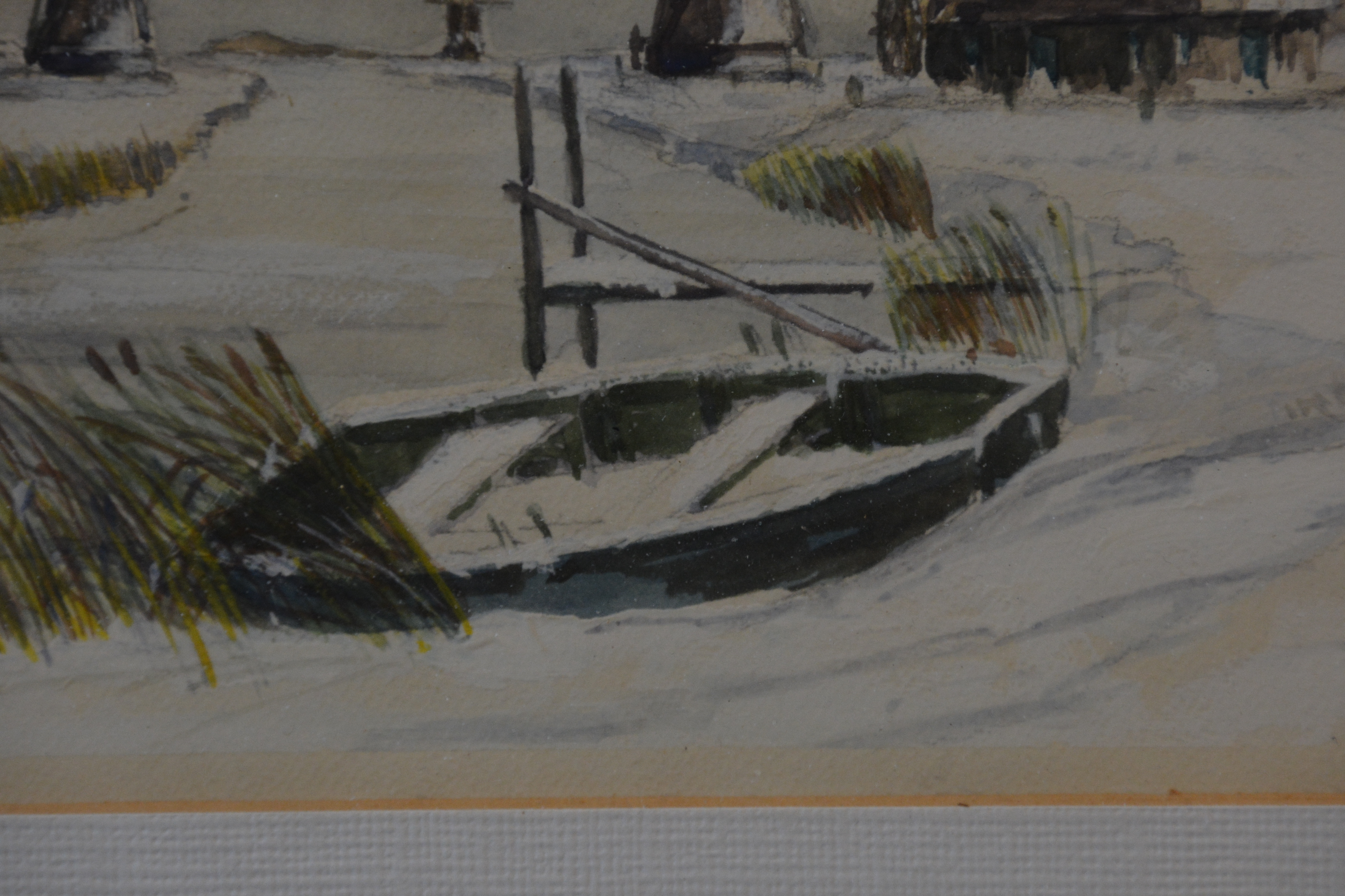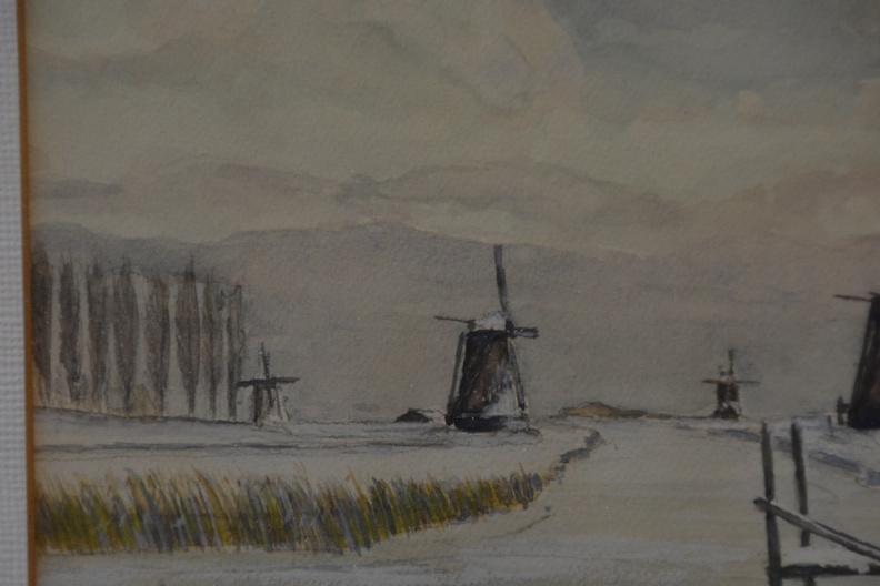 Ingelijste aquarel met vaart en molens in winterlandschap