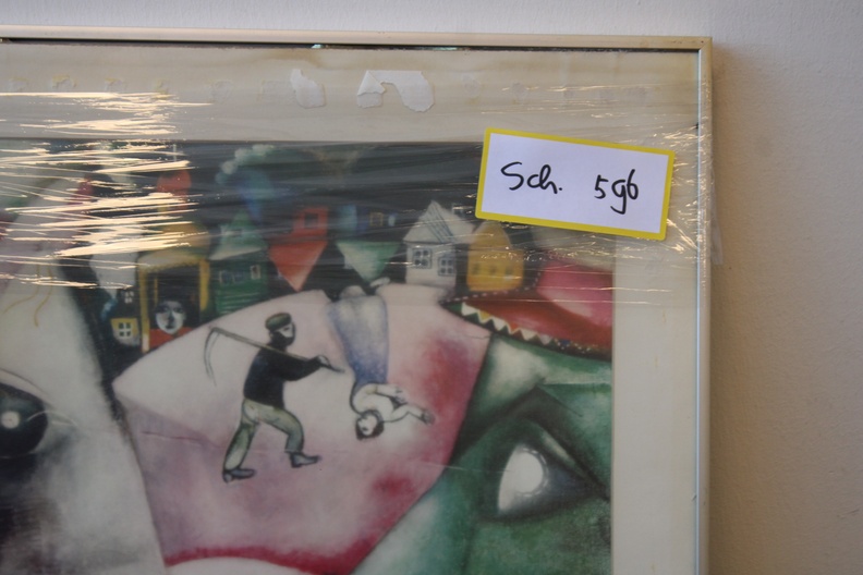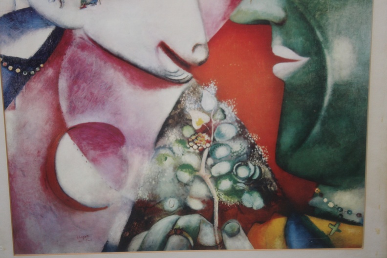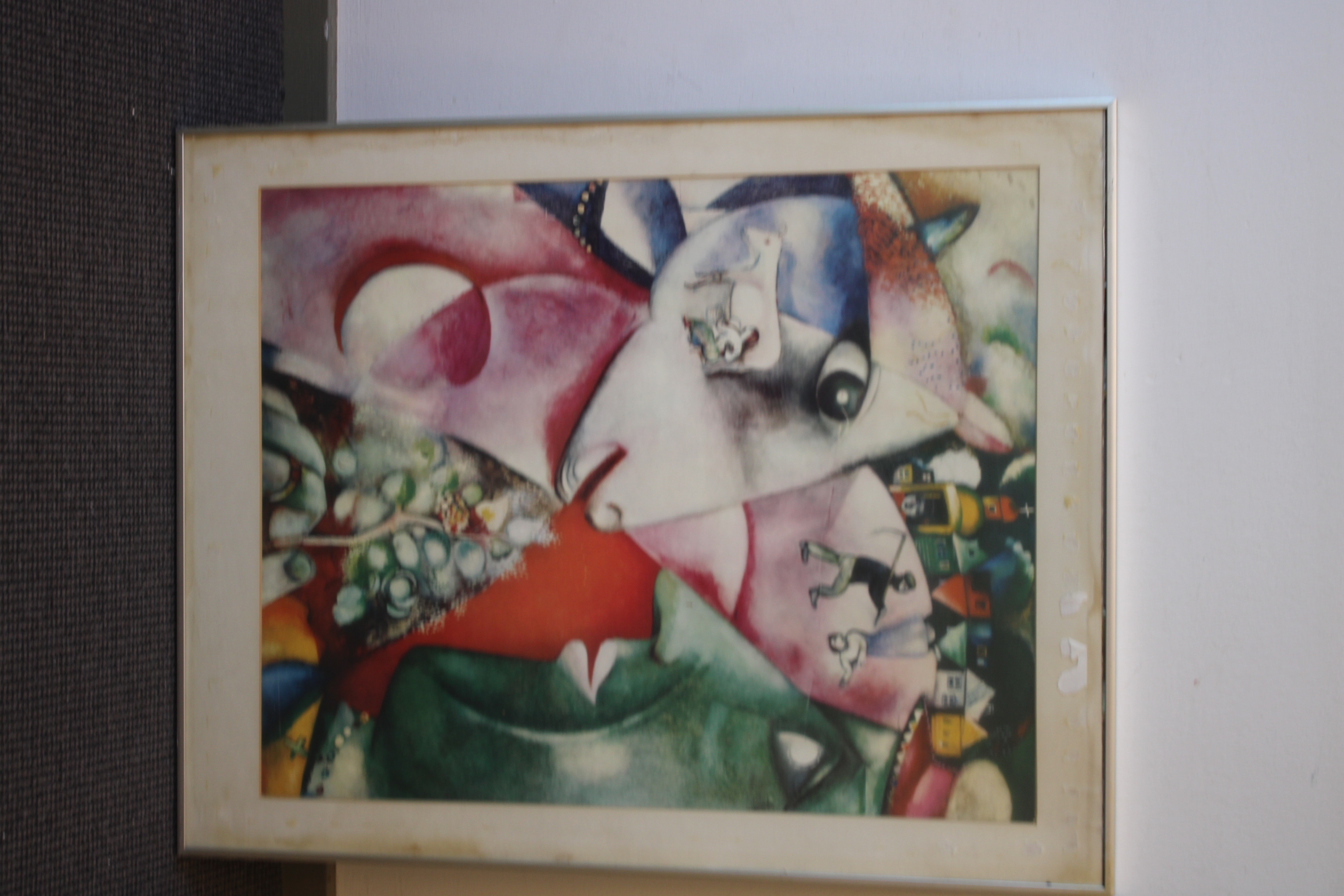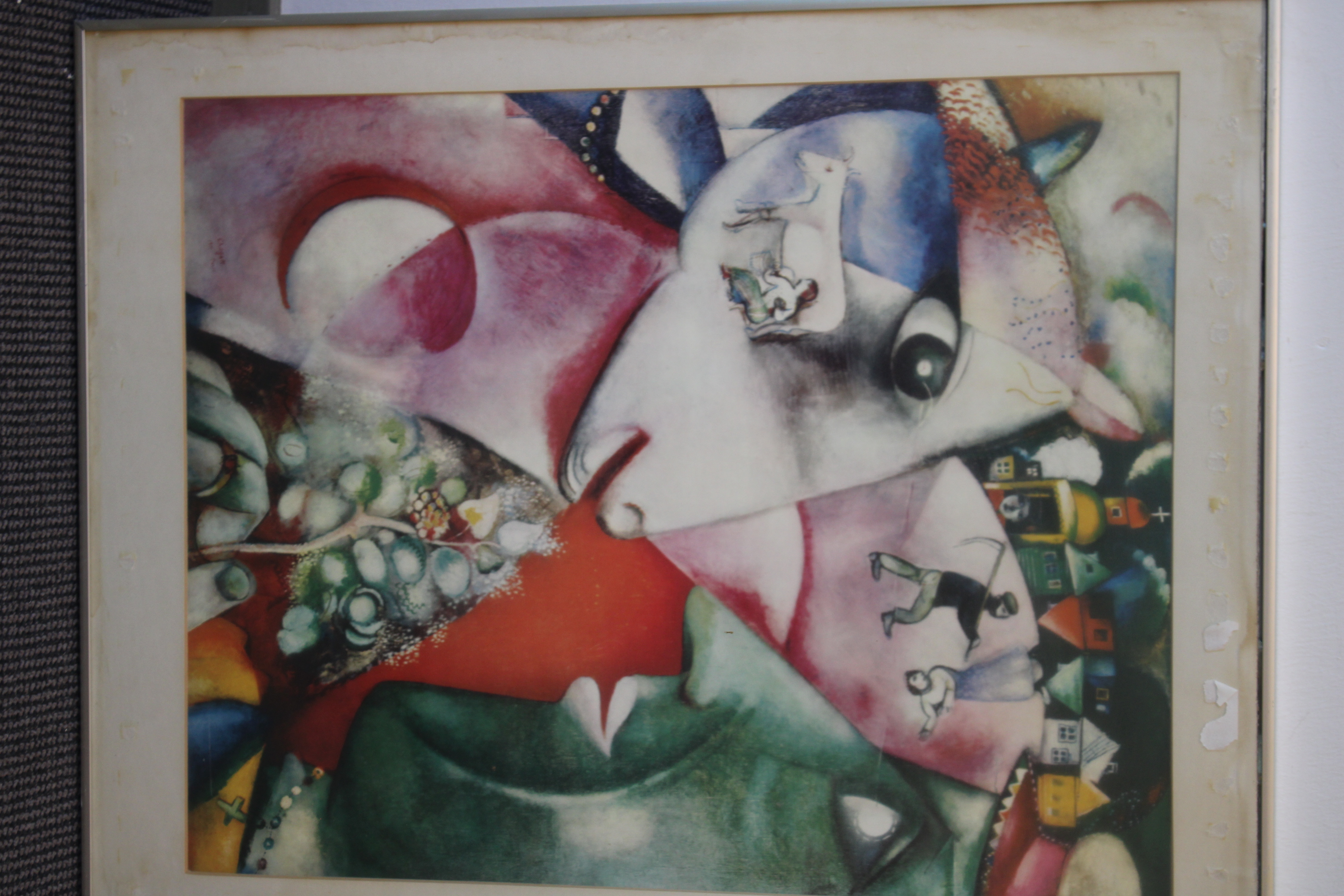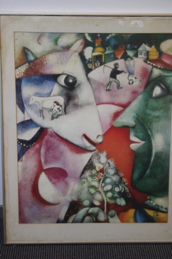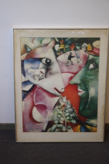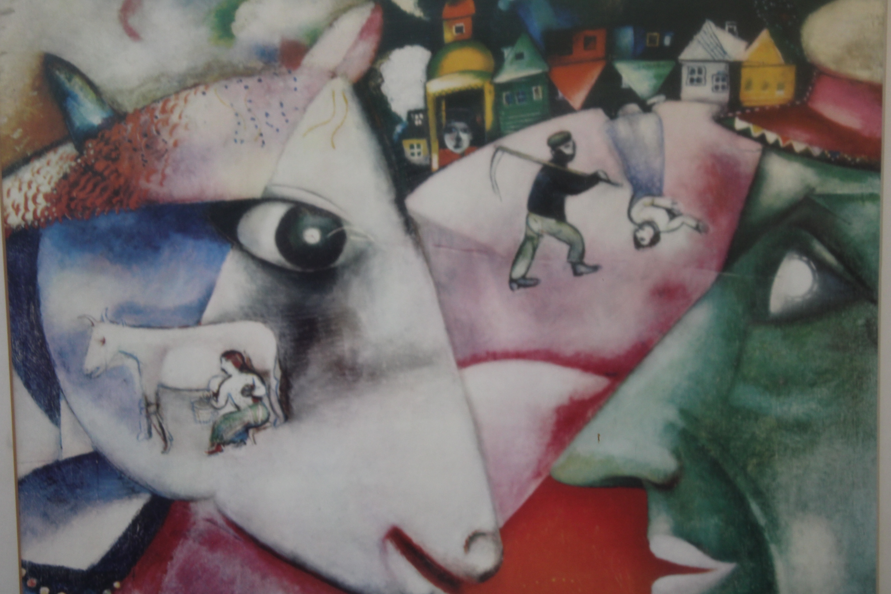 Kunstreproductie van het schilderij ‘Ik en het dorp’, gemaakt in 1911. de schilder schilderde het werk kort nadat hij naar Parijs was verhuisd, geïnspireerd door herinneringen aan zijn jeugd op het platteland van Belarus. In goede staat.