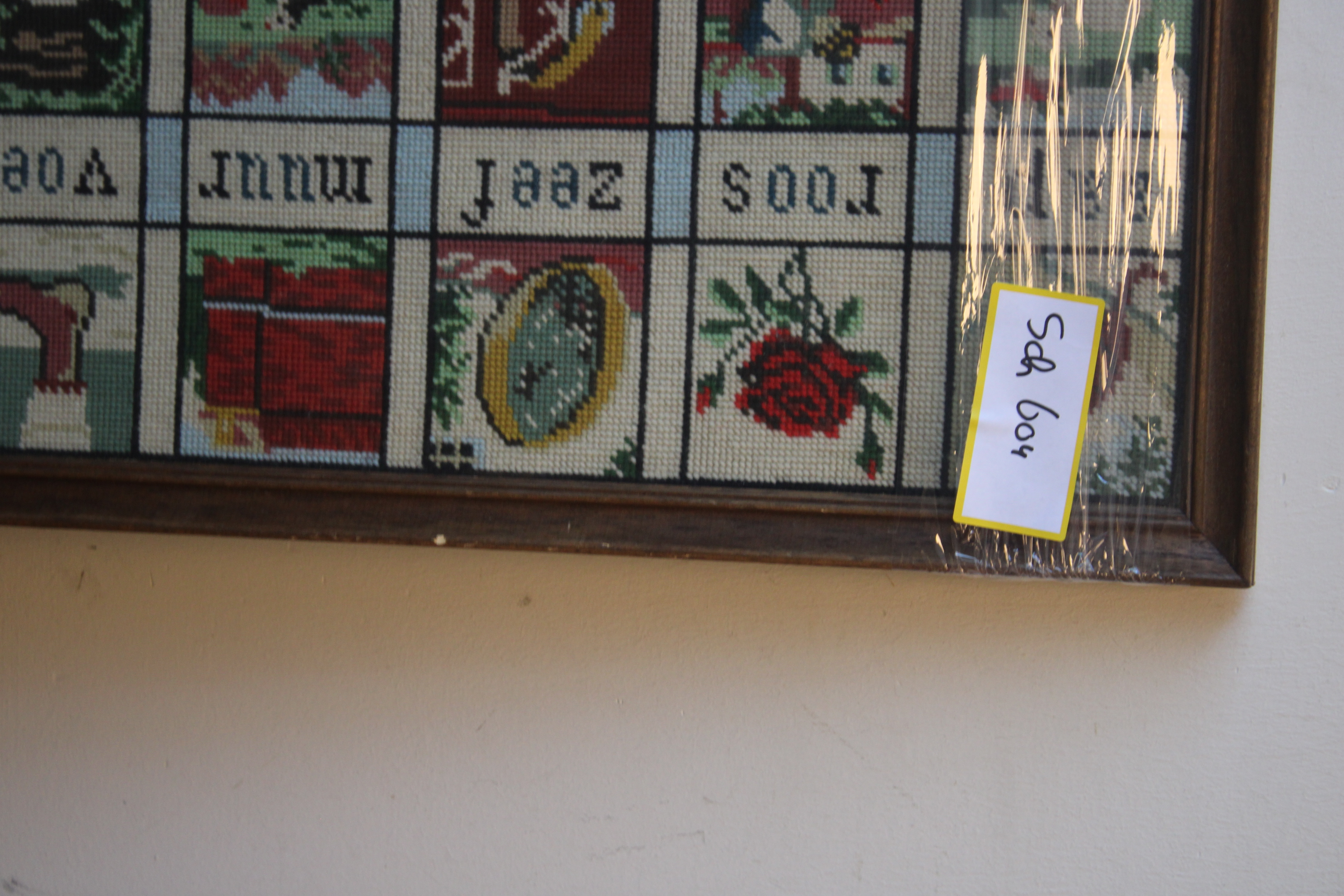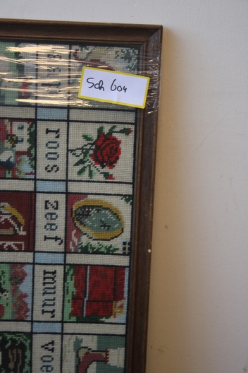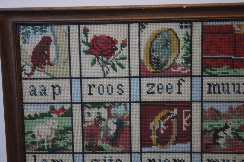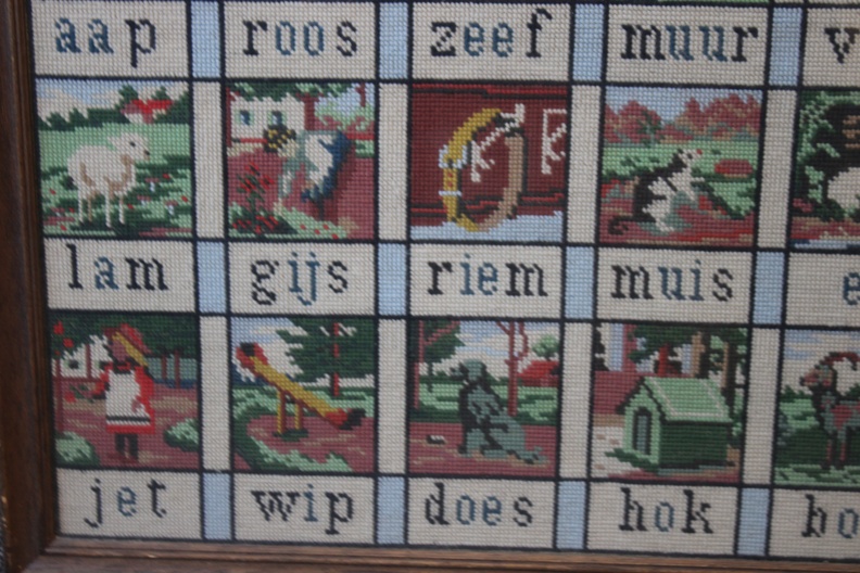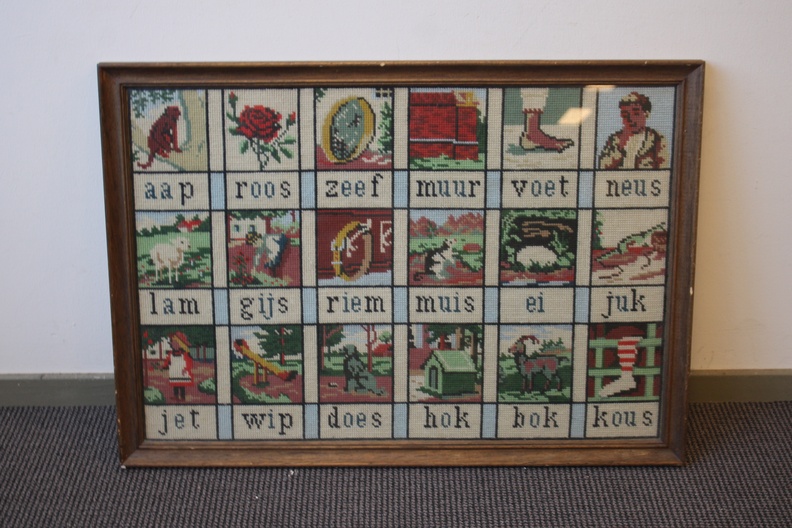 Het ‘Aap, Roos, Zeef’-plankje, een iconisch stukje Nederlands erfgoed dat werd gebruikt om kinderen te leren lezen. Mooi geborduurd en in goede staat.