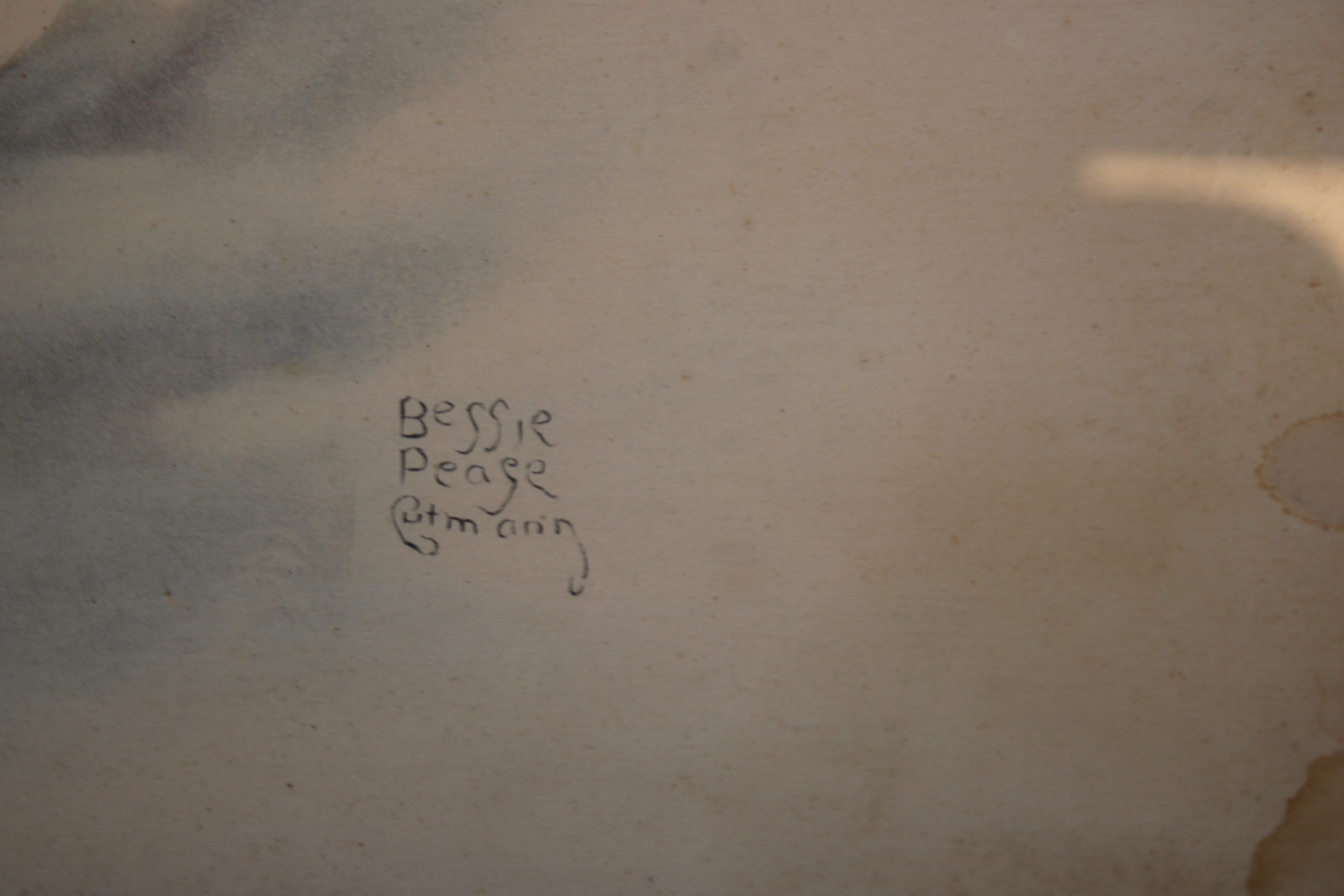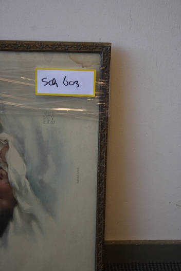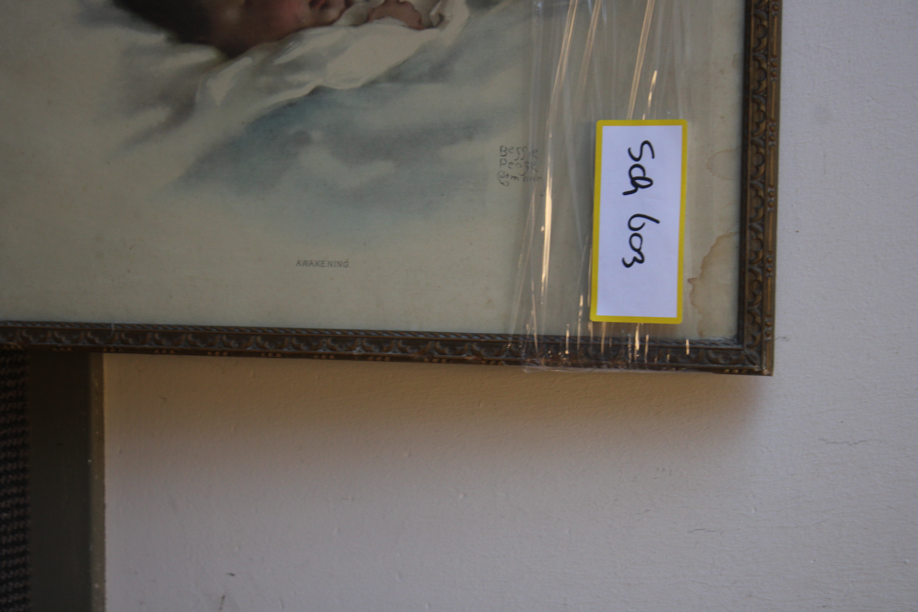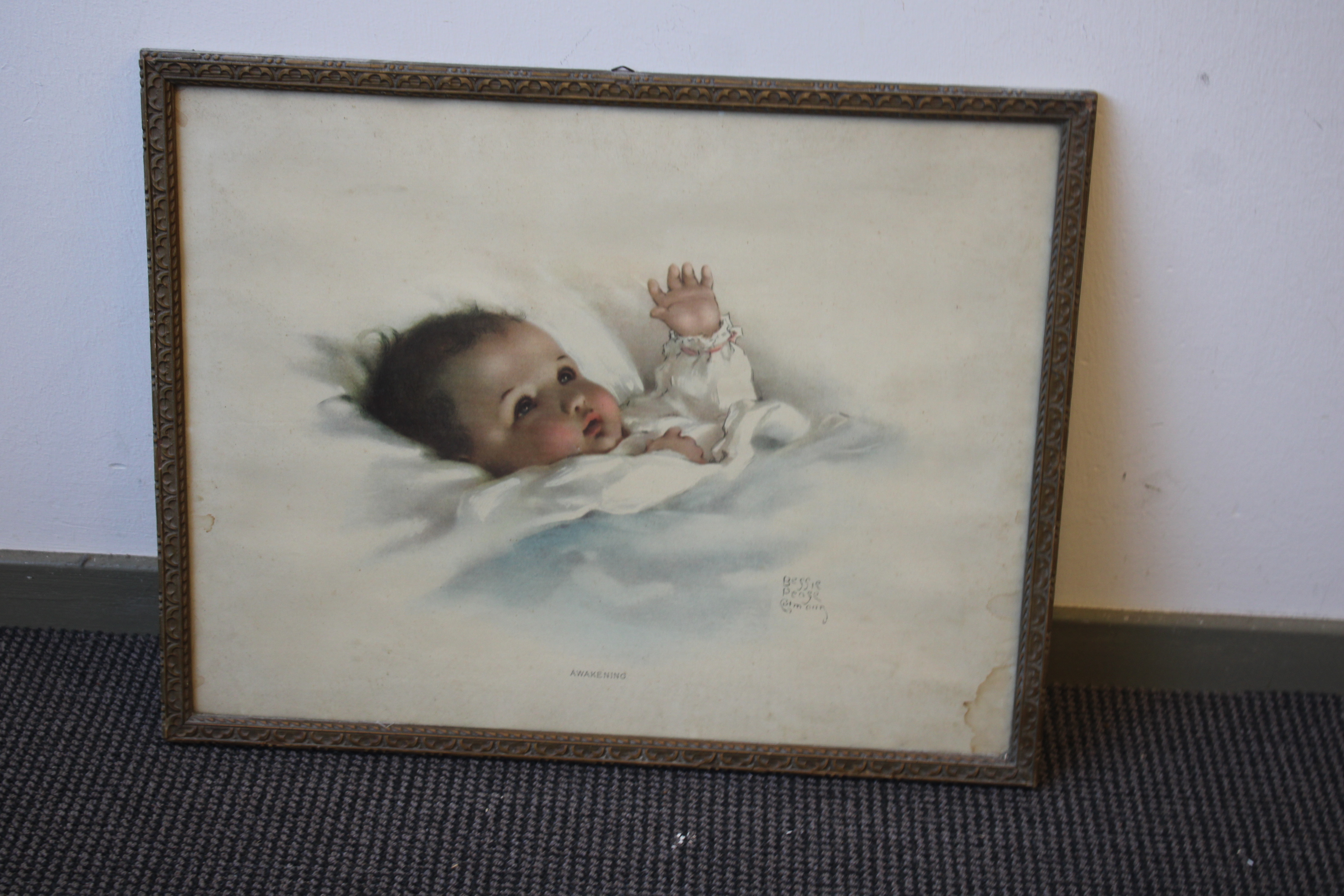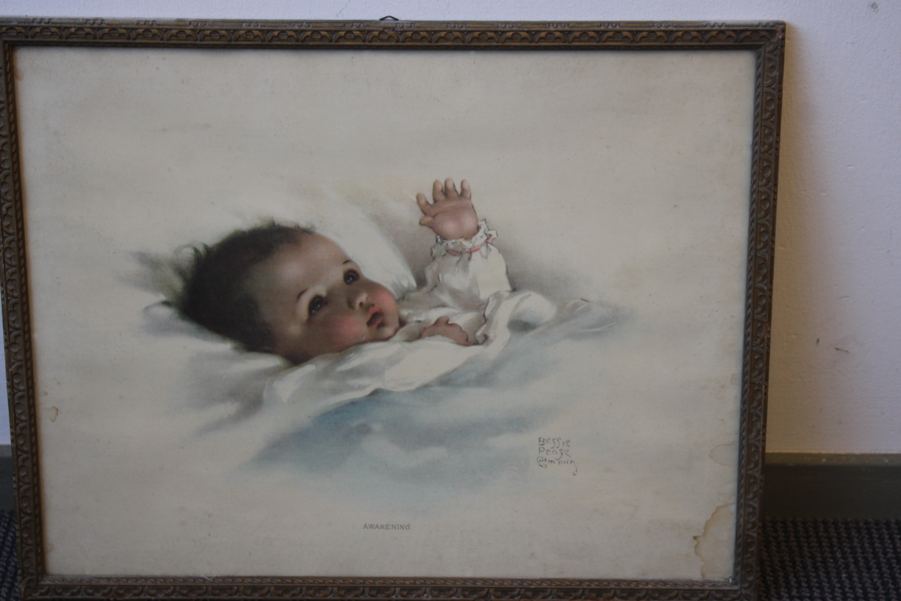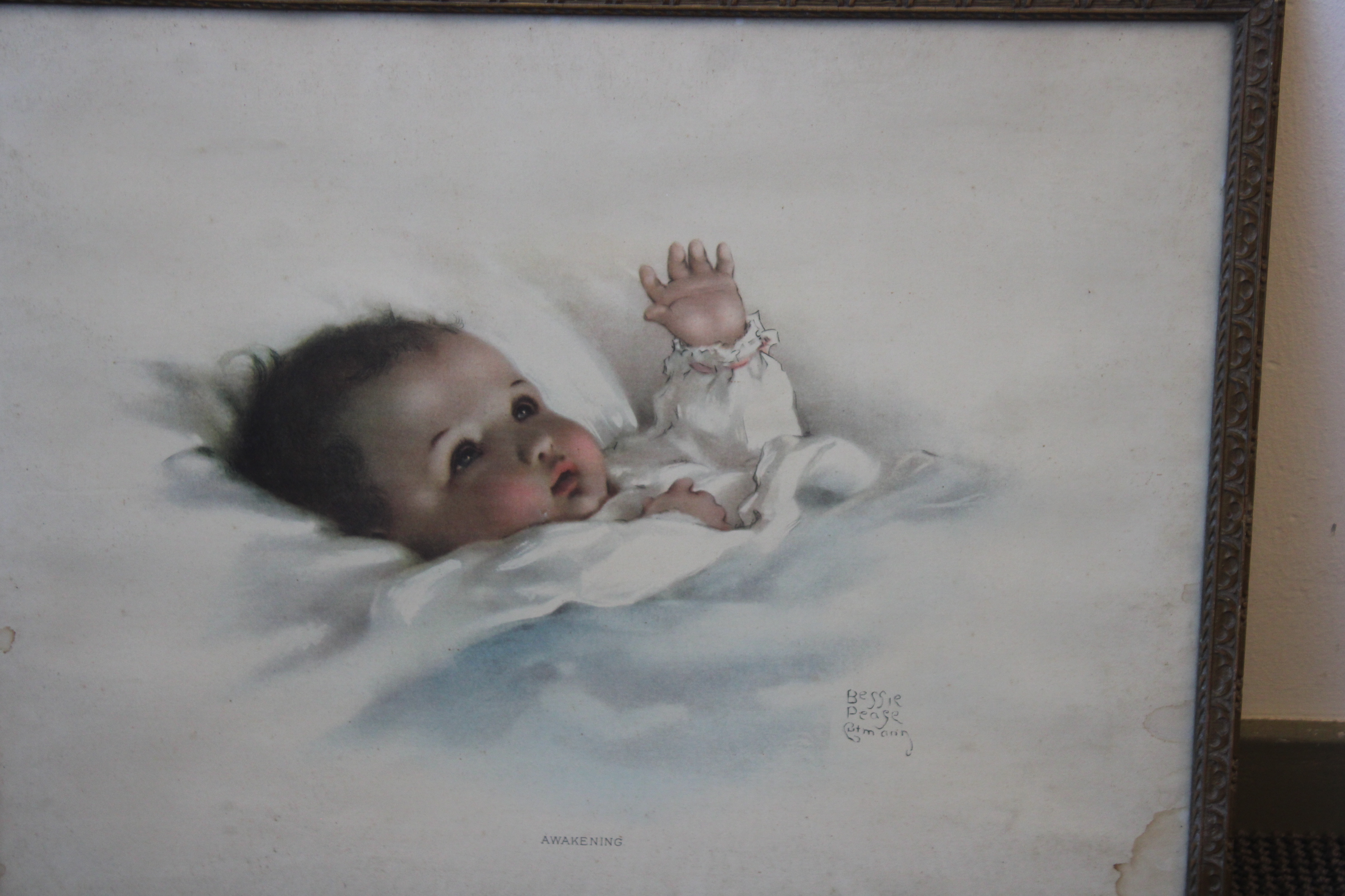 Oude prent van een klein kindje. Van Betsey Peage Cutmarin. Heeft waterschade.