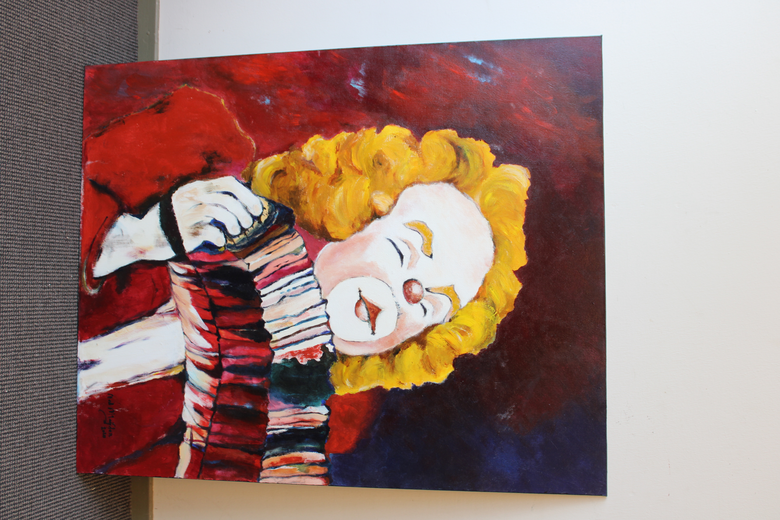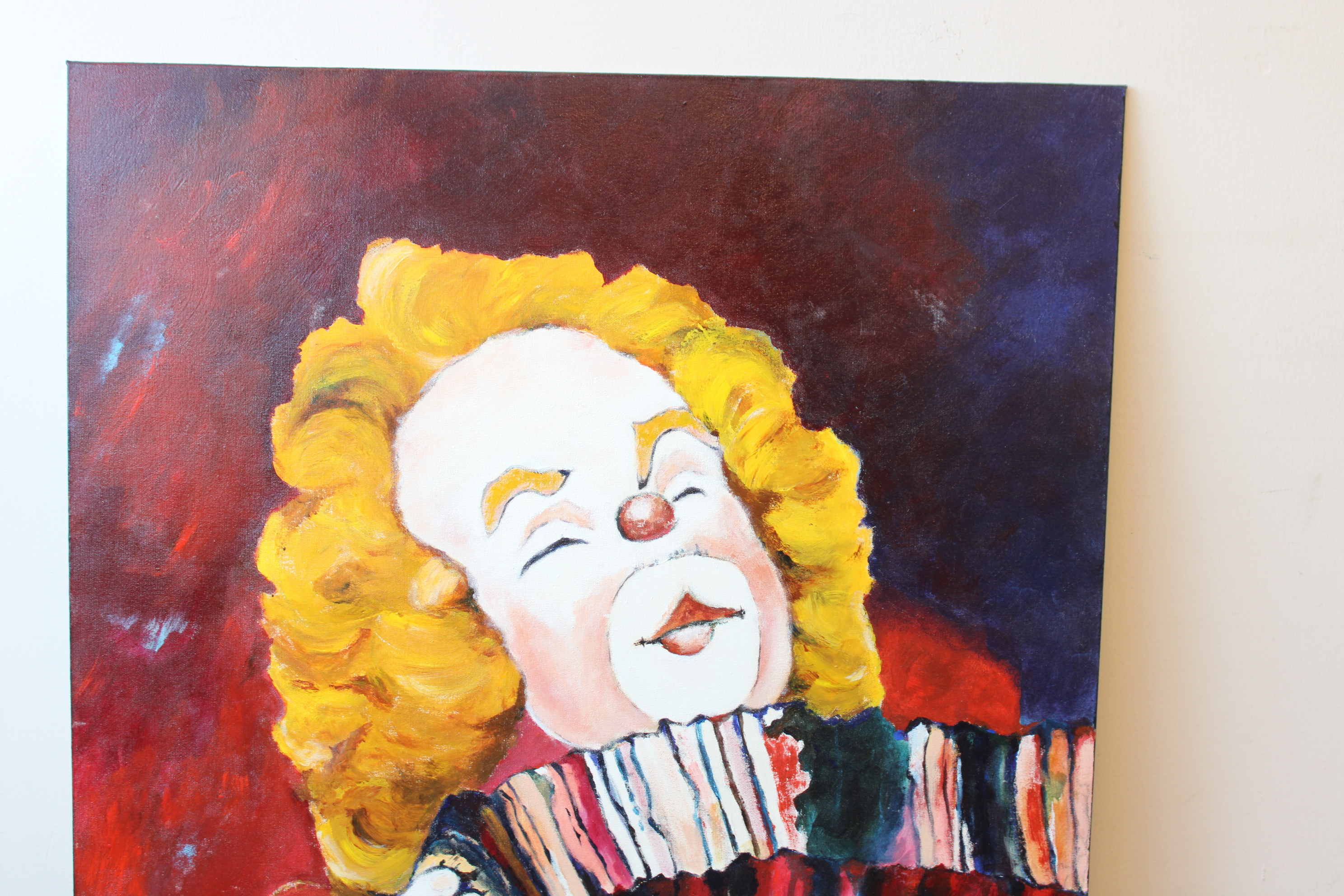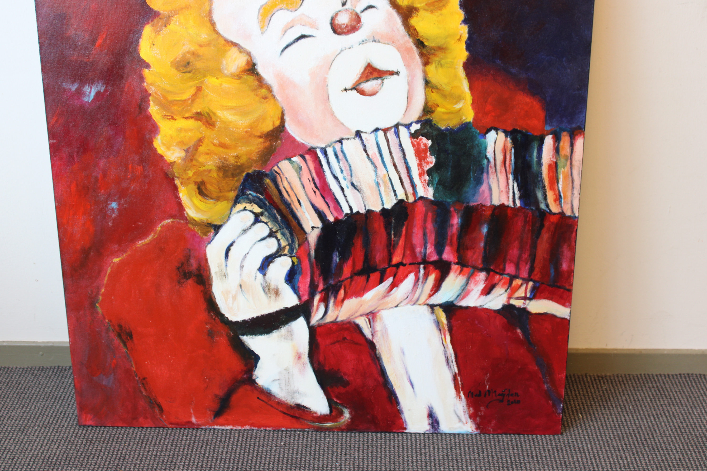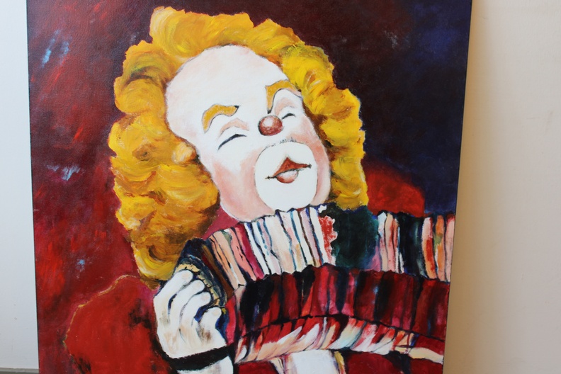 Groot schilderij van N. vd Meyden: Clown met harmonica