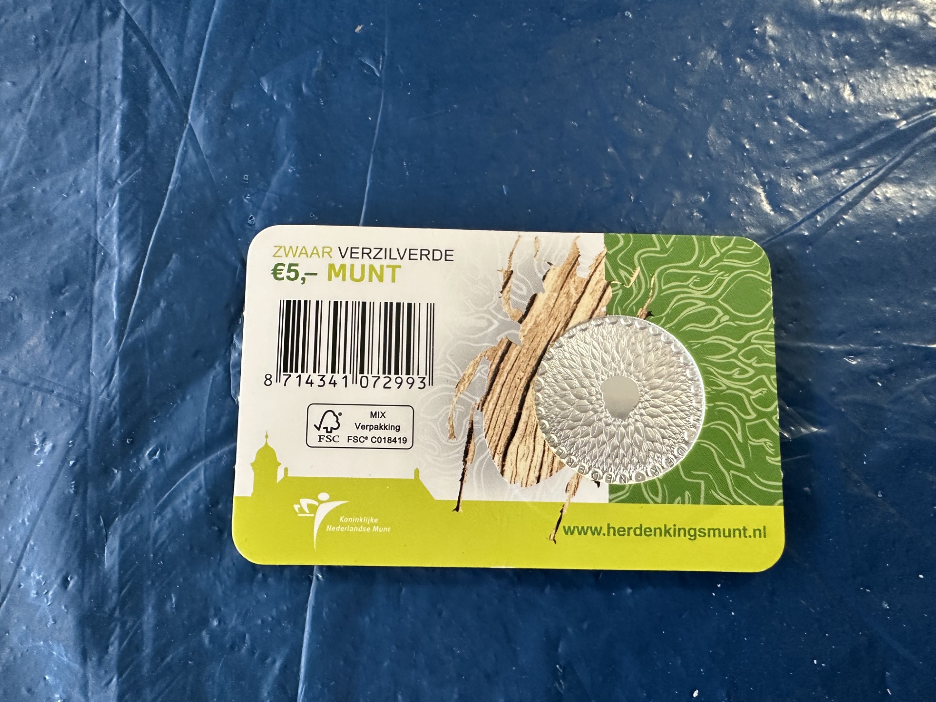 Dit zogenaamde “WNF Vijfje” is een zwaar verzilverde €5 munt, uitgegeven door de Koninklijke Nederlandse Munt. De munt zit nog in de originele uitgifteverpakking (kaart).