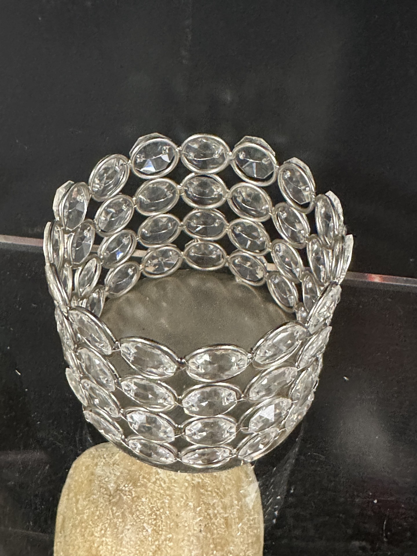 Mooie decoratieve theelichthouder met zilverkleurig metalen frame en rondom ingelegde facetgeslepen kristallen steentjes.