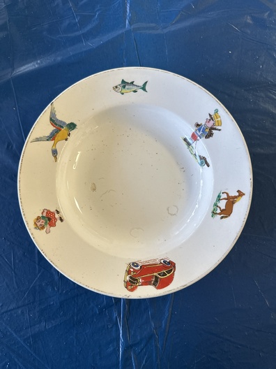 Aangeboden: een vintage kinderschaal / kinderbord van Boch Belgium, uitgevoerd in wit aardewerk met speelse en kleurrijke afbeeldingen zoals dieren, een auto en kinderfiguurtjes. Een charmant en herkenbaar ontwerp dat direct doet denken aan vroeger.