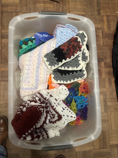Grote plastic opbergkist gevuld met gehaakte items in verschillende kleuren, patronen en formaten. De inhoud bestaat uit diverse handgemaakte haakwerken, waaronder dekentjes, lapjes, motieven en andere textiele stukken. De exacte samenstelling, aantallen en toepassingen zijn onbekend.