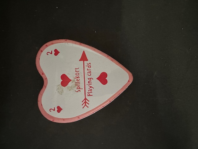 Te koop: een schattig hartvormig setje speelkaarten in een stevig metalen blikje (Spillekort / Playing Cards).