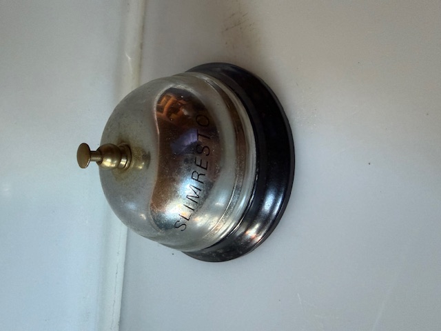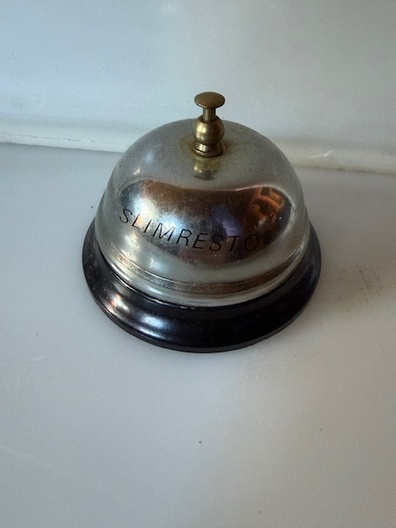 Deze klassieke servicebel is uitgevoerd in metaal met een zwarte onderzijde. Op de bovenzijde staat de tekst Slimresto. De bel is voorzien van een drukknop aan de bovenkant en geeft bij indrukken een duidelijk hoorbaar signaal (werking niet getest).