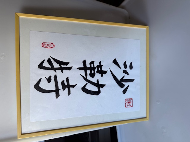 Het werk toont meerdere grote penseelkarakters in zwarte inkt, aangebracht in traditionele kalligrafiestijl. Daarnaast zijn er rode zegelstempels zichtbaar, wat kenmerkend is voor Chinese of Japanse kalligrafie.