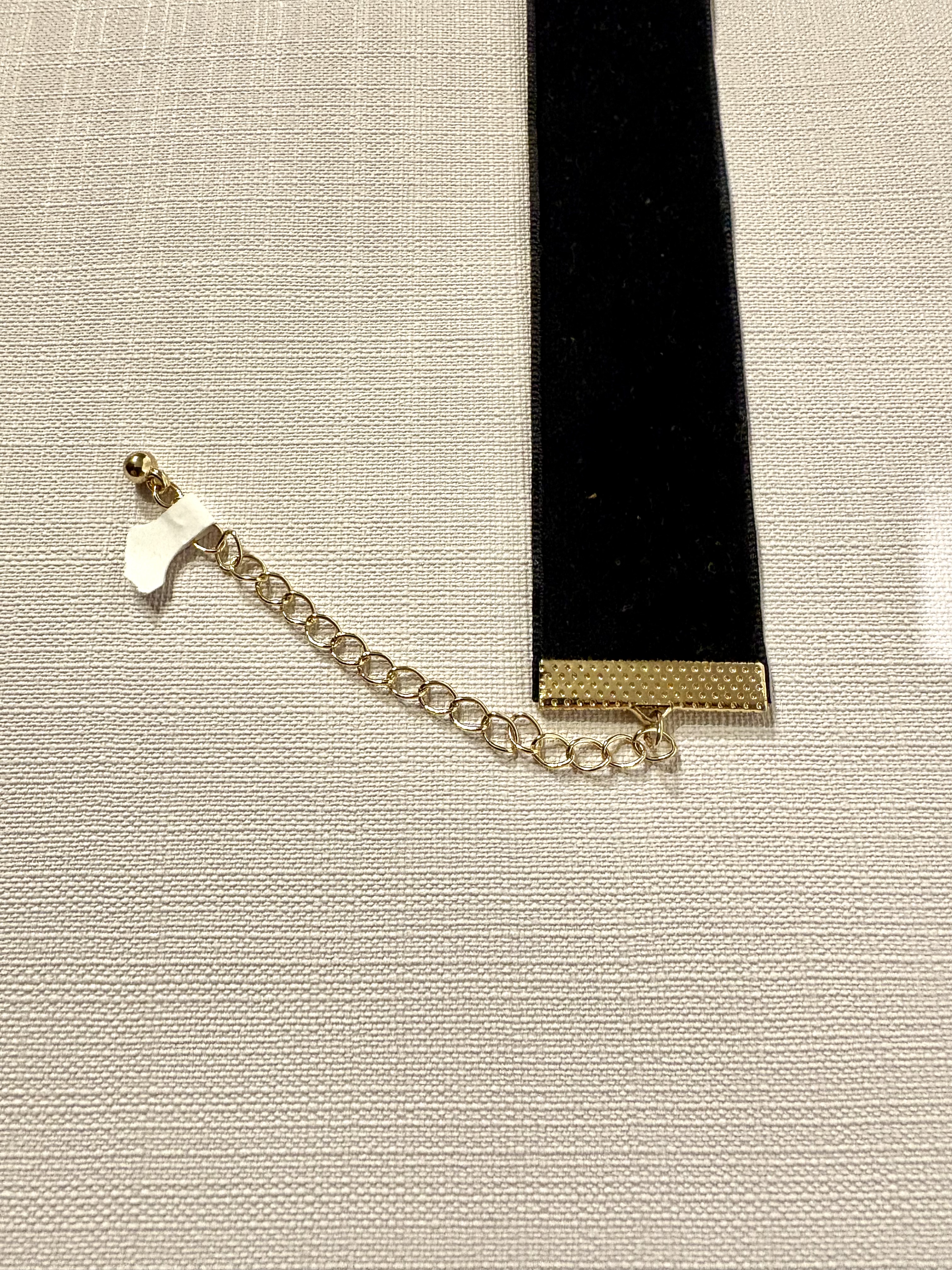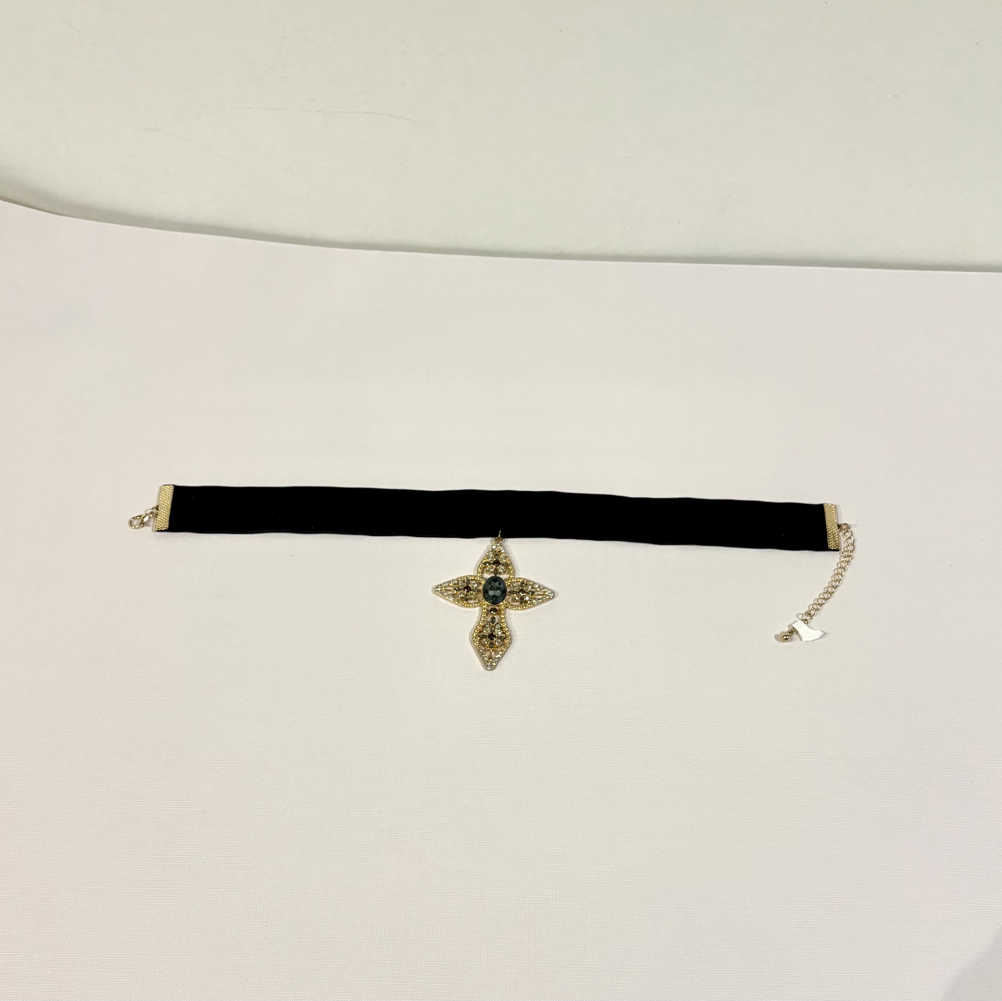 Een zwarte fluwelen choker met een versierde kruis