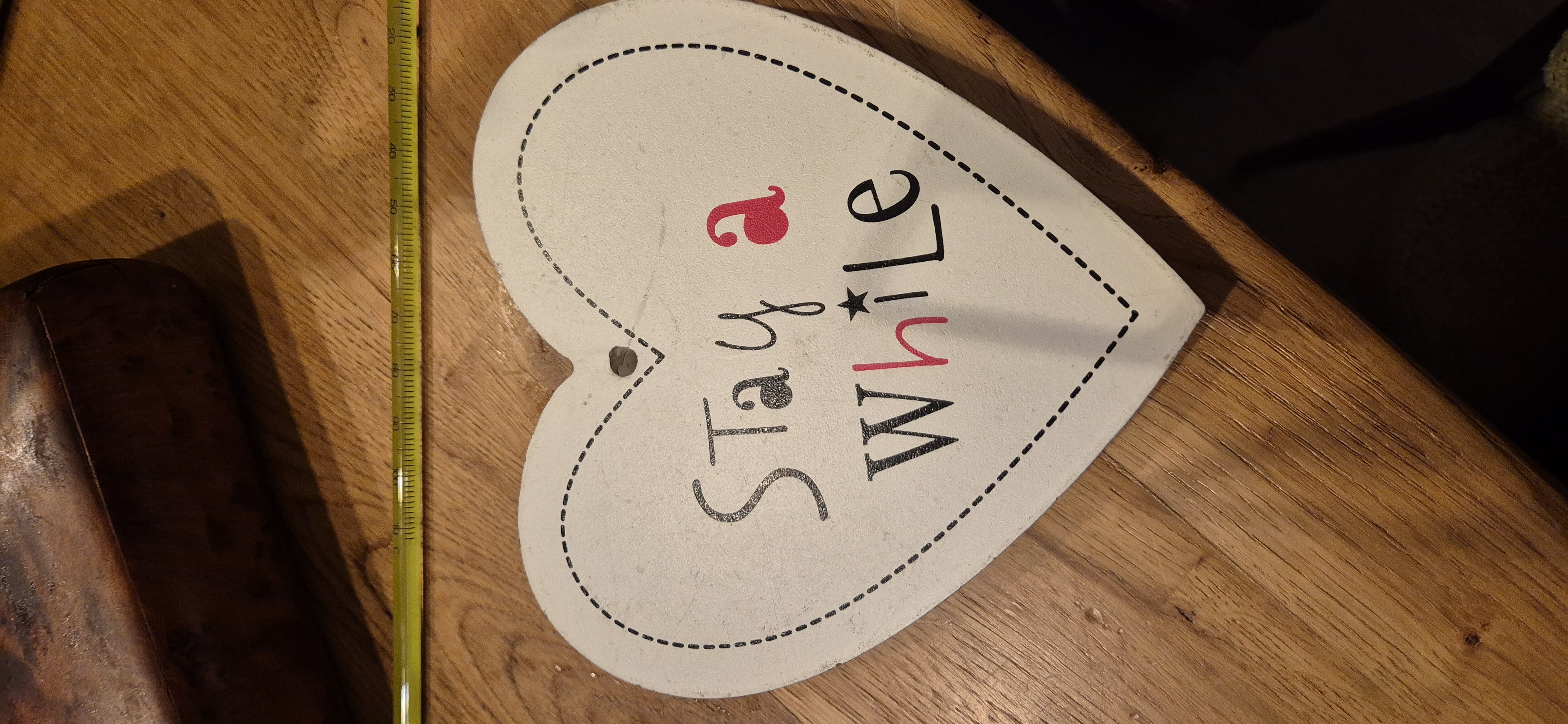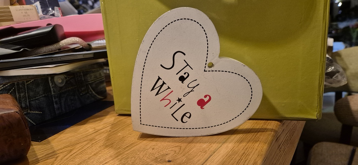 houten deco hart met de tekst stay a while