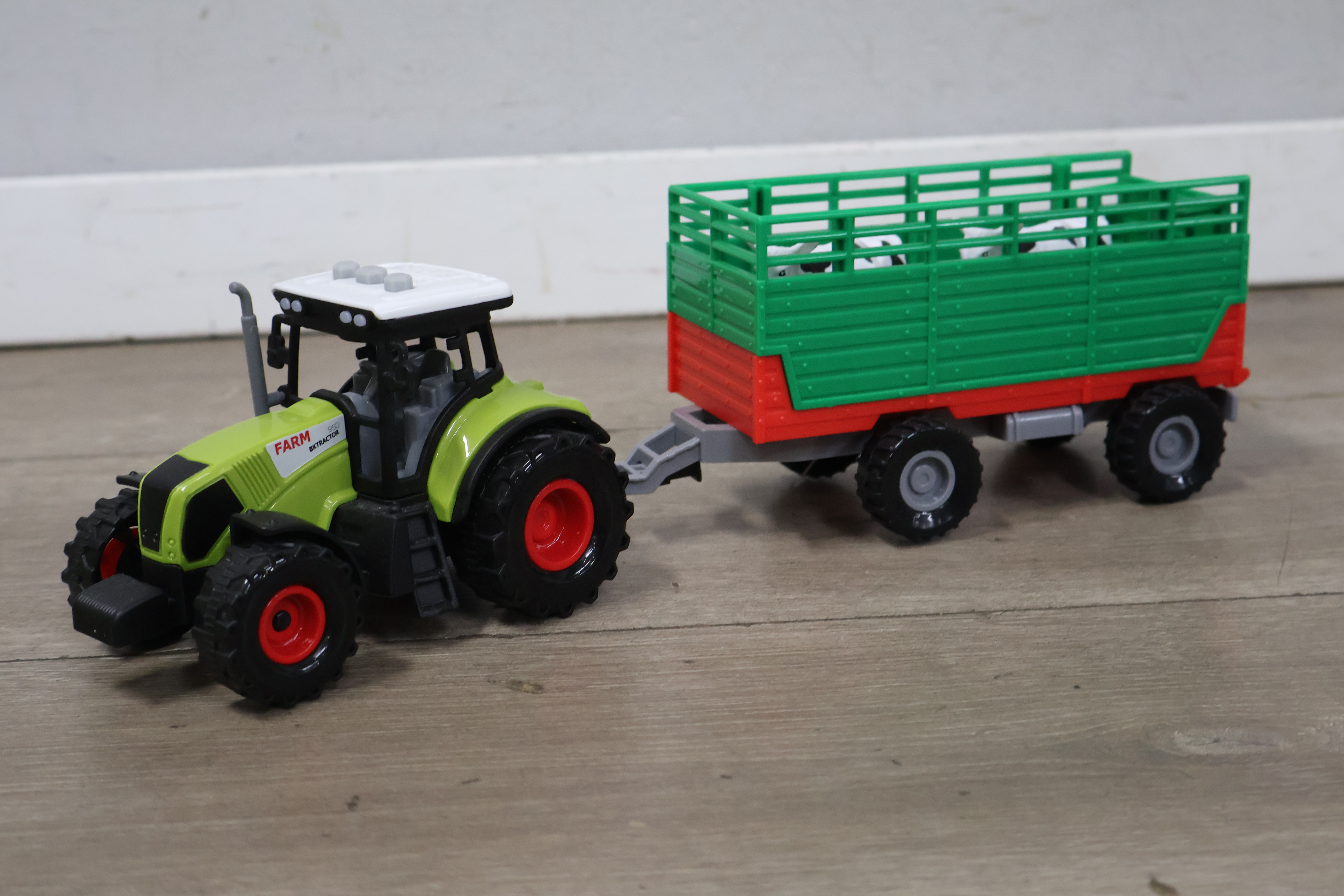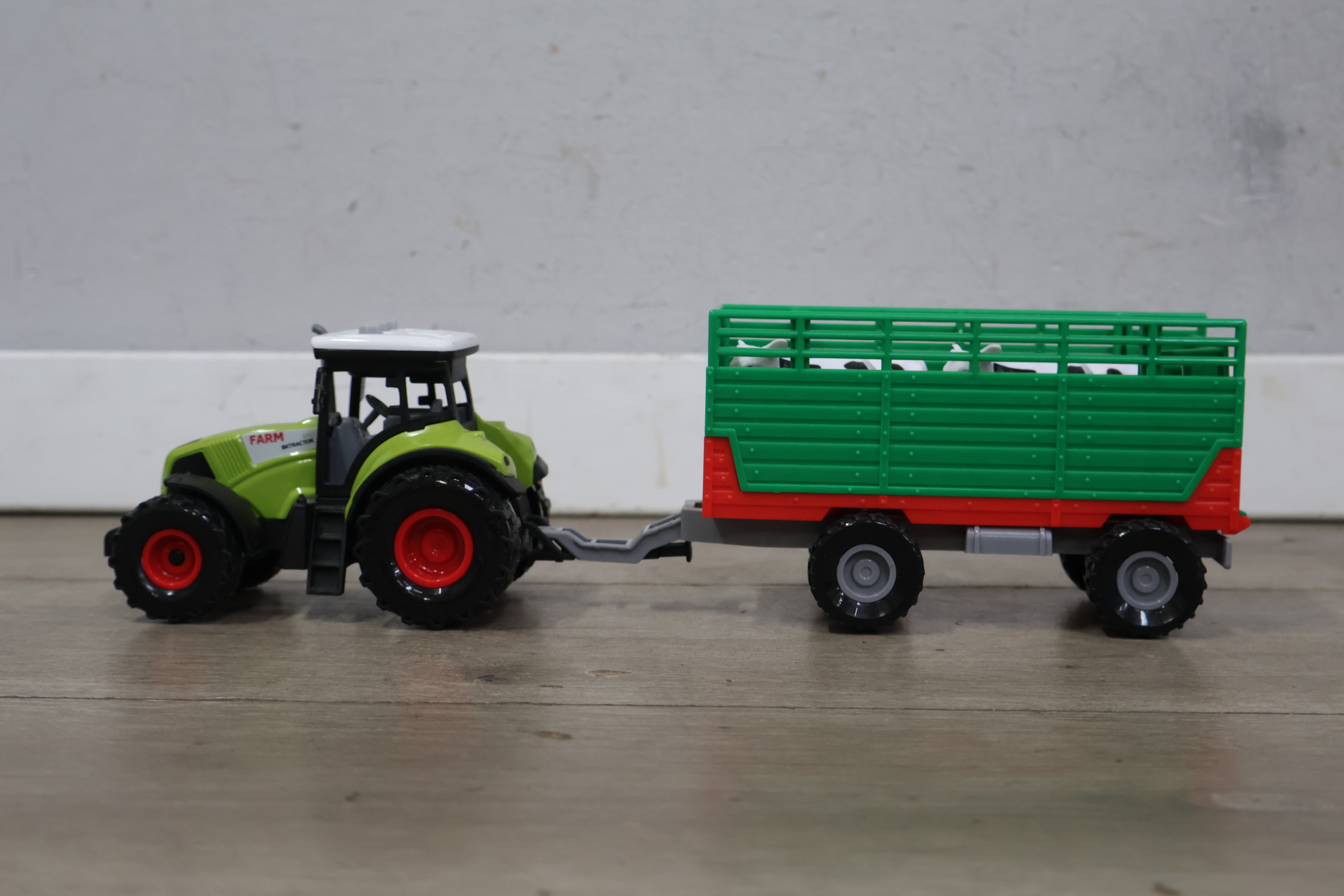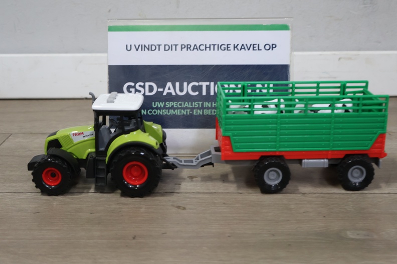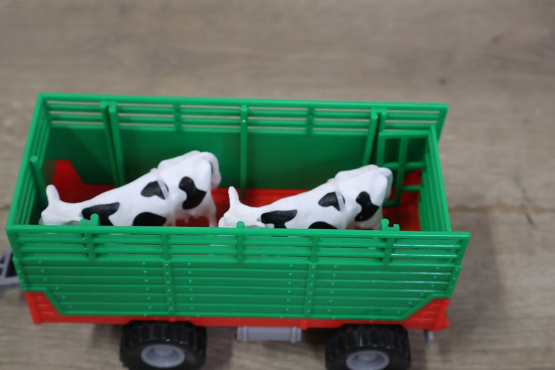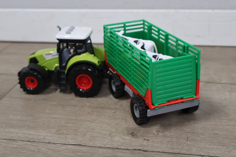 Tractor met aanhangwagen en 2 koeien