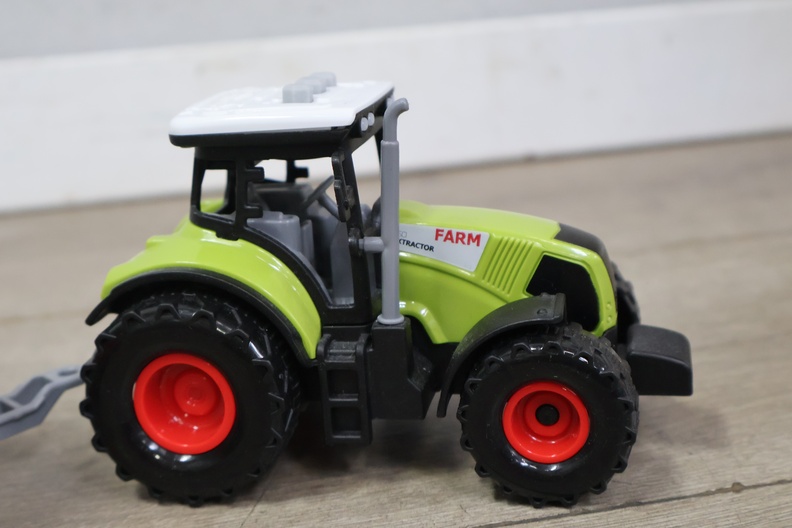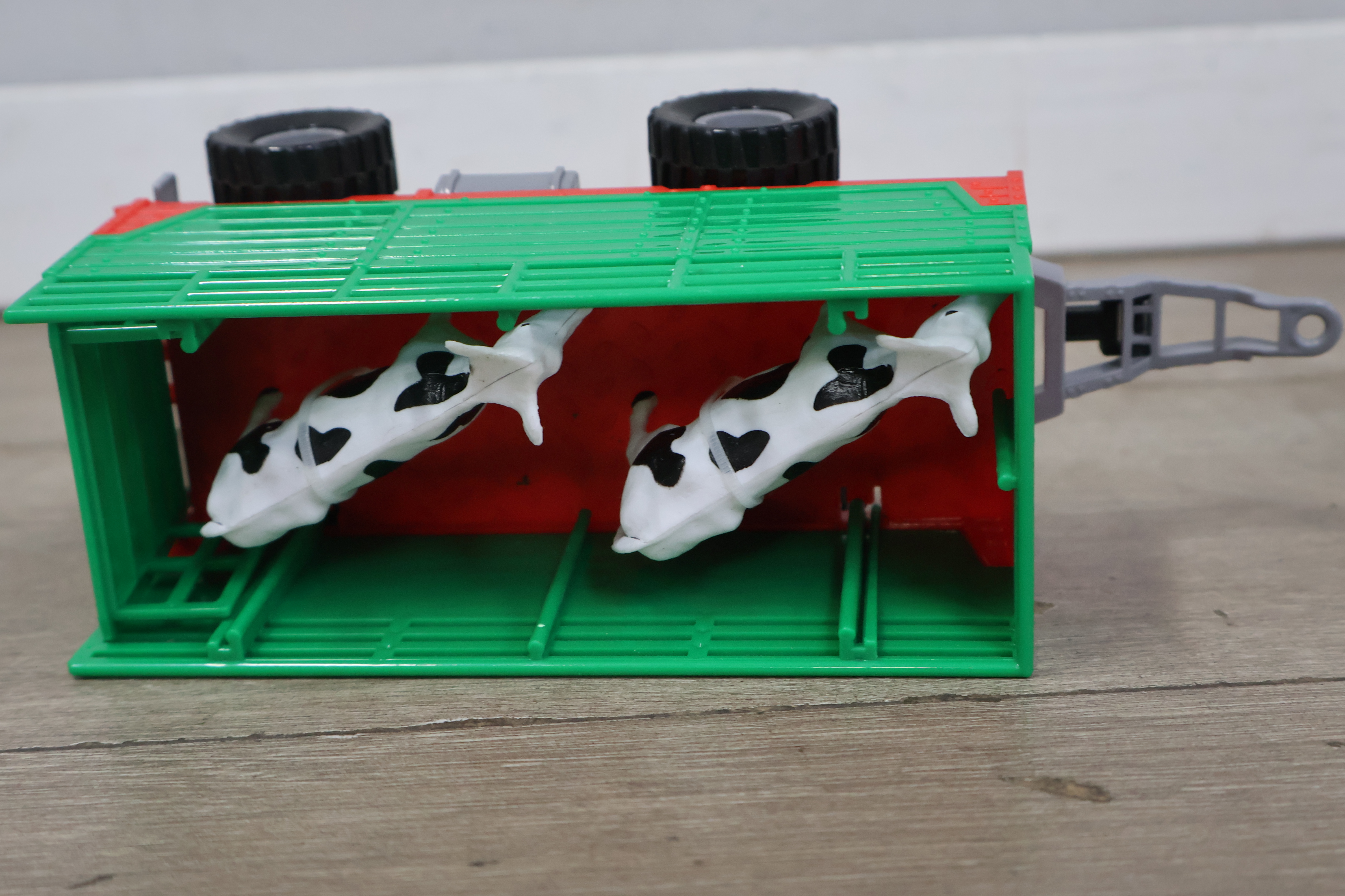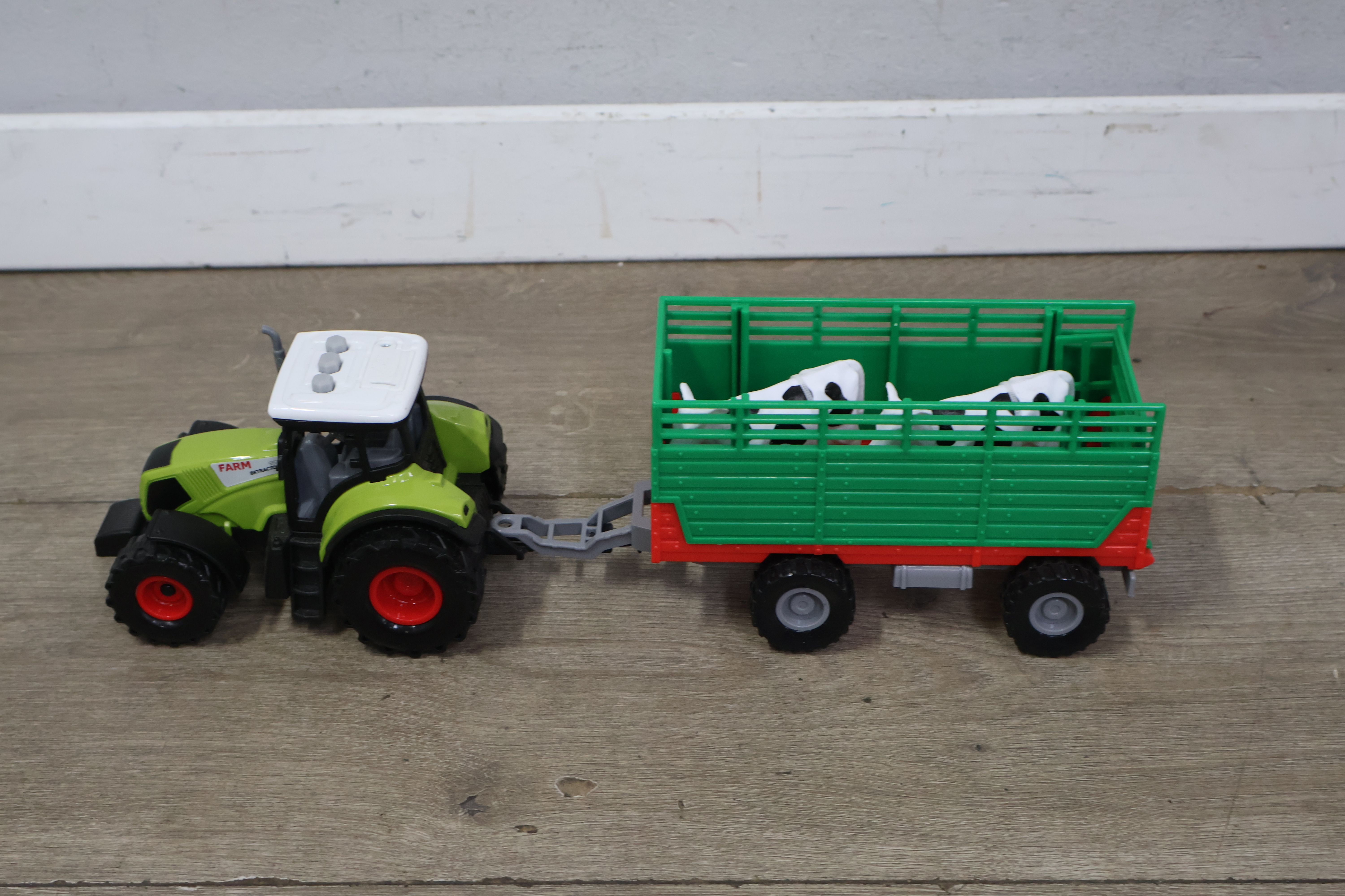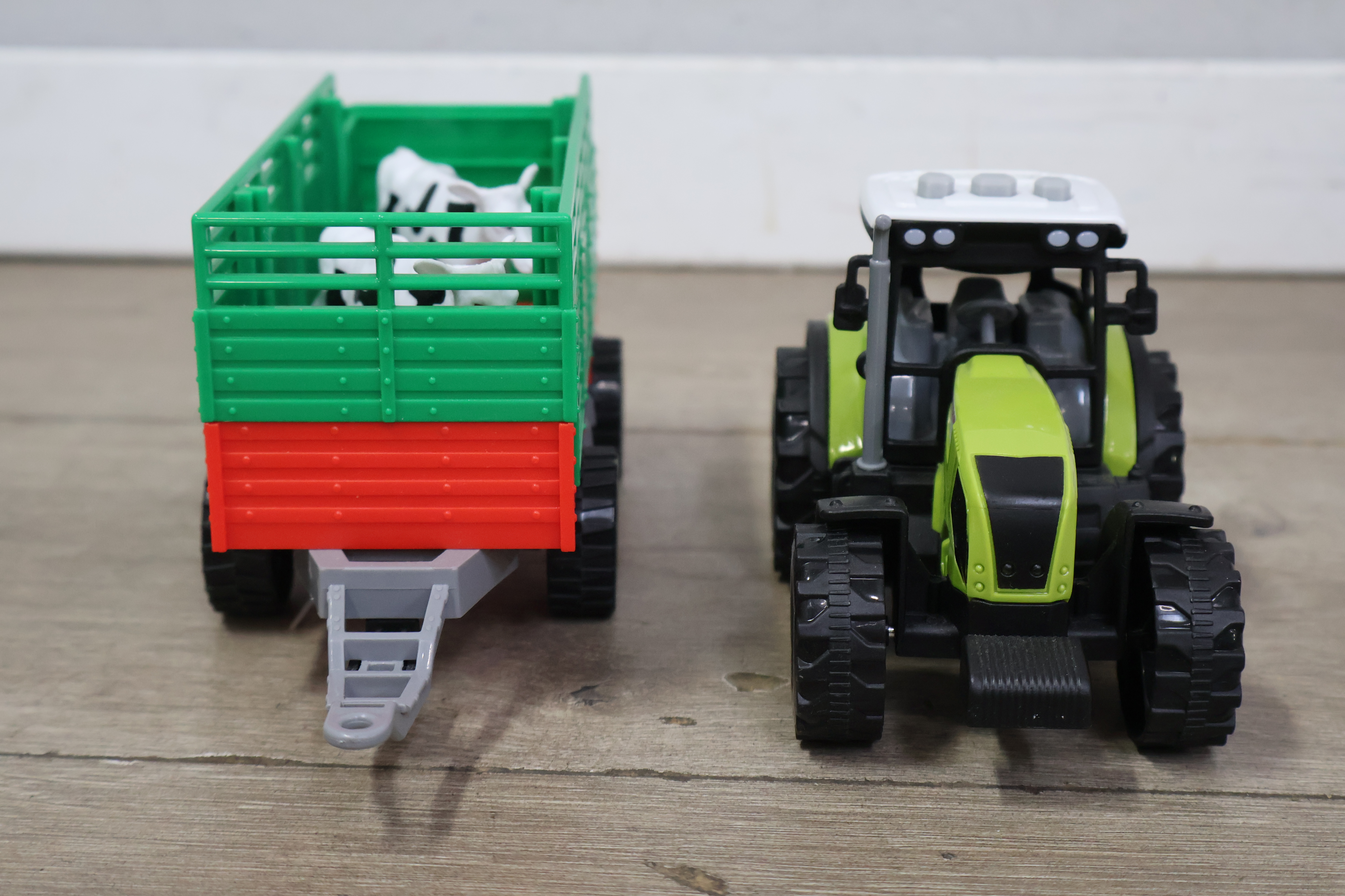 Tractor met aanhangwagen en 2 koeien
