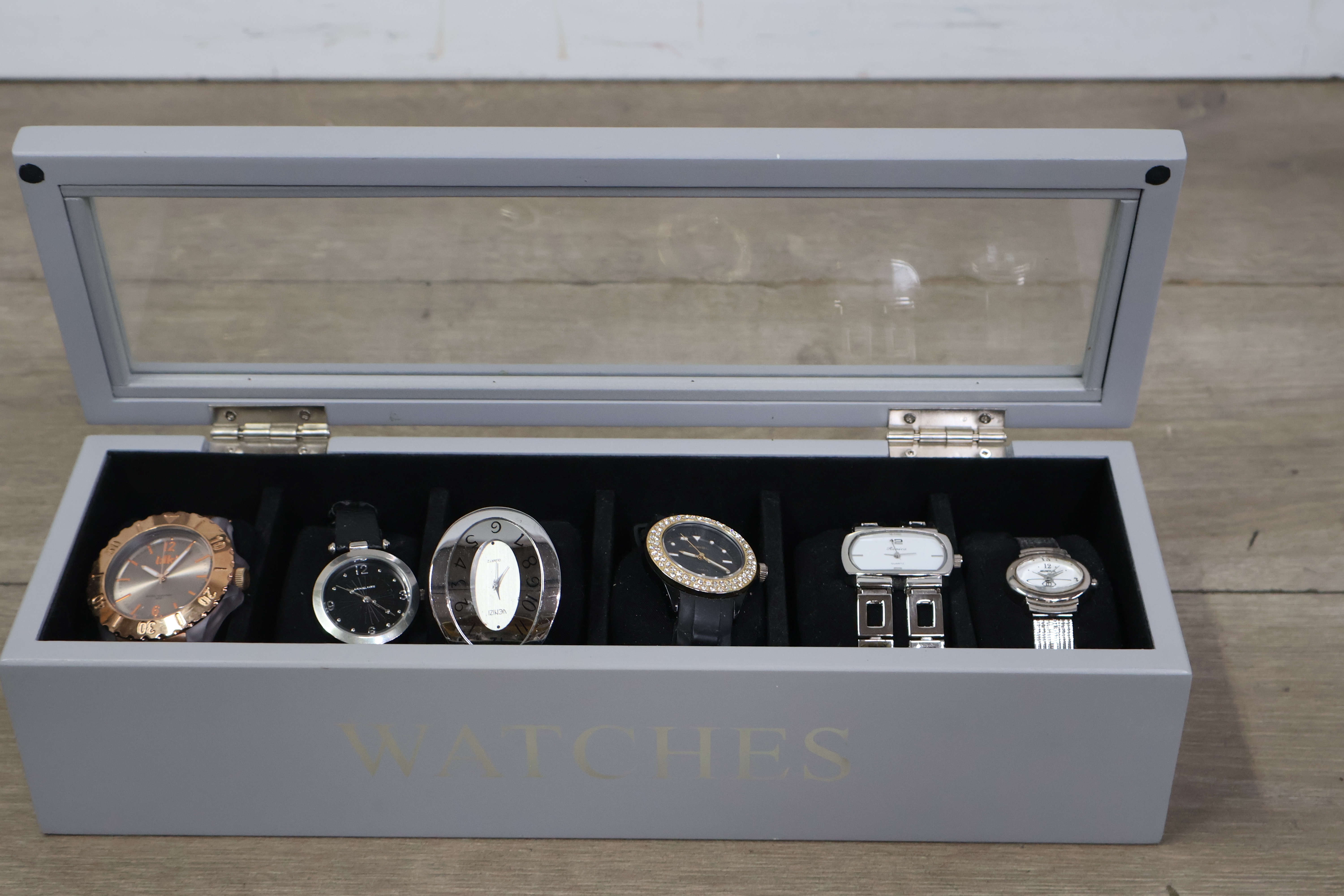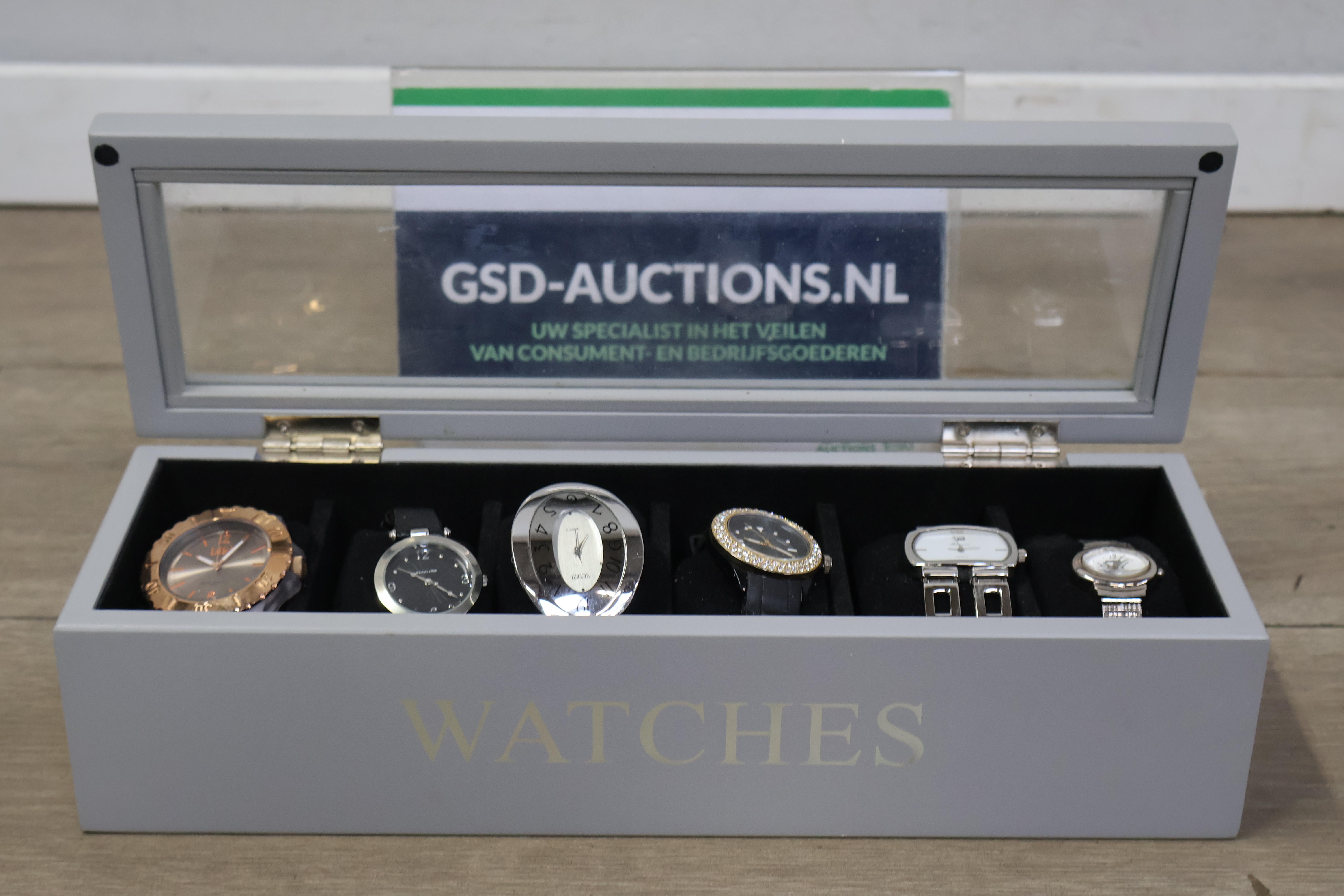 Mix van 6 horloges in een horlogekist